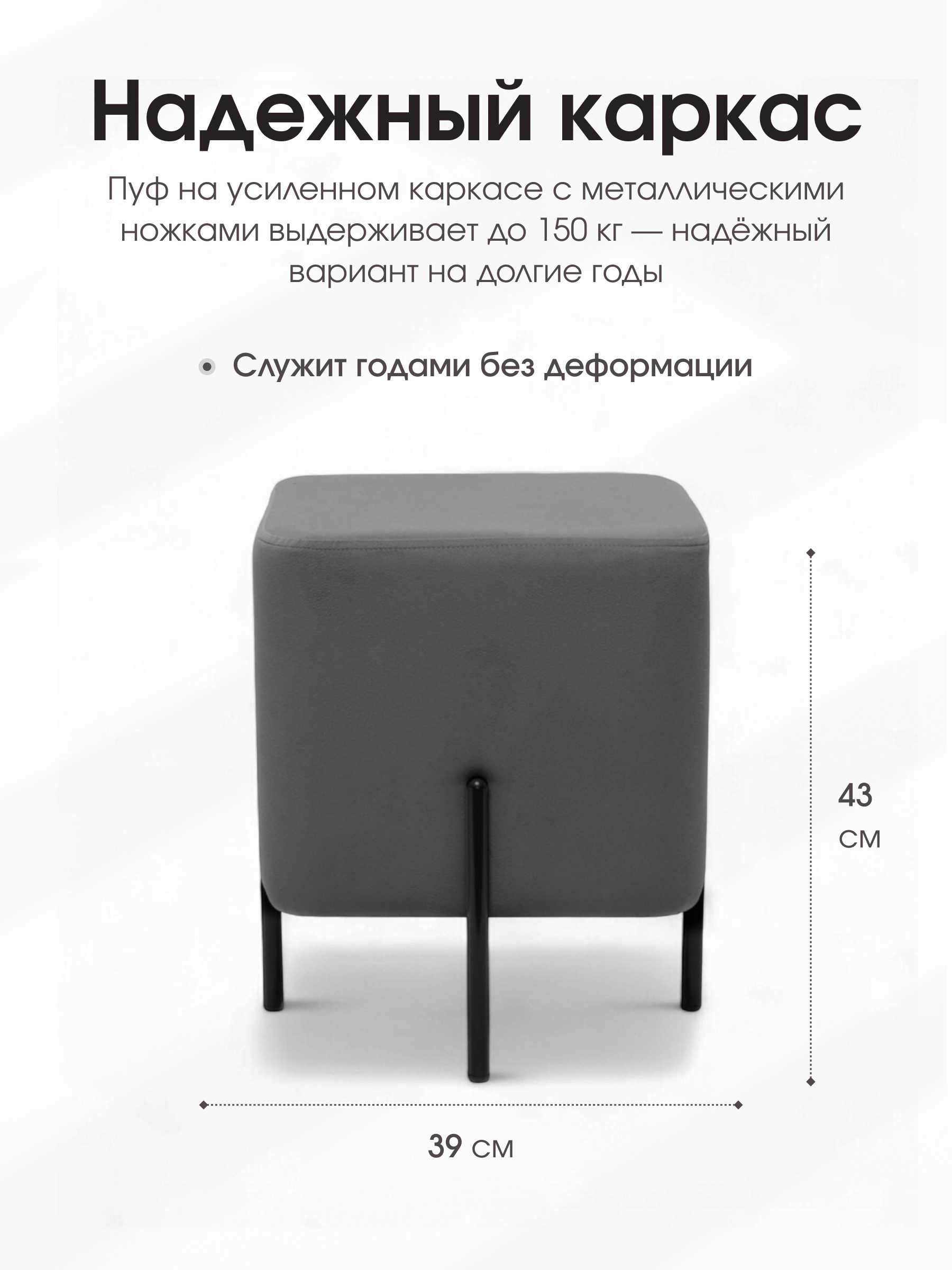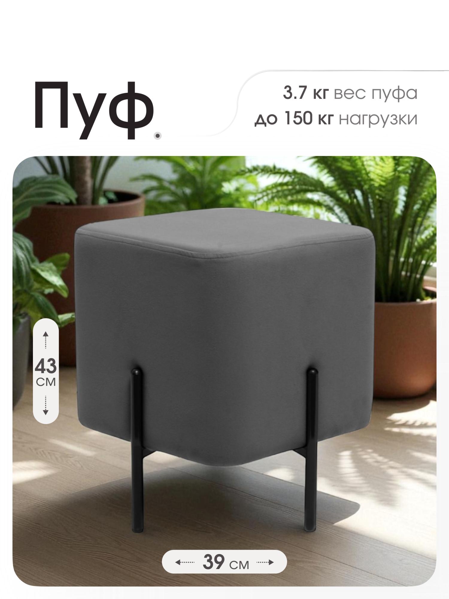 Пуф «Аликанте» - находка для ценителей минимализма. Габариты: Длина: 39 см Ширина: 39 см Высота: 43 см Квадратный пуфик выполнен из прочного ДСП высокого качества, выдерживает максимальную нагрузку в 150 кг. Пуф обтянут приятной велюровой тканью, которая легко чистится влажной губкой. Внутри плотный поролон, который сохраняет свою форму при длительной эксплуатации. Пуф стоит на четырёх металлических ножках, со специальными заглушками, которые позаботятся о Вашем напольном покрытии. Помимо прямого предназначения можно использовать как подставку для ног. Высокое качество материалов, из которых изготовлена модель, способствуют сохранению ее первозданного вида на протяжении очень длительного времени. На выбор четыре расцветки: бежевый, серый, коричневый и синий. Современная модель подойдёт не только для дома, но и для кафе, кофейни и ресторана. На данный товар распространяется гарантия 12 месяцев. Поставляются пуфы в гофрокоробе.