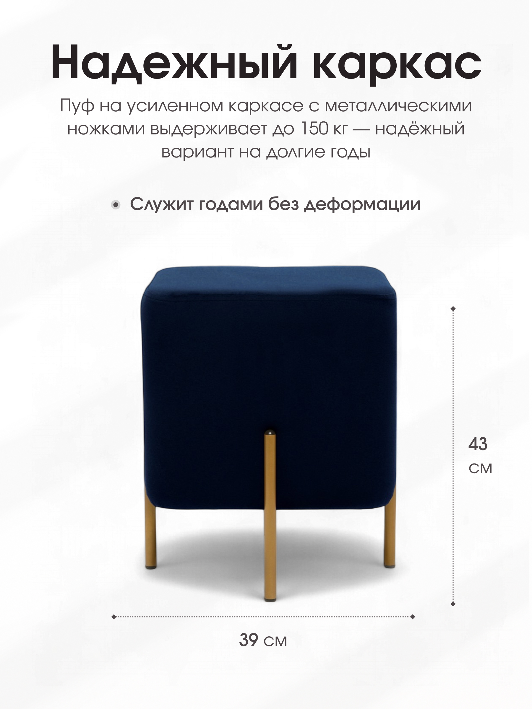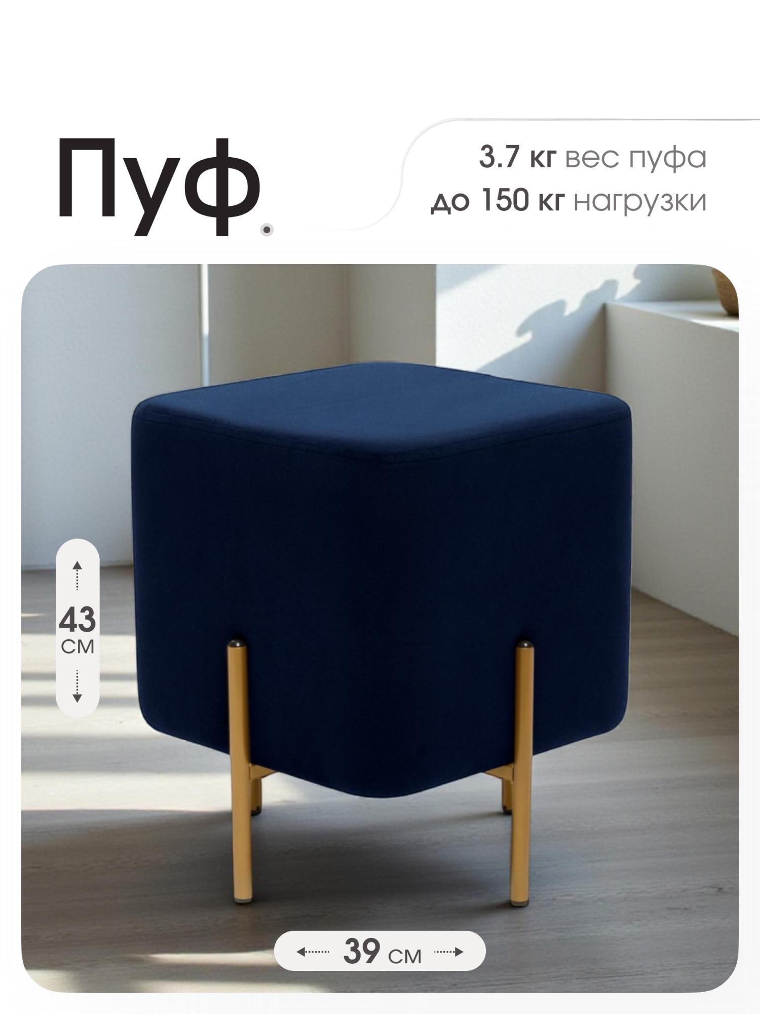 Пуф «Аликанте» - находка для ценителей минимализма. Габариты: Длина: 39 см Ширина: 39 см Высота: 43 см Квадратный пуфик выполнен из прочного ДСП высокого качества, выдерживает максимальную нагрузку в 150 кг. Пуф обтянут приятной велюровой тканью, которая легко чистится влажной губкой. Внутри плотный поролон, который сохраняет свою форму при длительной эксплуатации. Пуф стоит на четырёх металлических ножках, со специальными заглушками, которые позаботятся о Вашем напольном покрытии. Помимо прямого предназначения можно использовать как подставку для ног. Высокое качество материалов, из которых изготовлена модель, способствуют сохранению ее первозданного вида на протяжении очень длительного времени. На выбор четыре расцветки: бежевый, серый, коричневый и синий. Современная модель подойдёт не только для дома, но и для кафе, кофейни и ресторана. На данный товар распространяется гарантия 12 месяцев. Поставляются пуфы в гофрокоробе.