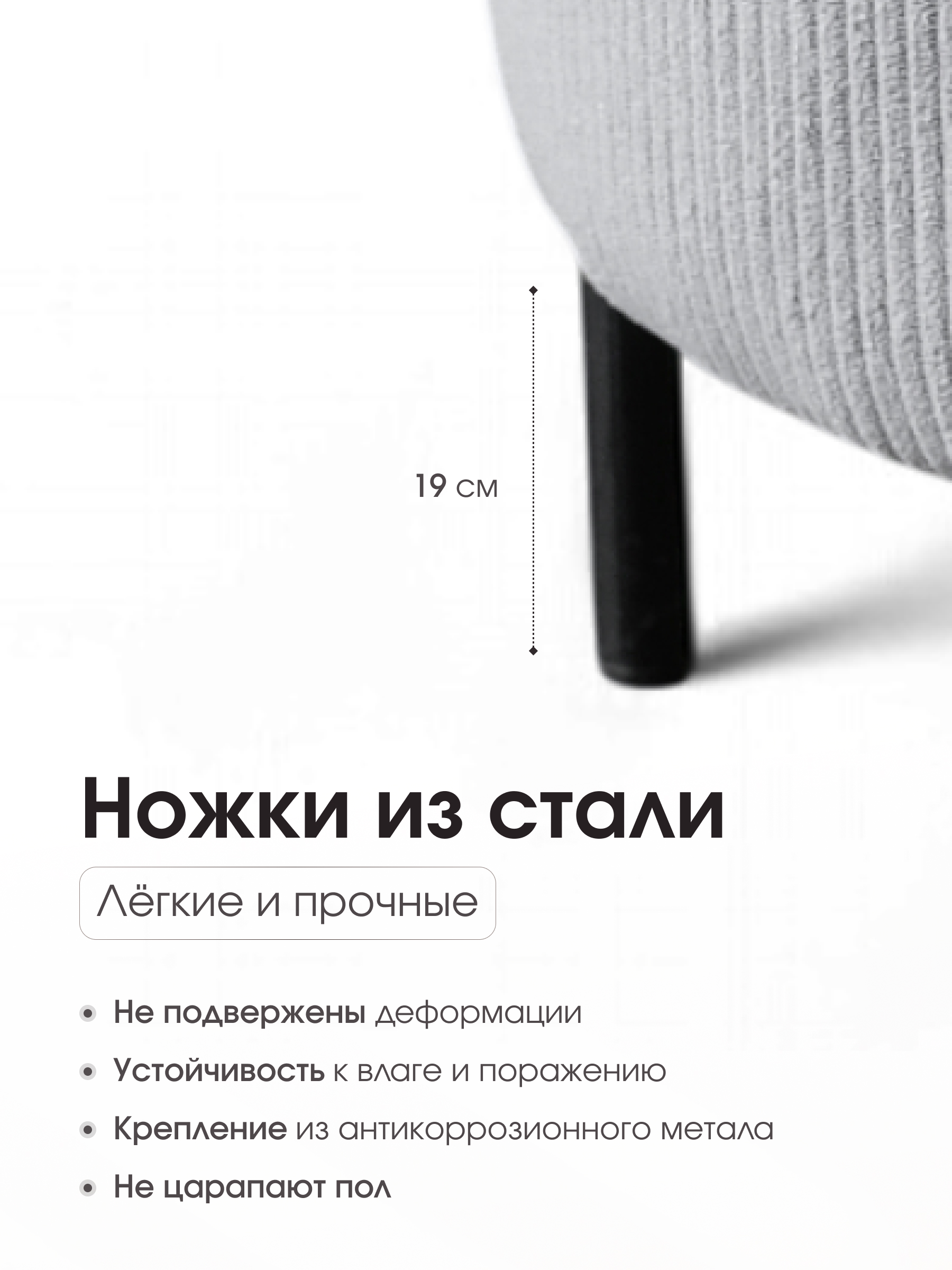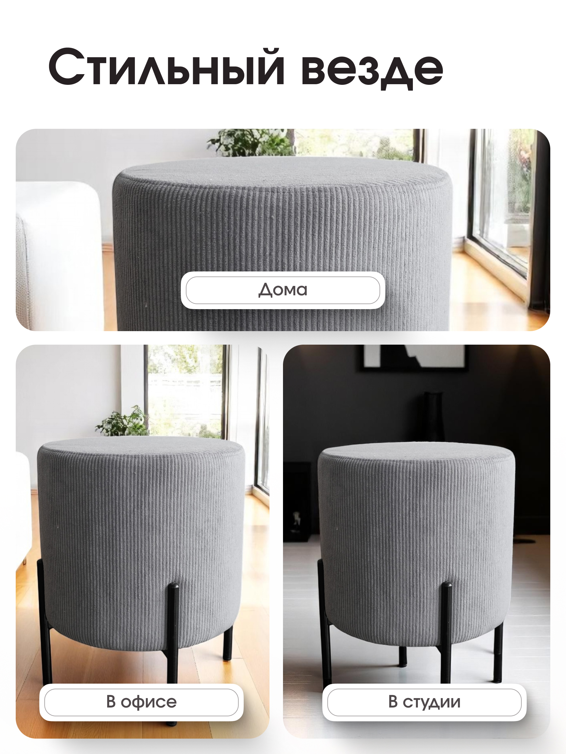 Пуф Gloria Круглый из велюра – стильный и прочный пуфик для прихожей и гостиной. Ищете универсальный пуф, который будет сочетать комфорт, прочность и стиль? Пуф Gloria Круглый из ткани Linea Media – идеальное решение для вашей прихожей, гостиной или спальни. С размерами 36×36×43 см он удобно вписывается в интерьер прихожей, добавляя уюта и функциональности. Обивка пуфа из плотного текстурного велюра выглядит элегантно и при этом устойчива к истиранию. Материал мягкий на ощупь, но при этом устойчивый к истиранию. Ножки пуфа выполнены из легкой и прочной стали, что делает его устойчивым и долговечным. Почему стоит выбрать пуф Gloria от фабрики Dreambag? - Универсальность – пуфик отлично подходит как для прихожей, так и для гостиной. - Прочность и надежность – пуф выдерживает до 150 кг, а стальные ножки обеспечивают устойчивость. - Комфорт и стиль – мягкий велюр приятен на ощупь и подходит к любому интерьеру. - Компактные размеры – пуф не занимает много места, но при этом удобен в использовании. - Гарантия 1 год от производителя Dreambag – уверенность в качестве и надежности. Идеальный пуф для дома. Пуф Gloria – это не просто место для отдыха, а стильный элемент интерьера, который подчеркнет ваш вкус. Он подойдет как для современного, так и для классического дизайна. Серый велюр легко сочетается с любыми цветами и текстурами, а компактные размеры позволяют использовать его в любом помещении. Закажите пуф Gloria сегодня и украсьте свой дом. Если вы ищете круглый пуф, который будет сочетать прочность, комфорт и стиль, пуф Gloria – это ваш выбор. Он идеально подходит для прихожей, гостиной или даже детской. Закажите его прямо сейчас и наслаждайтесь качественной мебелью, которая прослужит вам долгие годы.