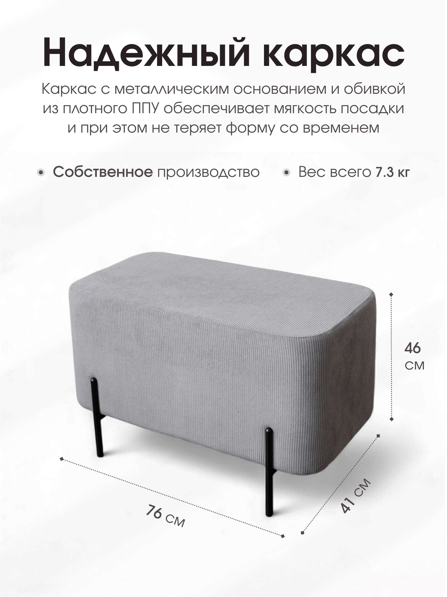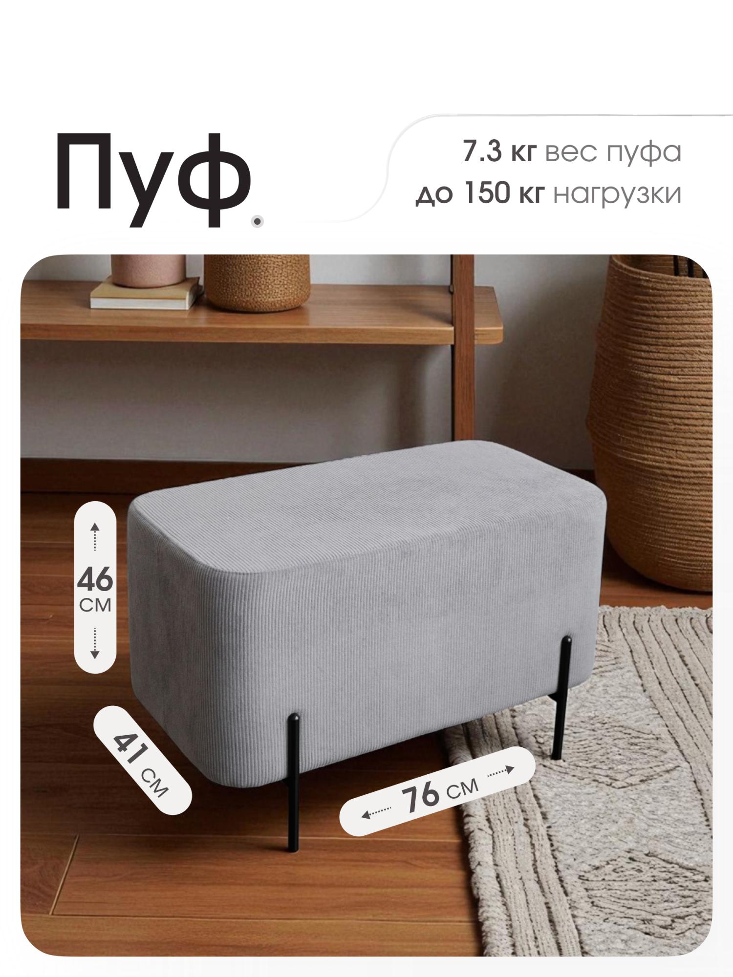 Размер: длина: 76 см глубина: 41 см высота: 46 см Дизайнерский пуфик прекрасно дополнит интерьер как в прихожей, так в гостиной или детской. Обивка – износостойкий текстурный велюр. Опоры пуфа металлические и очень прочные и выполнены в классическом стиле. Корпус модели выполнен из прочного ДСП высокого качества, благодаря чему банкетка выдерживает большой вес. Наполнение банкетки – мягкий поролон. На данный товар распространяется гарантия 12 месяцев. Поставляются пуфы в гофрокоробе