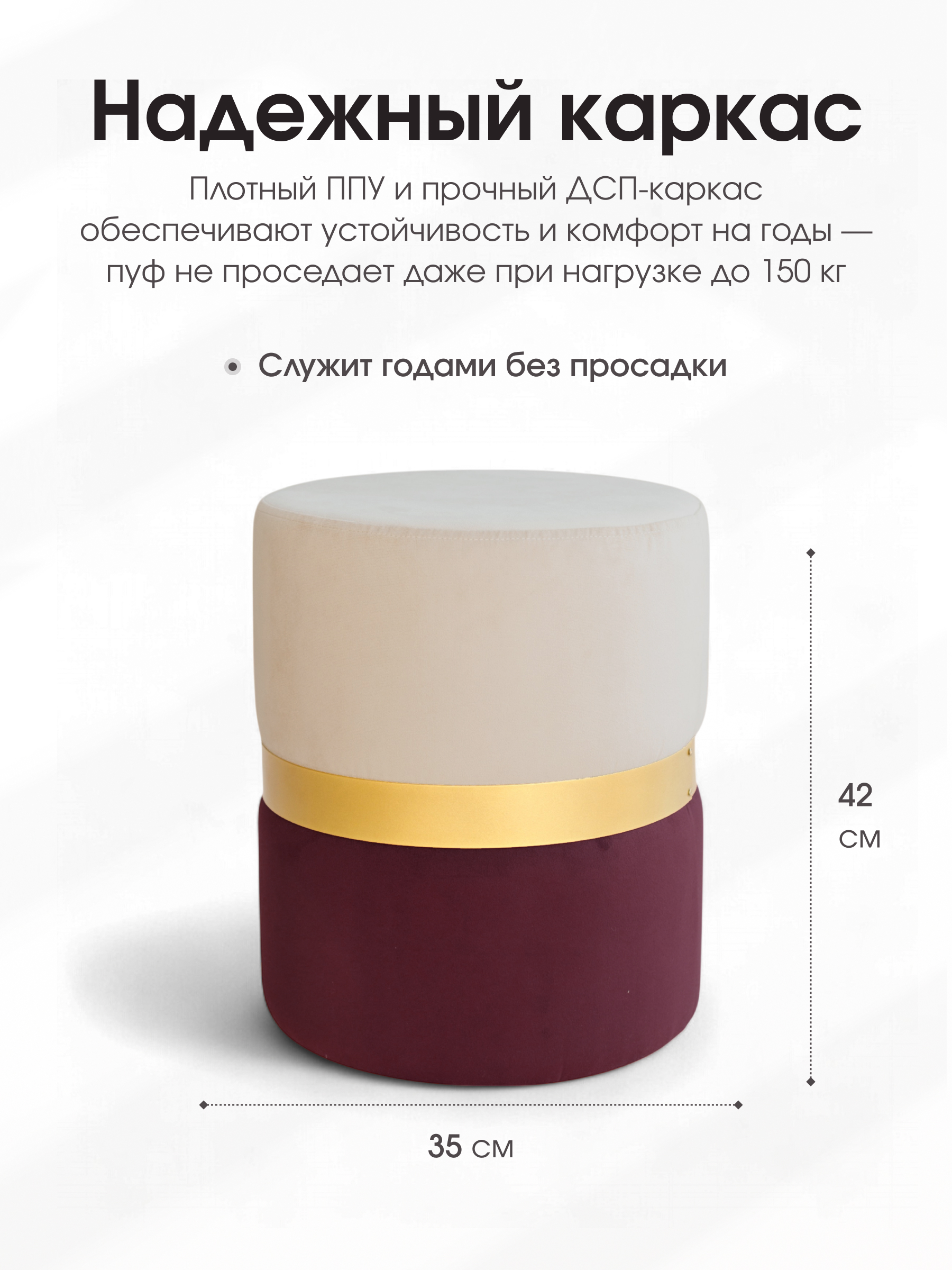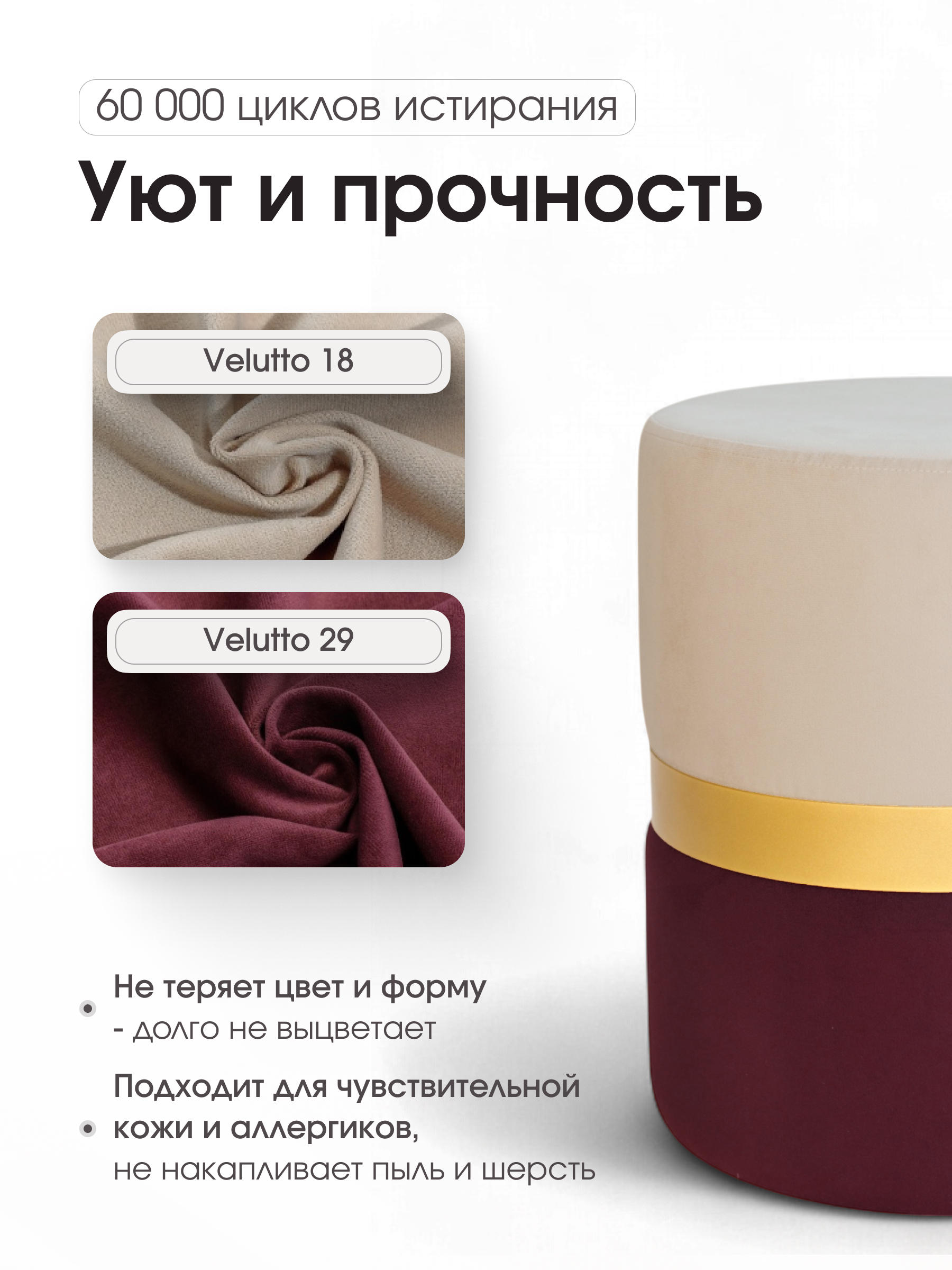 Пуф “Колорадо” - находка для ценителей минимализма. Размер: Длина: 35 см Ширина: 35 см Высота: 42 см Материал наружной ткани – мягкий велюр. Обивка крайне прочная, практичная и износостойкая. Наполнение банкетки – прочный поролон, обитый стёганным велюром. Корпус пуфа выполнен из прочного ДСП, благодаря чему он выдерживает вес до 150 кг. Металлический обруч посередине пуфа, выступает в виде декора. Пуф прекрасно дополнит интерьер любого уголка вашего дома, подойдёт: как в прихожую, так в гостиную или детскую. Большое разнообразие цветов позволит создать индивидуальное дизайнерское решение. Пуф Колорадо имеет все необходимые сертификаты качества. На данный товар распространяется гарантия 12 месяцев. Поставляются пуфы в гофрокоробе.