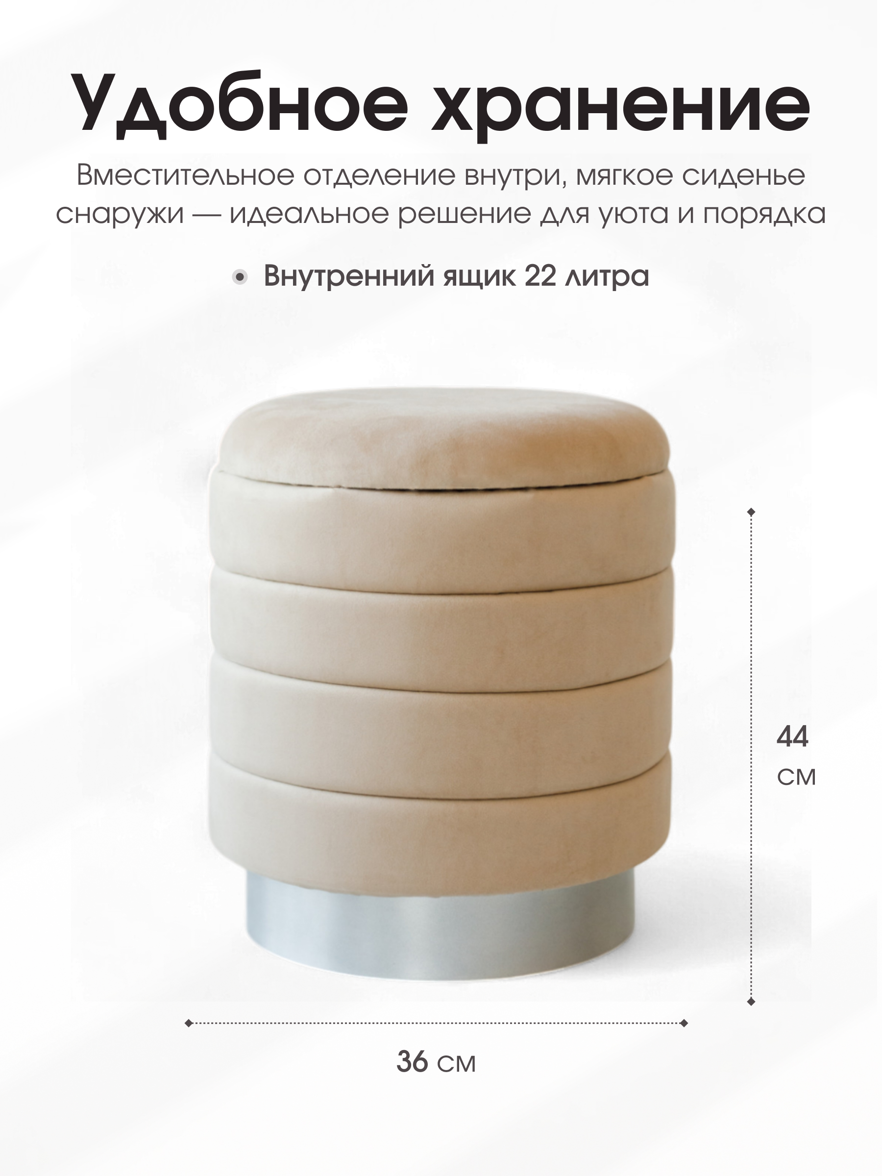 Размер: длина: 36 см ширина: 36 см высота: 44 см Изделие обладает размерами 36x36x44 см, что делает его компактным и удобным. Его легко переставлять с места на место. В пуфе имеется отделение для хранения вещей. Материал обивки - велюр. Ткань очень плотная и износостойкая и при этом она крайне мягкая. Пуф выполнен в классическом стиле, поэтому он станет великолепным дополнением к любому дизайну квартиры. Его можно разместить в любой комнате. Больше всего подойдет банкетка в гостиную. Высокое качество материалов, из которых изготовлена модель, способствуют сохранению ее первозданного вида на протяжении длительного времени. На данный товар распространяется гарантия 12 месяцев. Поставляются пуфы в гофрокоробе.