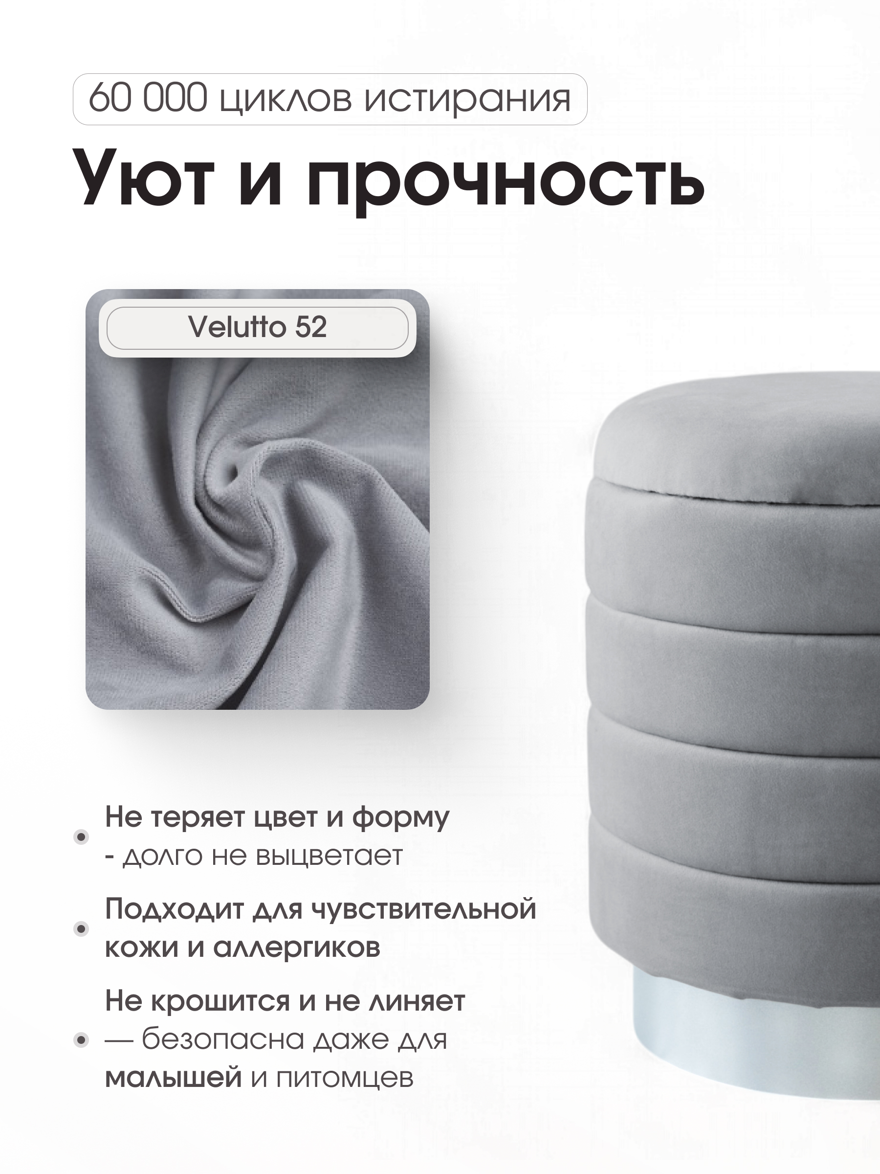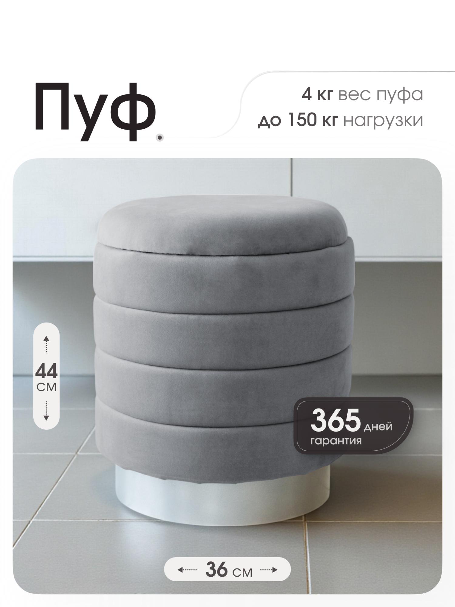 Размер: длина: 36 см ширина: 36 см высота: 44 см Изделие обладает размерами 36x36x44 см, что делает его компактным и удобным. Его легко переставлять с места на место. В пуфе имеется отделение для хранения вещей. Материал обивки - велюр. Ткань очень плотная и износостойкая и при этом она крайне мягкая. Пуф выполнен в классическом стиле, поэтому он станет великолепным дополнением к любому дизайну квартиры. Его можно разместить в любой комнате. Больше всего подойдет банкетка в гостиную. Высокое качество материалов, из которых изготовлена модель, способствуют сохранению ее первозданного вида на протяжении длительного времени. На данный товар распространяется гарантия 12 месяцев. Поставляются пуфы в гофрокоробе.