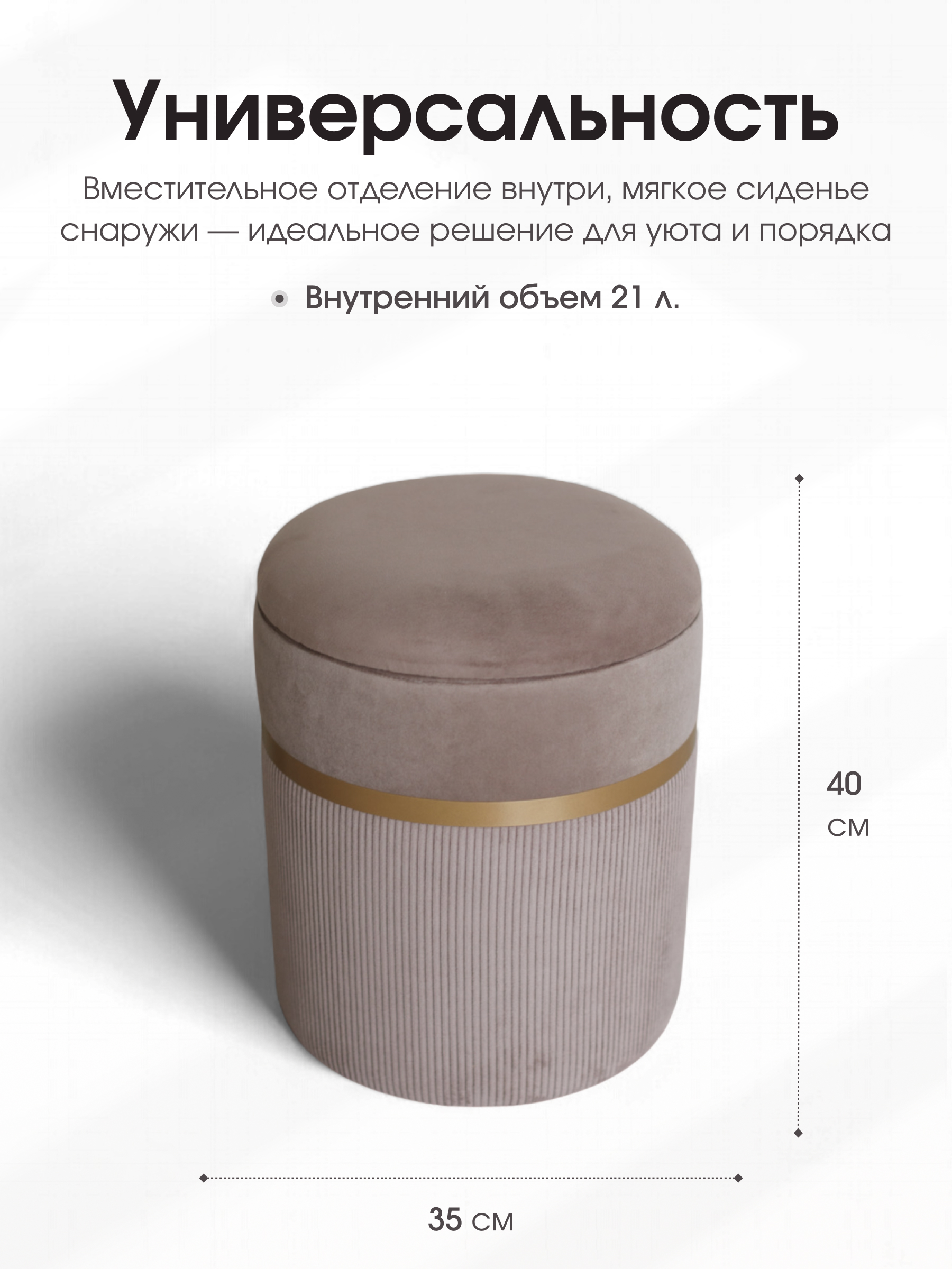 Размер: длина: 35 см ширина: 35 см высота: 40 см Изделие обладает размерами 35x35x40 см, что делает его компактным и удобным. Его легко переставлять с места на место. В пуфе имеется отделение для хранения вещей. Материал обивки - велюр. Ткань очень плотная и износостойкая.При этом она крайне мягкая. Пуф выполнен в классическом стиле, поэтому он с легкостью станет великолепным дополнением к любому дизайну квартиры. Его можно разместить в любой комнате. Больше всего подойдет банкетка в гостиную. Высокое качество материалов, из которых изготовлена модель, способствуют сохранению ее первозданного вида на протяжении очень длительного времени. На данный товар распространяется гарантия 12 месяцев. Поставляются пуфы в гофрокоробе.
