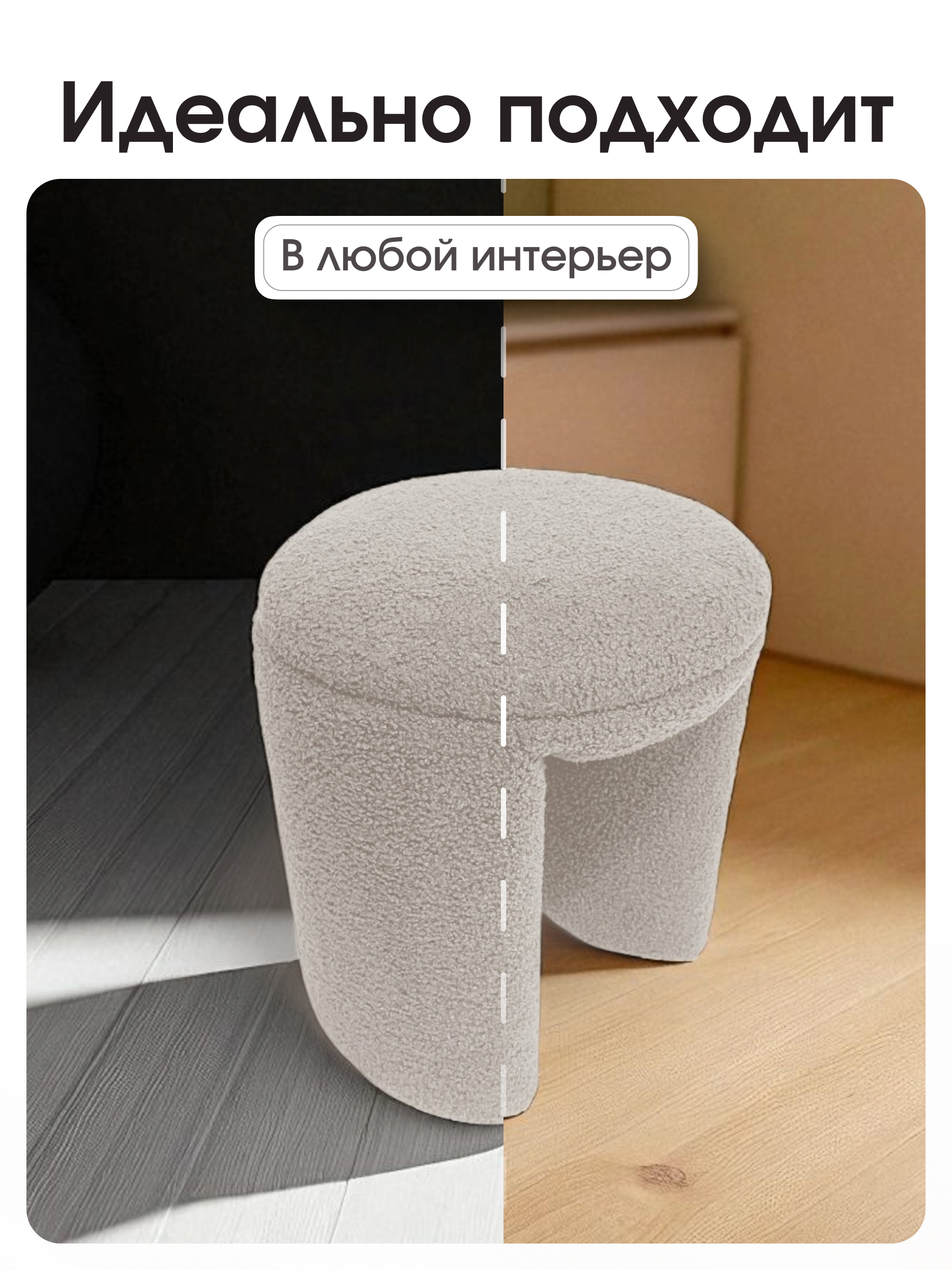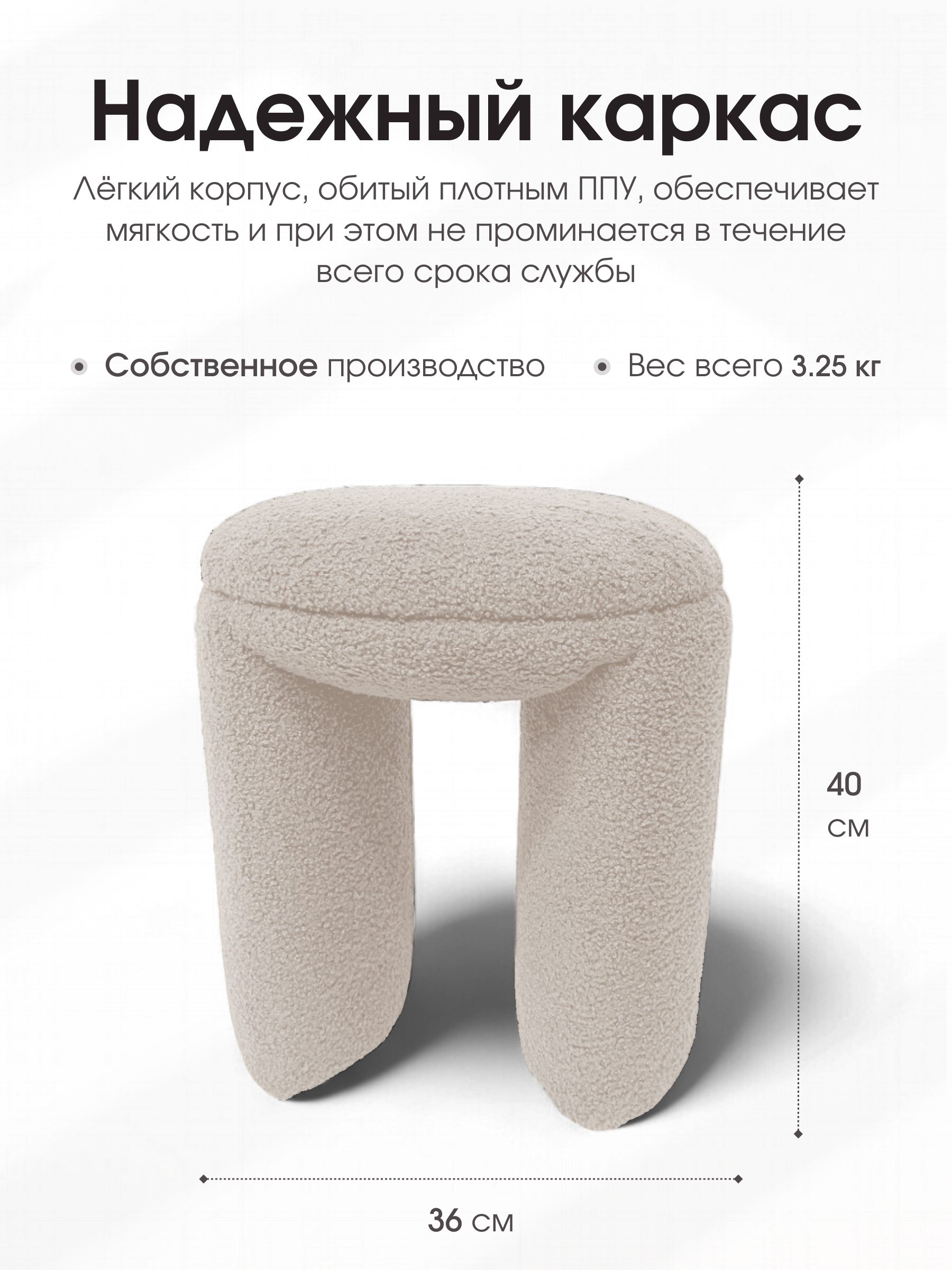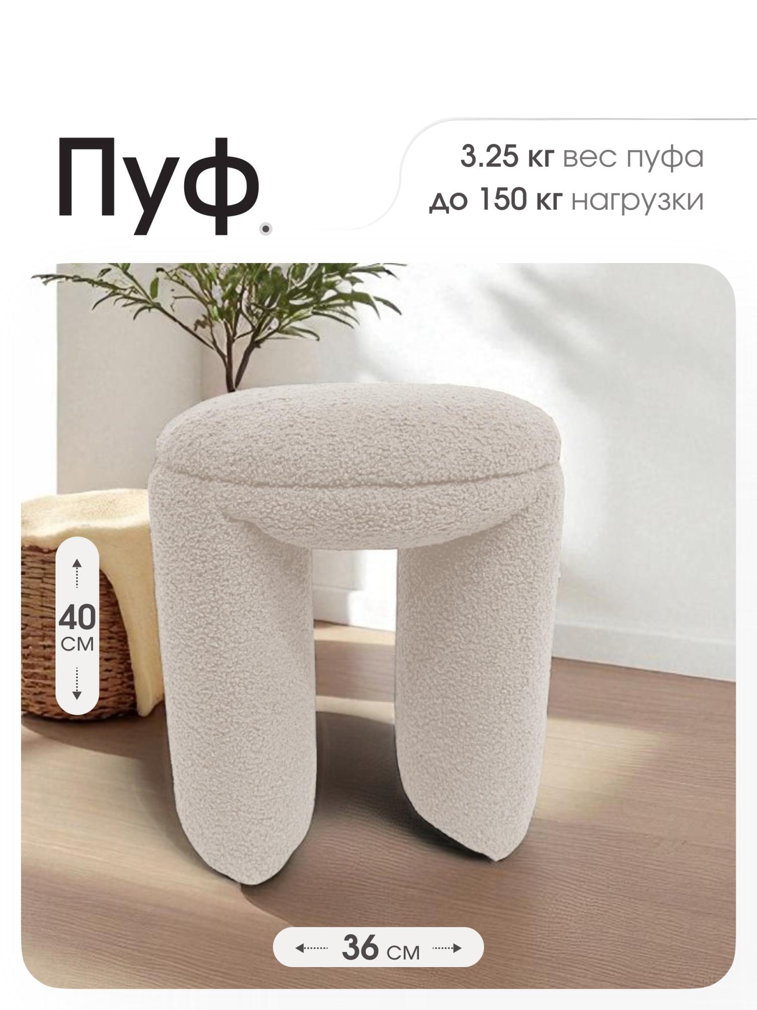 Пуфик П-образный в прихожую – стильное и удобное решение для дома. Размеры (глубина и ширина — 36 см, высота — 40 см) делают его идеальным для малогабаритных квартир. Ищете практичный и эстетичный пуф для прихожей, гостиной или спальни? Представляем мягкий пуф П-образной формы, который сочетает в себе комфорт, прочность и стильный внешний вид. Он идеально впишется в любой интерьер и станет удобной опорой для ног. Мягкий пуф с прочной обивкой. Пуф выполнен из мягкого велюра с имитацией овечьей шерсти, который приятен на ощупь и устойчив к царапинам от домашних животных. Материал легко чистится, не требует химчистки и сохраняет свой внешний вид даже при интенсивном использовании. Классический дизайн пуфа делает его подходящим к любому стилю интерьера — от современного до классического. Пуф можно разместить в прихожей, гостиной или спальне — он будет смотреться стильно и функционально. Несмотря на мягкость и легкость, пуф обладает высокой прочностью. Он выдерживает нагрузку до 150 килограмм, что делает его надежным и безопасным для всей семьи. На товар распространяется гарантия 12 месяцев, что подтверждает его высокое качество.