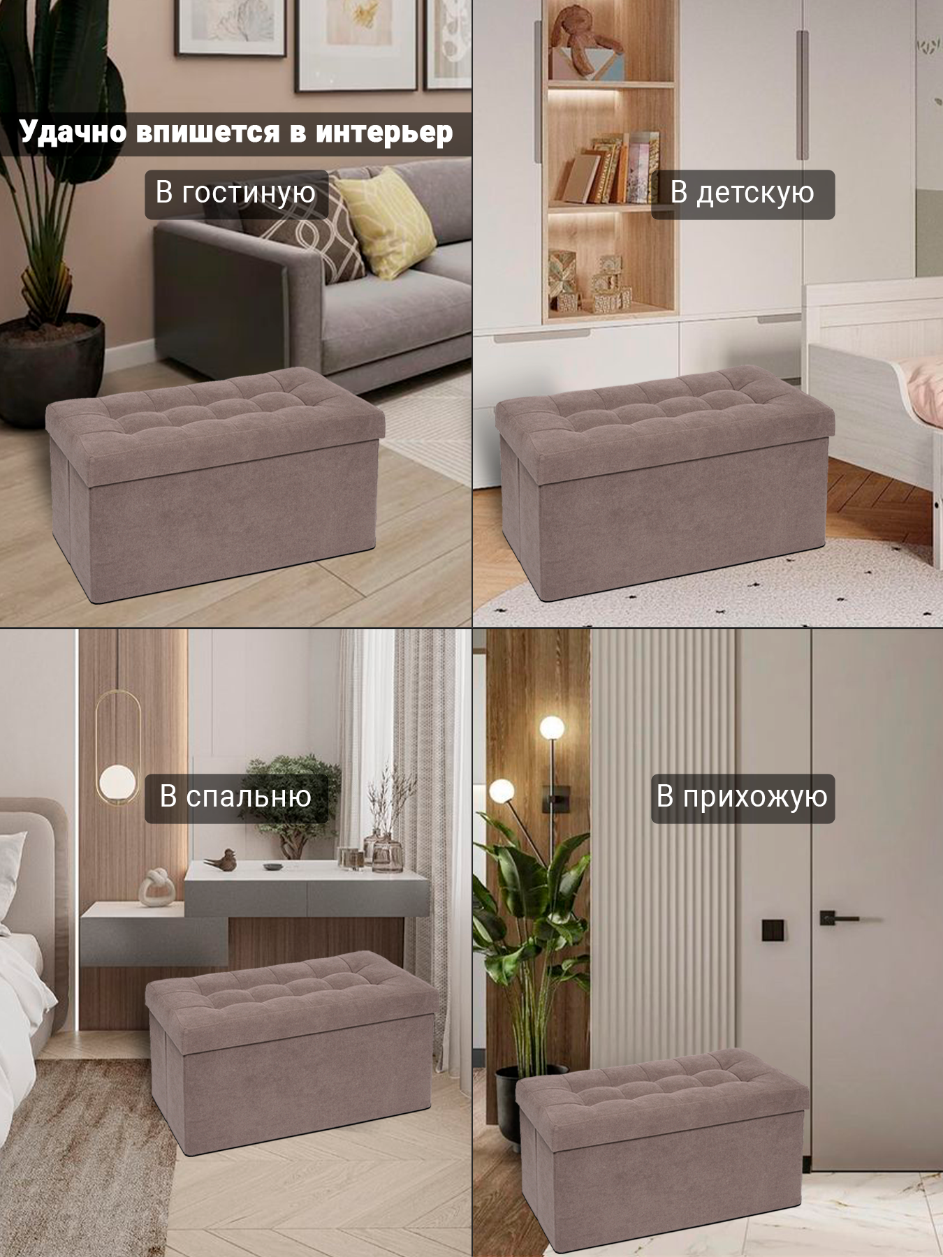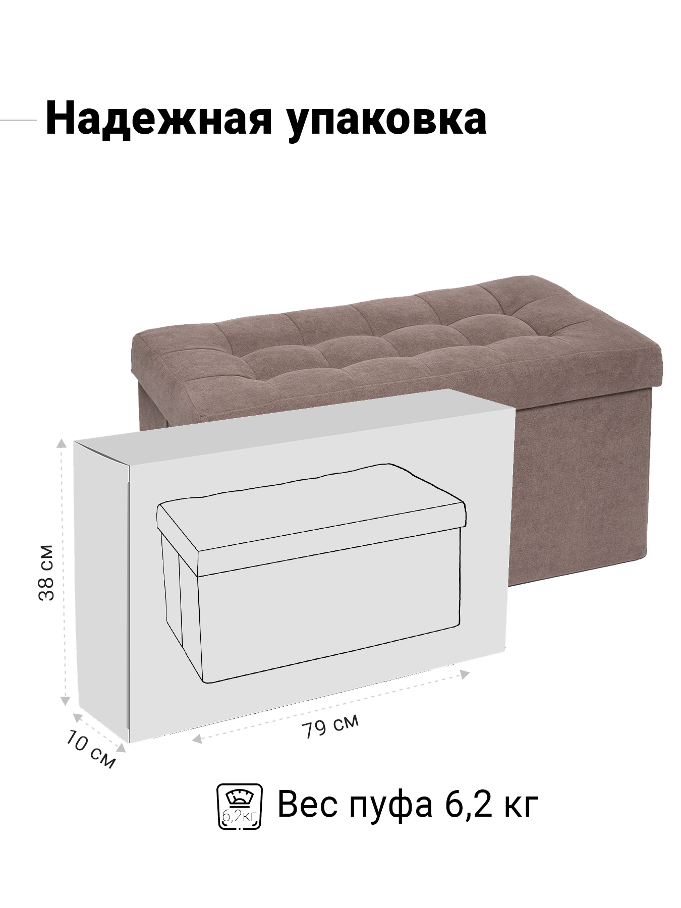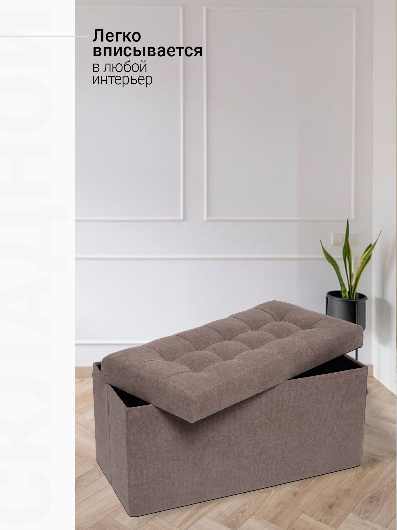 Большой складной пуф из велюра — удобство, стиль и место для хранения в одном изделии Этот двухместный пуф — идеальное решение для гостиной, детской или спальни. Благодаря компактной складной конструкции, он легко превращается в складной пуфик и занимает минимум места — идеально для малогабаритных квартир и частых переездов. Основные характеристики: - Размер в собранном виде: 79×37×40 см — комфортно разместятся двое взрослых - Размер в сложенном виде: 79×37×7 см — тонкий профиль для хранения под диваном, в шкафу или на балконе - Каркас: прочный МДФ — обеспечивает устойчивость и долговечность - Внутренний ящик: вместительный отсек на 100 литров — храните одеяла, игрушки, книги или сезонные вещи - Обивка: велюр Easy Way Clean — износостойкий, мягкий и легко моется, устойчив к пятнам и истиранию - Нагрузка: до 150 кг — надежно выдержит даже двух взрослых - Гарантия: 12 месяцев на весь продукт Преимущества: - Складывается и раскладывается за считанные секунды — никаких сложных механизмов - Универсальный дизайн: подойдёт как к современному, так и к классическому интерьеру - Возможность заказа в другой ткани — выбирайте из ассортимента на сайте Пуф поставляется в защищённой полиэтиленовой плёнке — готов к использованию сразу после распаковки. Складной пуф — это не просто сиденье, а умный элемент интерьера. Закажите сейчас и сделайте свой дом удобнее!