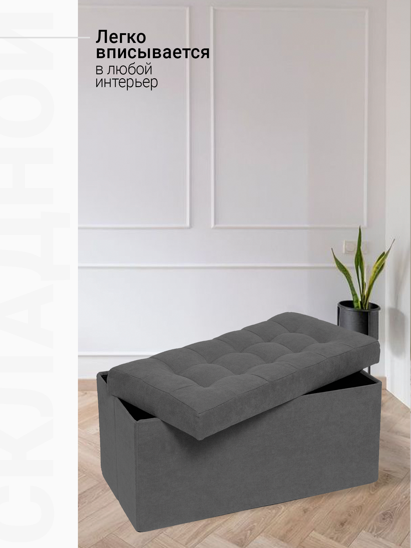 Большой складной пуф из велюра — удобство, стиль и место для хранения в одном изделии Этот двухместный пуф — идеальное решение для гостиной, детской или спальни. Благодаря компактной складной конструкции, он легко превращается в складной пуфик и занимает минимум места — идеально для малогабаритных квартир и частых переездов. Основные характеристики: - Размер в собранном виде: 79×37×40 см — комфортно разместятся двое взрослых - Размер в сложенном виде: 79×37×7 см — тонкий профиль для хранения под диваном, в шкафу или на балконе - Каркас: прочный МДФ — обеспечивает устойчивость и долговечность - Внутренний ящик: вместительный отсек на 100 литров — храните одеяла, игрушки, книги или сезонные вещи - Обивка: велюр Easy Way Clean — износостойкий, мягкий и легко моется, устойчив к пятнам и истиранию - Нагрузка: до 150 кг — надежно выдержит даже двух взрослых - Гарантия: 12 месяцев на весь продукт Преимущества: - Складывается и раскладывается за считанные секунды — никаких сложных механизмов - Универсальный дизайн: подойдёт как к современному, так и к классическому интерьеру - Возможность заказа в другой ткани — выбирайте из ассортимента на сайте Пуф поставляется в защищённой полиэтиленовой плёнке — готов к использованию сразу после распаковки. Складной пуф — это не просто сиденье, а умный элемент интерьера. Закажите сейчас и сделайте свой дом удобнее!
