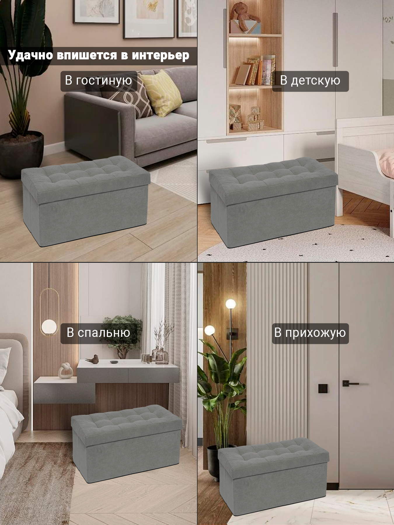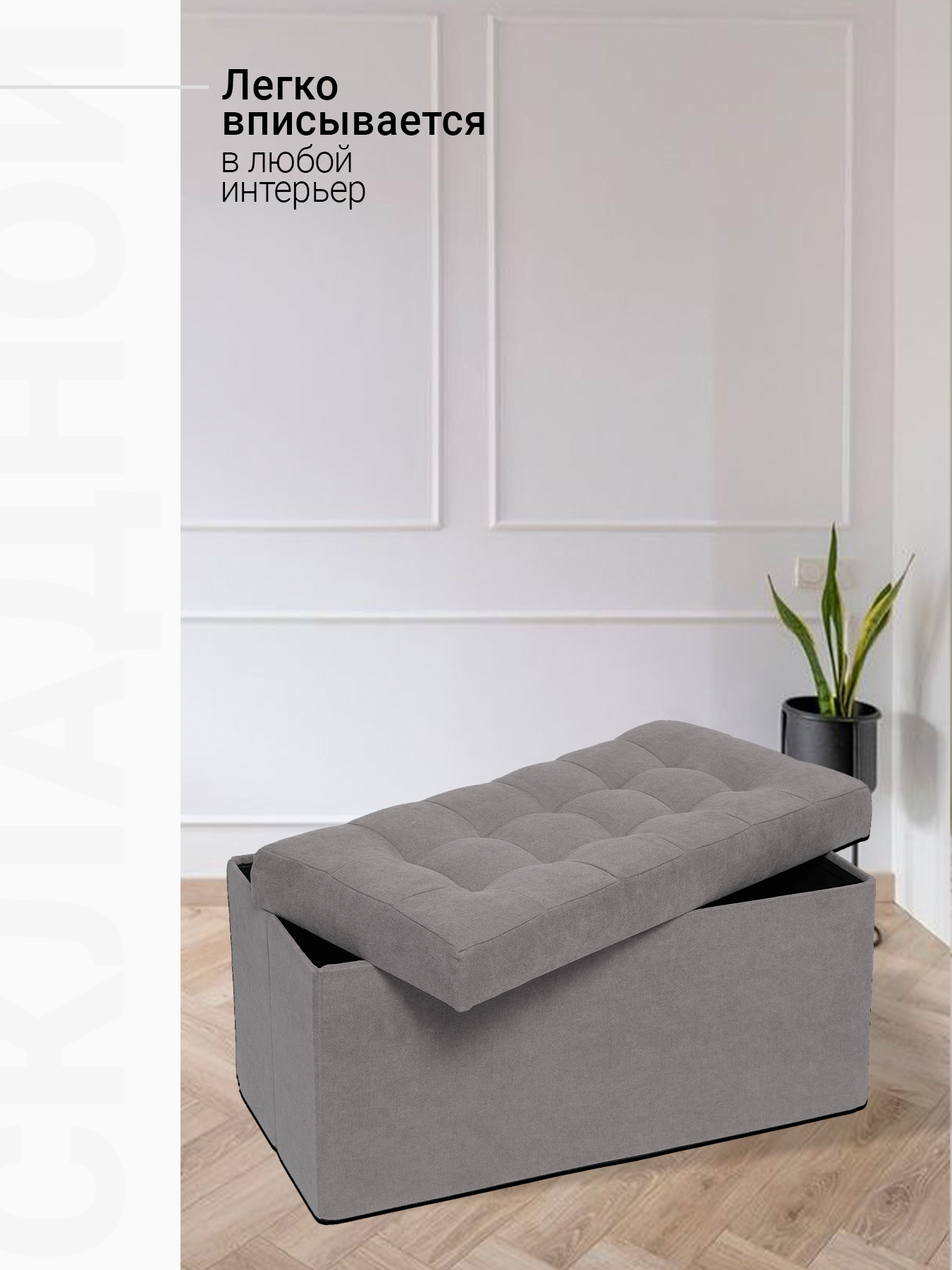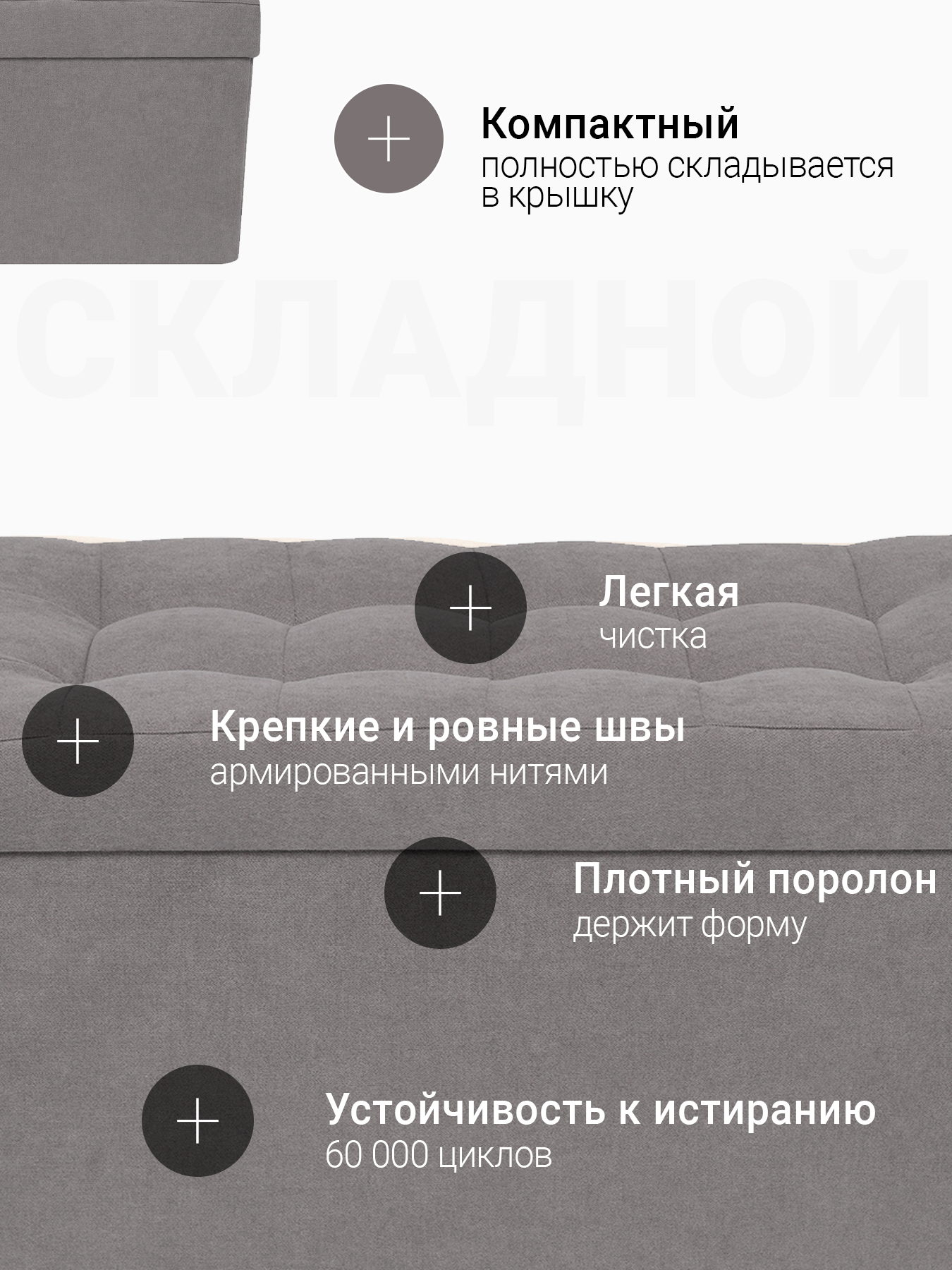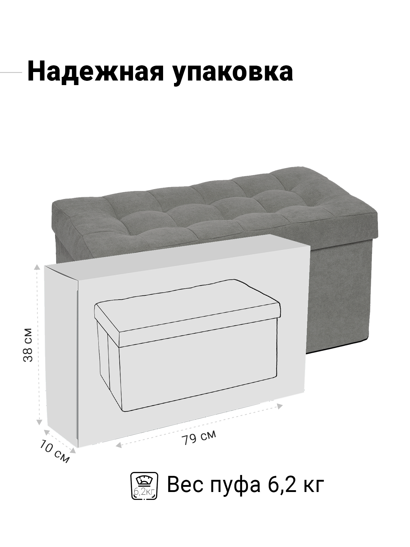 Большой складной пуф из велюра — удобство, стиль и место для хранения в одном изделии Этот двухместный пуф — идеальное решение для гостиной, детской или спальни. Благодаря компактной складной конструкции, он легко превращается в складной пуфик и занимает минимум места — идеально для малогабаритных квартир и частых переездов. Основные характеристики: - Размер в собранном виде: 79×37×40 см — комфортно разместятся двое взрослых - Размер в сложенном виде: 79×37×7 см — тонкий профиль для хранения под диваном, в шкафу или на балконе - Каркас: прочный МДФ — обеспечивает устойчивость и долговечность - Внутренний ящик: вместительный отсек на 100 литров — храните одеяла, игрушки, книги или сезонные вещи - Обивка: велюр Easy Way Clean — износостойкий, мягкий и легко моется, устойчив к пятнам и истиранию - Нагрузка: до 150 кг — надежно выдержит даже двух взрослых - Гарантия: 12 месяцев на весь продукт Преимущества: - Складывается и раскладывается за считанные секунды — никаких сложных механизмов - Универсальный дизайн: подойдёт как к современному, так и к классическому интерьеру - Возможность заказа в другой ткани — выбирайте из ассортимента на сайте Пуф поставляется в защищённой полиэтиленовой плёнке — готов к использованию сразу после распаковки. Складной пуф — это не просто сиденье, а умный элемент интерьера. Закажите сейчас и сделайте свой дом удобнее!