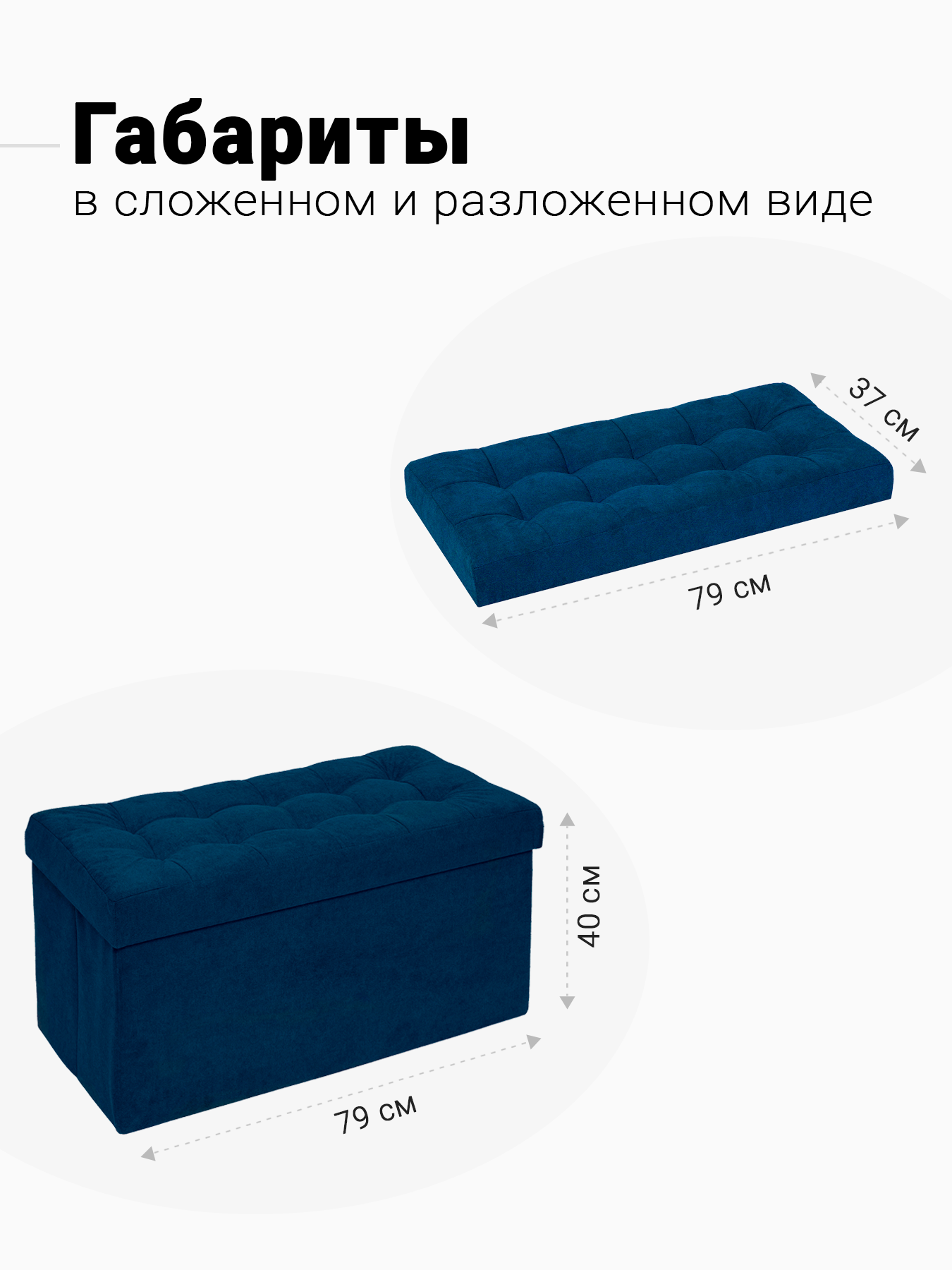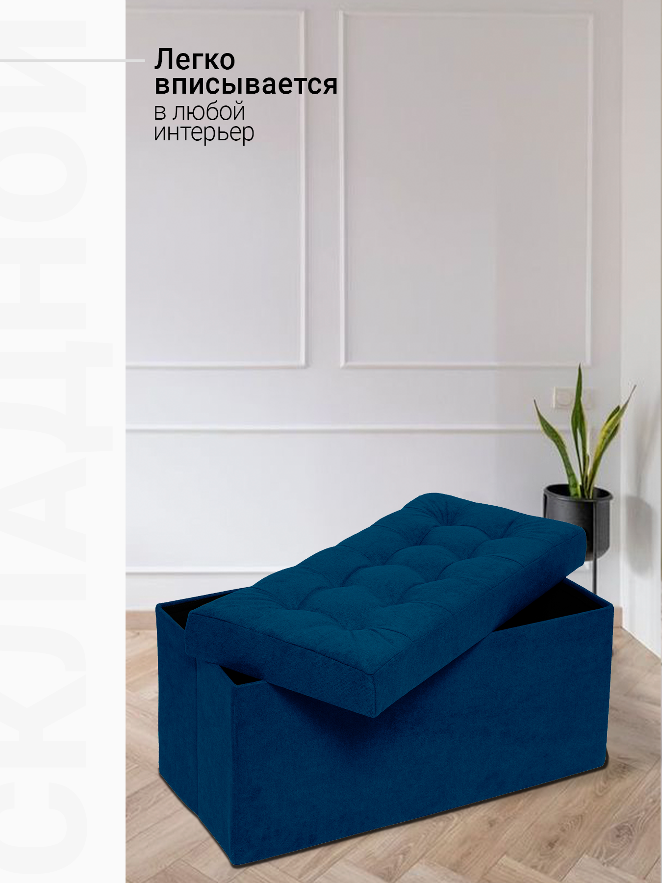 Большой складной пуф из велюра — удобство, стиль и место для хранения в одном изделии Этот двухместный пуф — идеальное решение для гостиной, детской или спальни. Благодаря компактной складной конструкции, он легко превращается в складной пуфик и занимает минимум места — идеально для малогабаритных квартир и частых переездов. Основные характеристики: - Размер в собранном виде: 79×37×40 см — комфортно разместятся двое взрослых - Размер в сложенном виде: 79×37×7 см — тонкий профиль для хранения под диваном, в шкафу или на балконе - Каркас: прочный МДФ — обеспечивает устойчивость и долговечность - Внутренний ящик: вместительный отсек на 100 литров — храните одеяла, игрушки, книги или сезонные вещи - Обивка: велюр Easy Way Clean — износостойкий, мягкий и легко моется, устойчив к пятнам и истиранию - Нагрузка: до 150 кг — надежно выдержит даже двух взрослых - Гарантия: 12 месяцев на весь продукт Преимущества: - Складывается и раскладывается за считанные секунды — никаких сложных механизмов - Универсальный дизайн: подойдёт как к современному, так и к классическому интерьеру - Возможность заказа в другой ткани — выбирайте из ассортимента на сайте Пуф поставляется в защищённой полиэтиленовой плёнке — готов к использованию сразу после распаковки. Складной пуф — это не просто сиденье, а умный элемент интерьера. Закажите сейчас и сделайте свой дом удобнее!