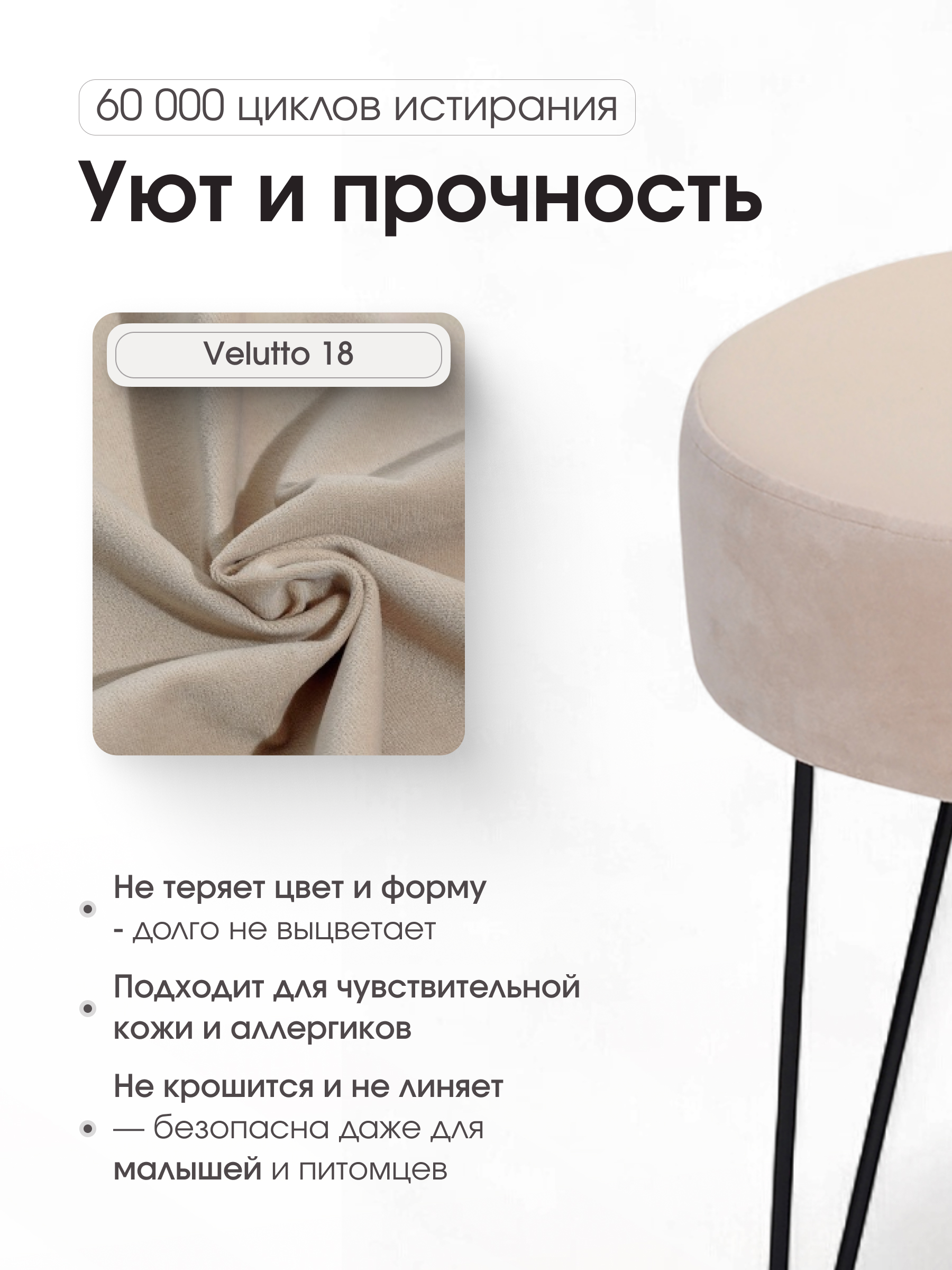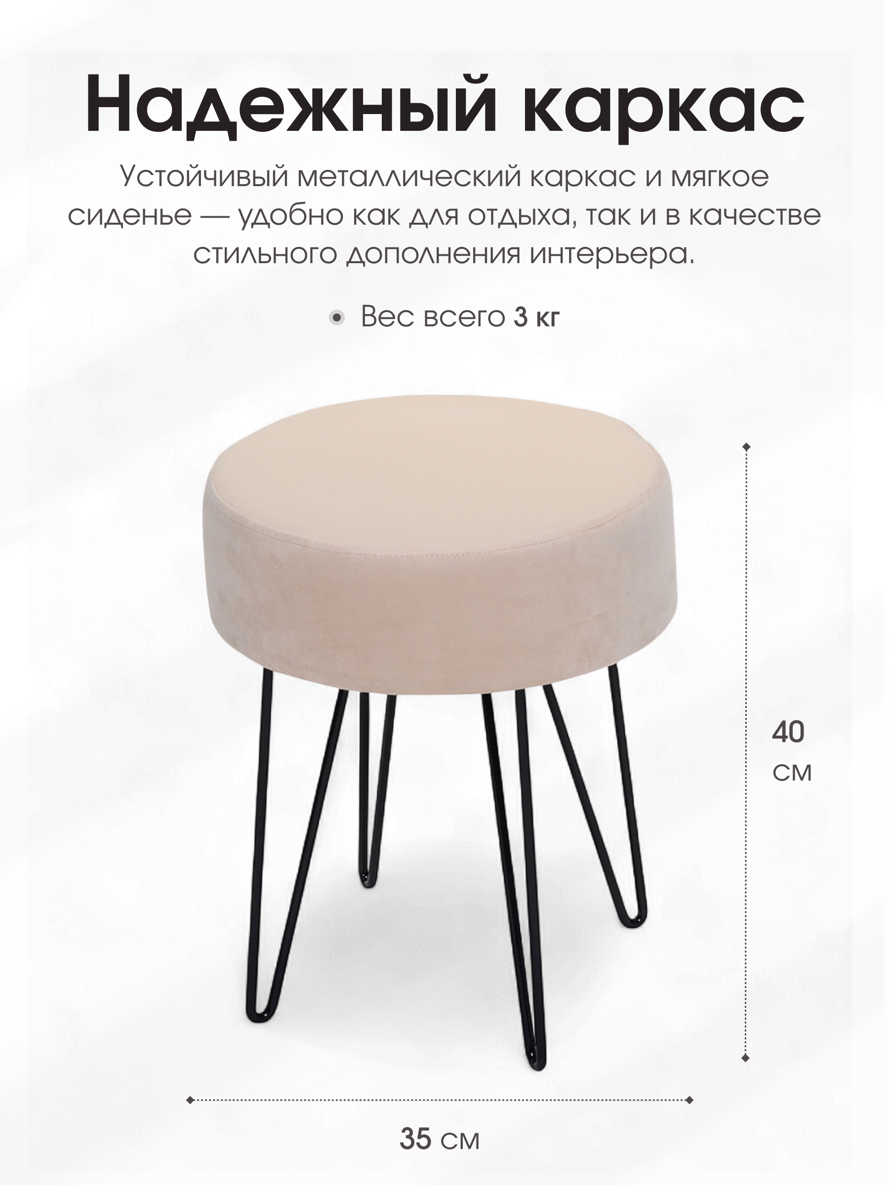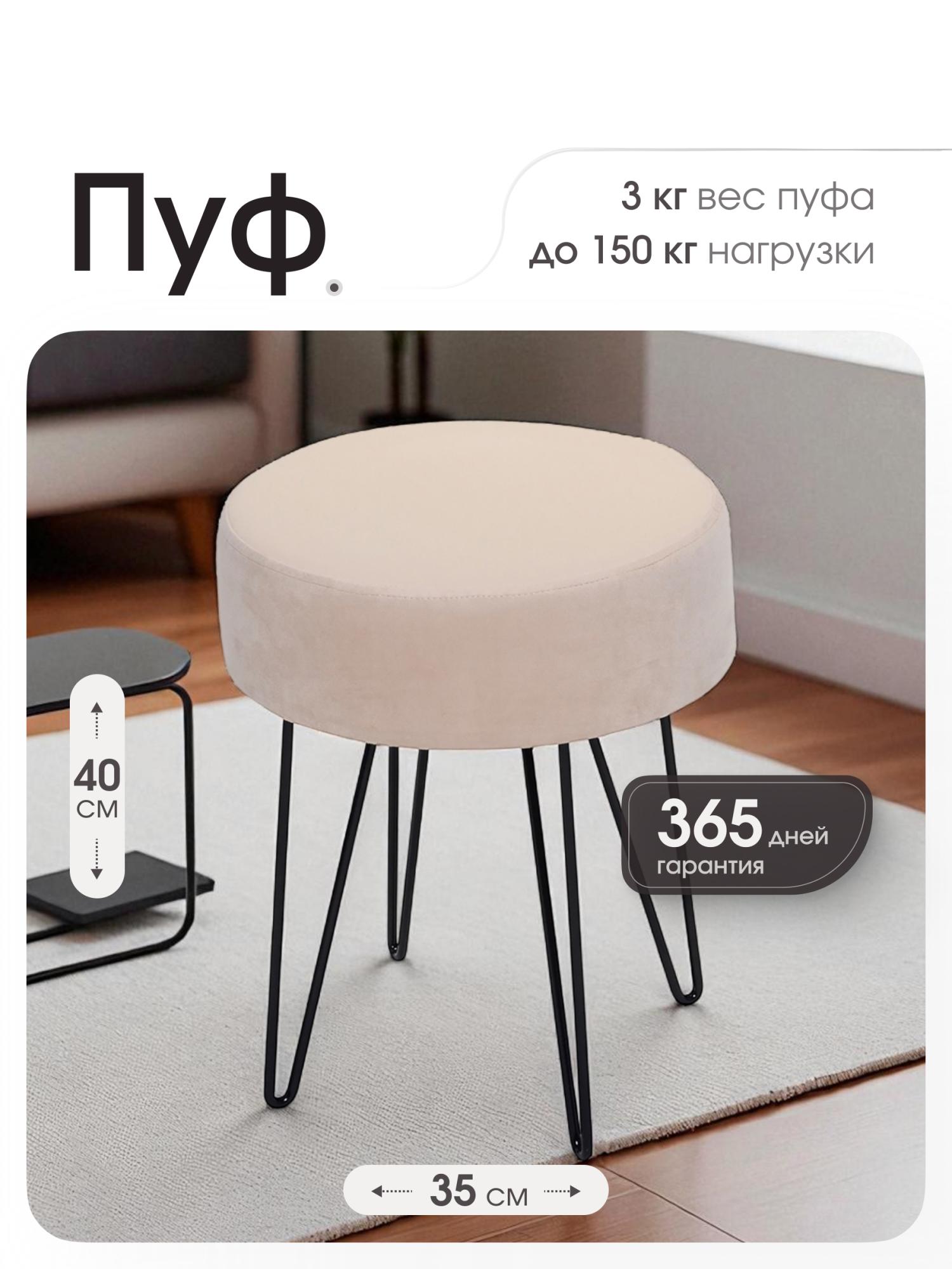 Размер: длина: 35 см ширина: 35 см высота: 40 см Пуфик состоит из прочного металлокаркаса и мягкой поролоновой сидушки. Обивка сидушки - велюр. Пуф станет великолепным дополнением к любому дизайну квартиры. Его можно разместить в любой комнате. Больше всего подойдет банкетка в гостиную. Высокое качество материалов, из которых изготовлена модель, способствуют сохранению ее первозданного вида на протяжении очень длительного времени. Максимальна нагрузка на пуфик - 100 кг. На данный товар распространяется гарантия 12 месяцев. Поставляются пуфы в гофрокоробе.