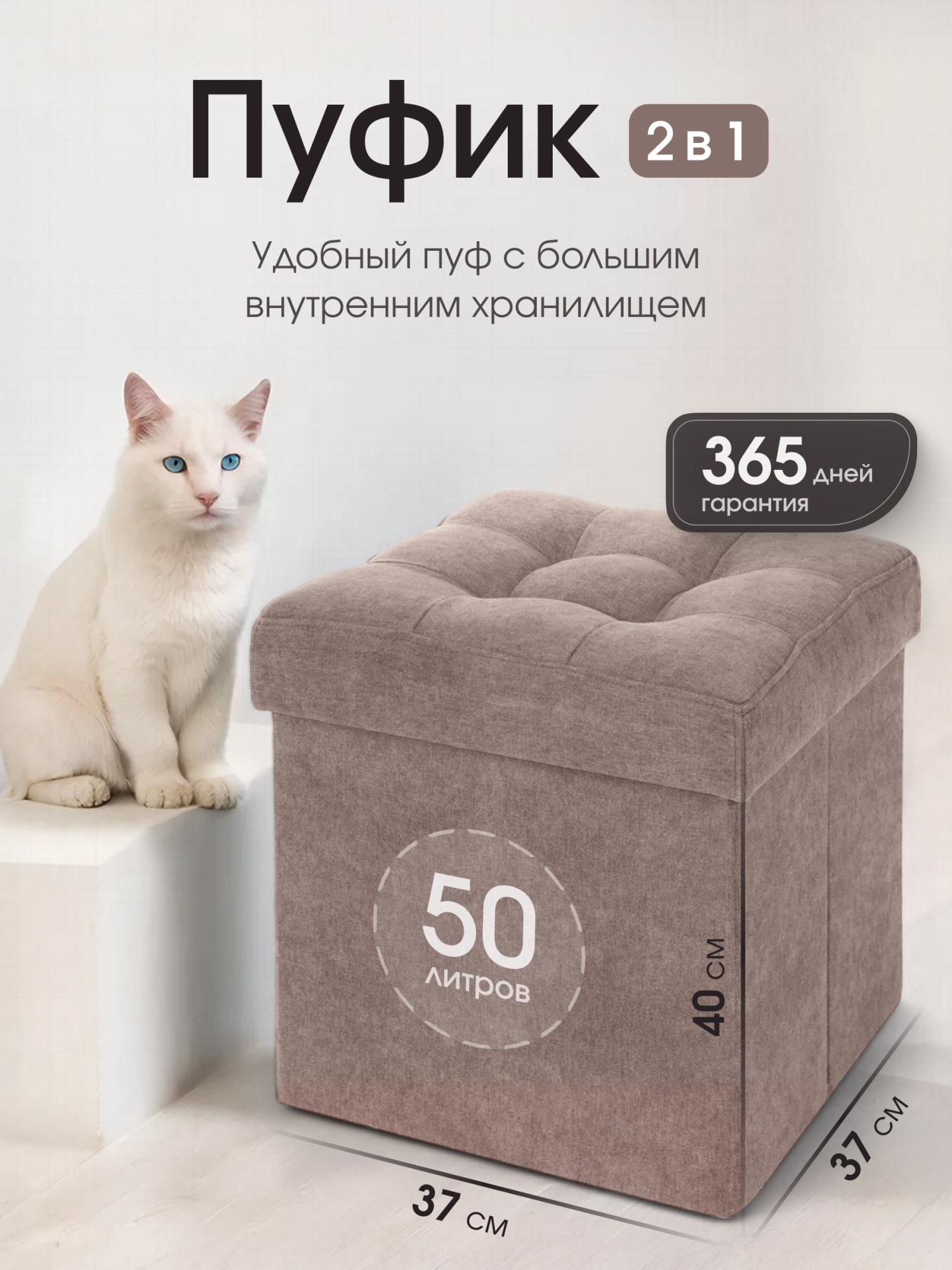 Размер: В собранном виде (ШхГхВ) 37*37*40 см В сложенном виде (ШхГхВ) 37*37*7 см Каркас: МДФ Внутри пуфа есть емкость для хранения вещей. Объем ящика - 50 литров. Материал наружной ткани – велюр Easy Way Clean. Максимальная нагрузка - 100 кг. Гарантия на пуф - 12 месяцев. Пуф складной, складывается полностью в крышку изделия. В сложенном виде пуфик занимает немного места, его легко хранить и перевозить. Вы можете заказать изготовление пуфика из любой ткани, представленной на нашем сайте. Благодаря удобной конструкции изделия его можно сложить и разложить в течение нескольких секунд. Поставляется в полиэтиленовой пленке.