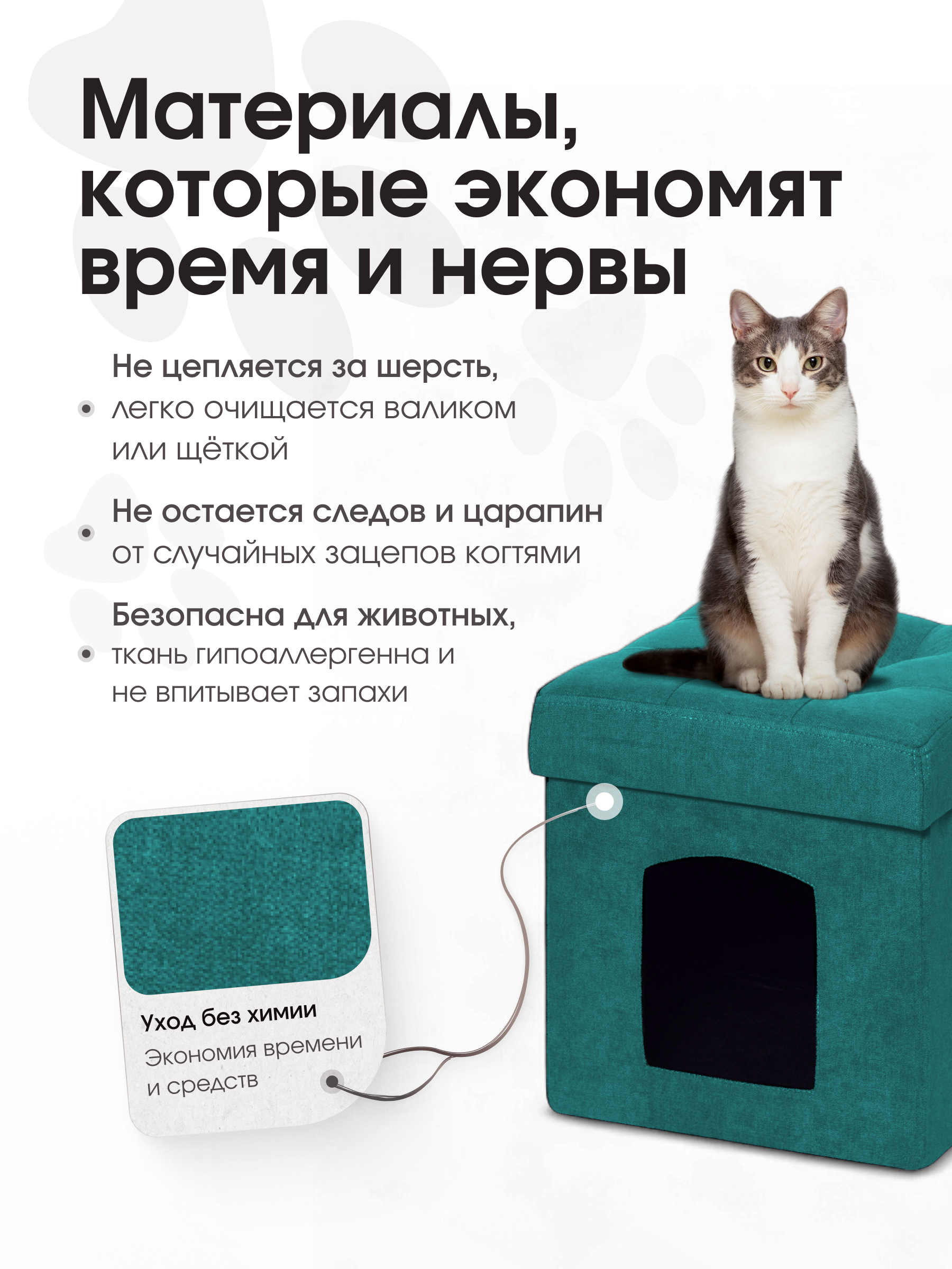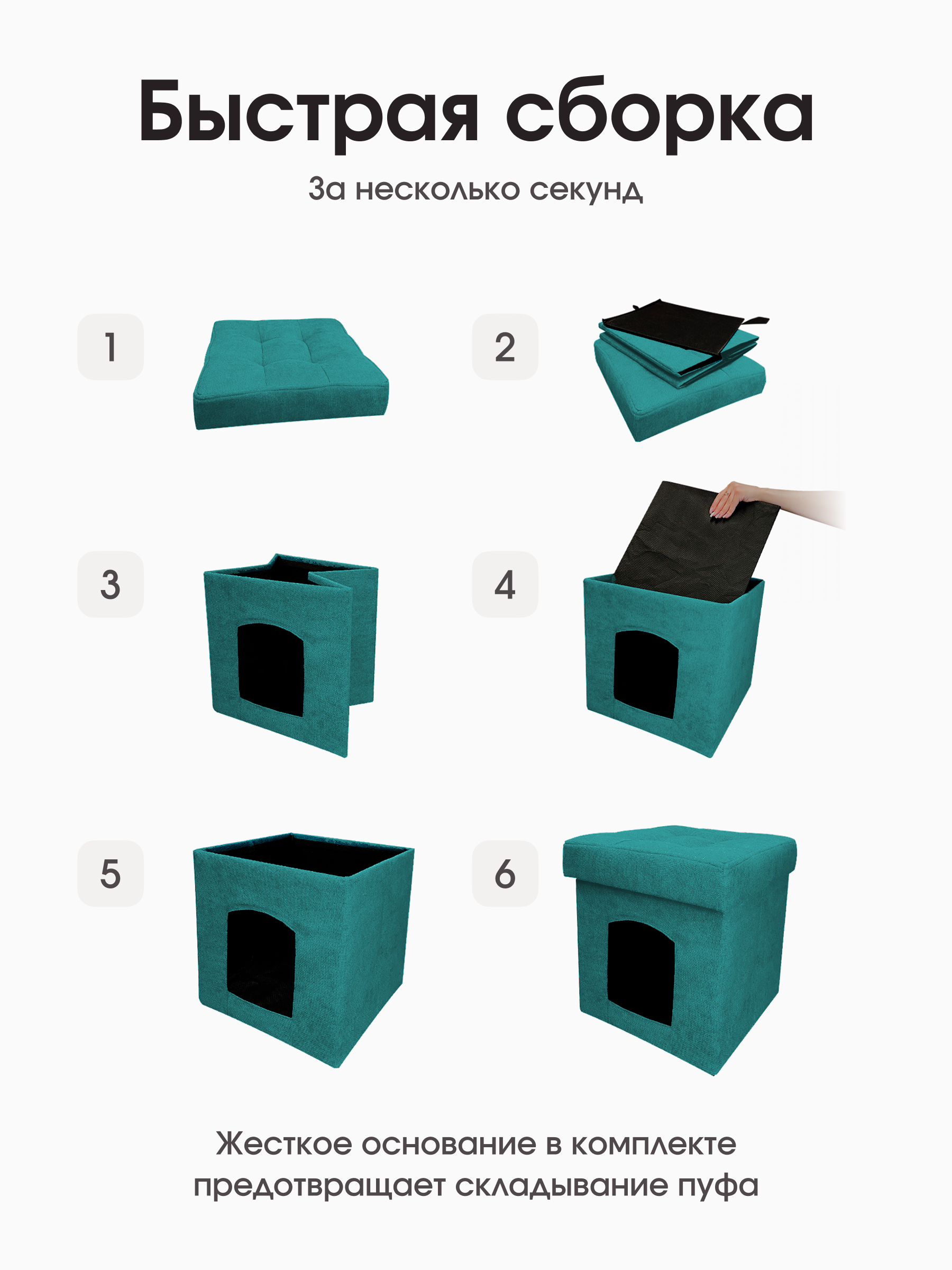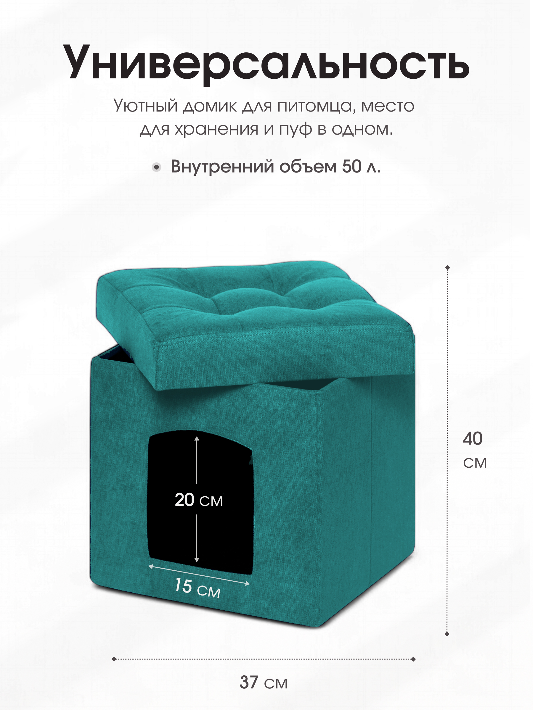 Характеристики пуфа: Материал – велюр EasyWay Clean. Материал легко чистится без моющих химических средств. Каркас – МДФ. Размер в собранном виде – 37*37*40 см Размер в сложенном виде – 37*37*7 см Выдерживает вес до 100 кг. Складной пуфик для животных – подойдет тем, кому важна многофункциональность мебели. Органично впишется в небольшую квартиру! Пуфик полностью складывается в свою же крышку, поэтому совсем не занимает места у вас дома. В собранном виде внутри у него достаточно места для кошки или небольшой собаки. Можно устроить там лежанку или использовать как есть. Рекомендуем вам использовать пуф для прихожей или гостиной, где нужно место, чтобы присесть, а питомцу – полежать. Домашние животные любят чувство защищенности, поэтому котики так часто залезают в коробки. Складной пуф для хранения закрыт со всех сторон, кроме единственной стенки, поэтому все питомцы с радостью проводят в нем время и спят без беспокойств. Такой складной пуф трансформер подойдет для путешествий со своим животным: небольшие размеры и компактность делают решающий выбор. Поэтому рекомендуем купить качественный пуф, который будет служить вам очень и очень долго! На всю продукцию гарантия 12 месяцев.
