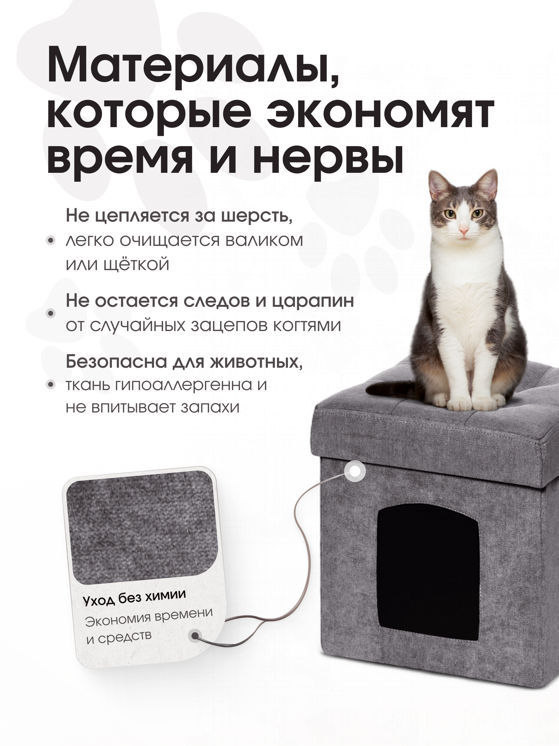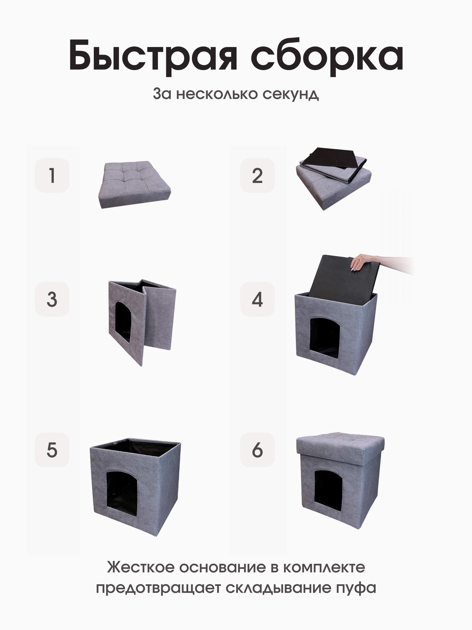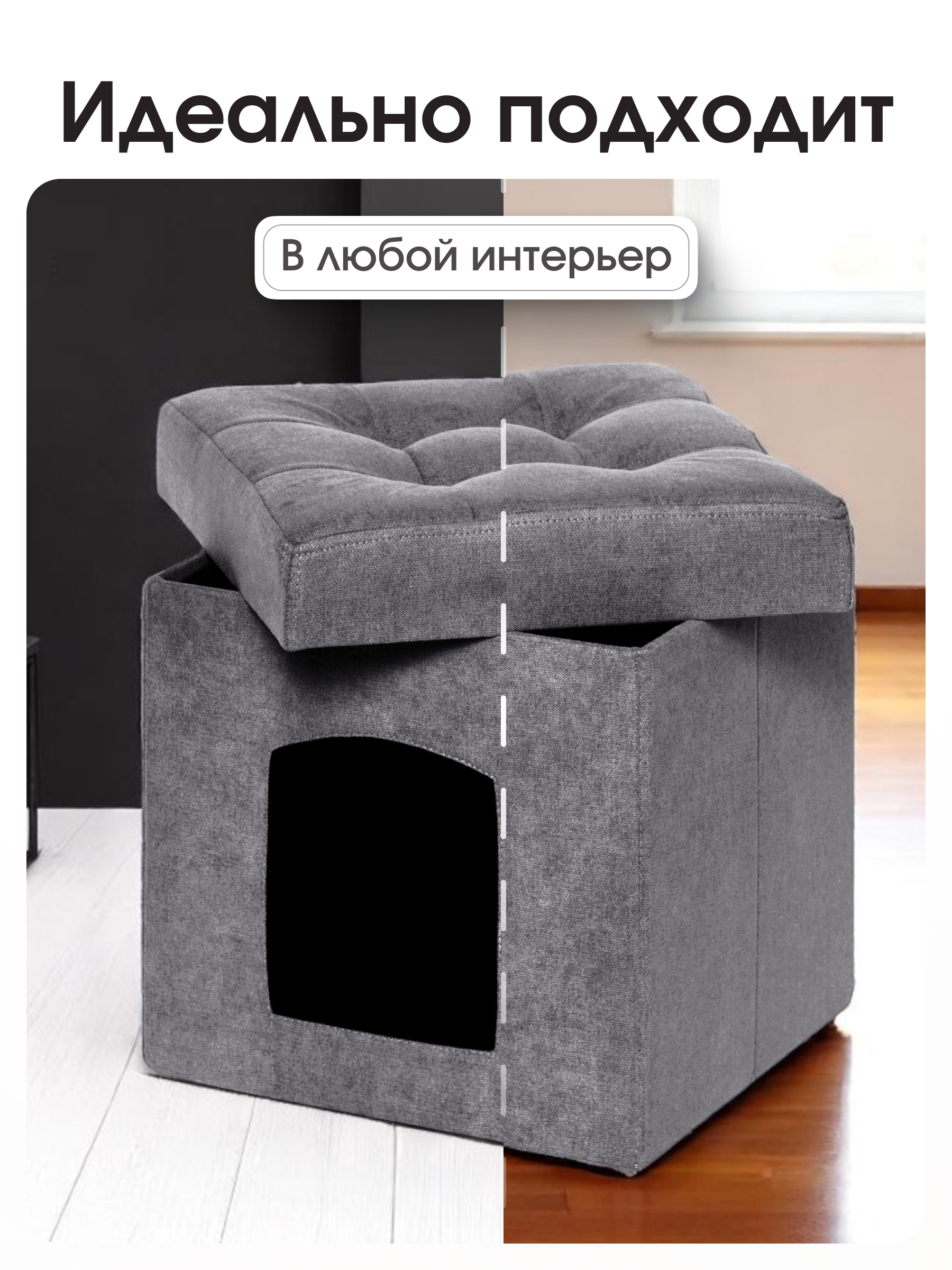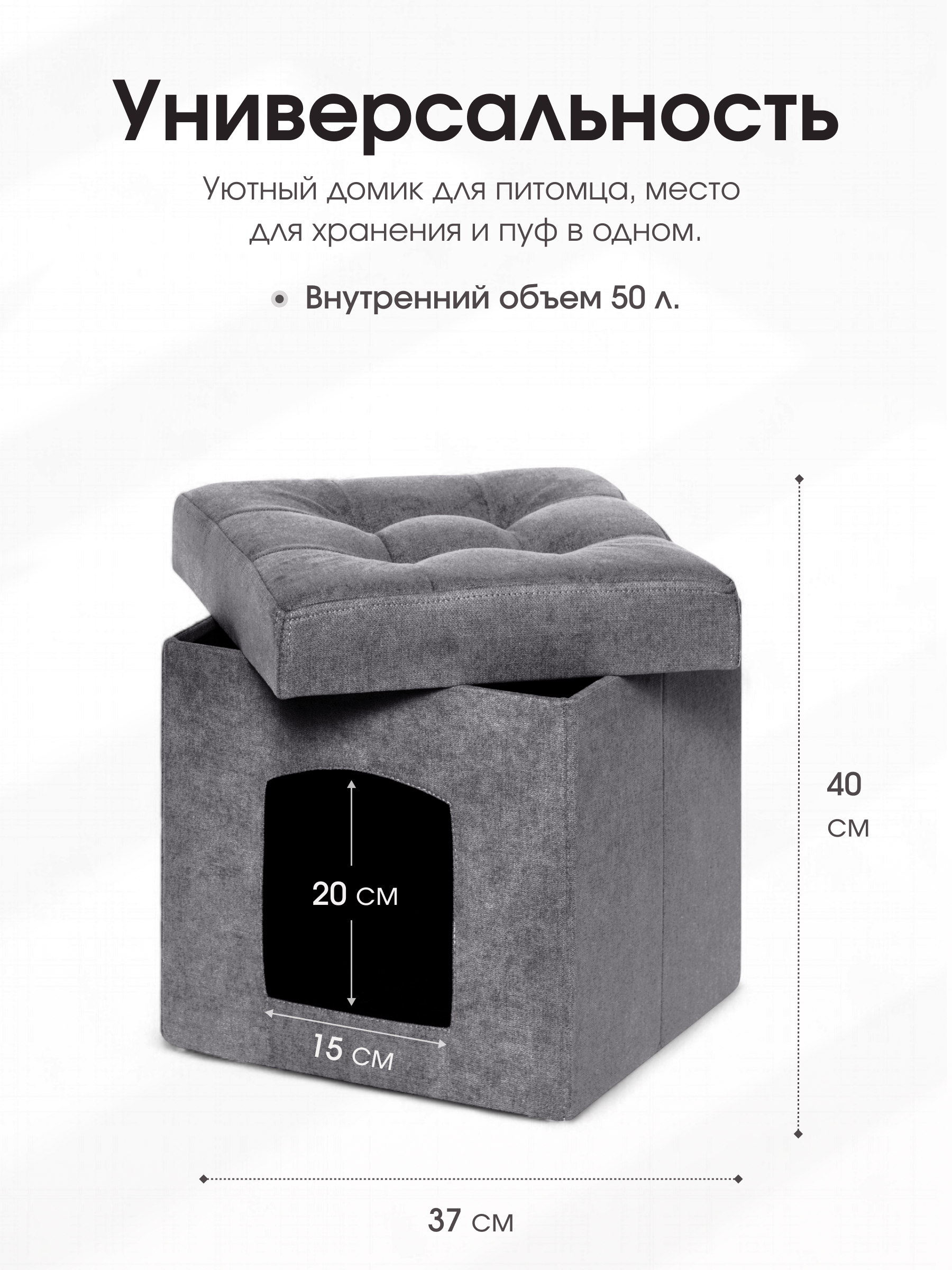 Характеристики пуфа: Материал – велюр EasyWay Clean. Материал легко чистится без моющих химических средств. Каркас – МДФ. Размер в собранном виде – 37*37*40 см Размер в сложенном виде – 37*37*7 см Выдерживает вес до 100 кг. Складной пуфик для животных – подойдет тем, кому важна многофункциональность мебели. Органично впишется в небольшую квартиру! Пуфик полностью складывается в свою же крышку, поэтому совсем не занимает места у вас дома. В собранном виде внутри у него достаточно места для кошки или небольшой собаки. Можно устроить там лежанку или использовать как есть. Рекомендуем вам использовать пуф для прихожей или гостиной, где нужно место, чтобы присесть, а питомцу – полежать. Домашние животные любят чувство защищенности, поэтому котики так часто залезают в коробки. Складной пуф для хранения закрыт со всех сторон, кроме единственной стенки, поэтому все питомцы с радостью проводят в нем время и спят без беспокойств. Такой складной пуф трансформер подойдет для путешествий со своим животным: небольшие размеры и компактность делают решающий выбор. Поэтому рекомендуем купить качественный пуф, который будет служить вам очень и очень долго! На всю продукцию гарантия 12 месяцев.