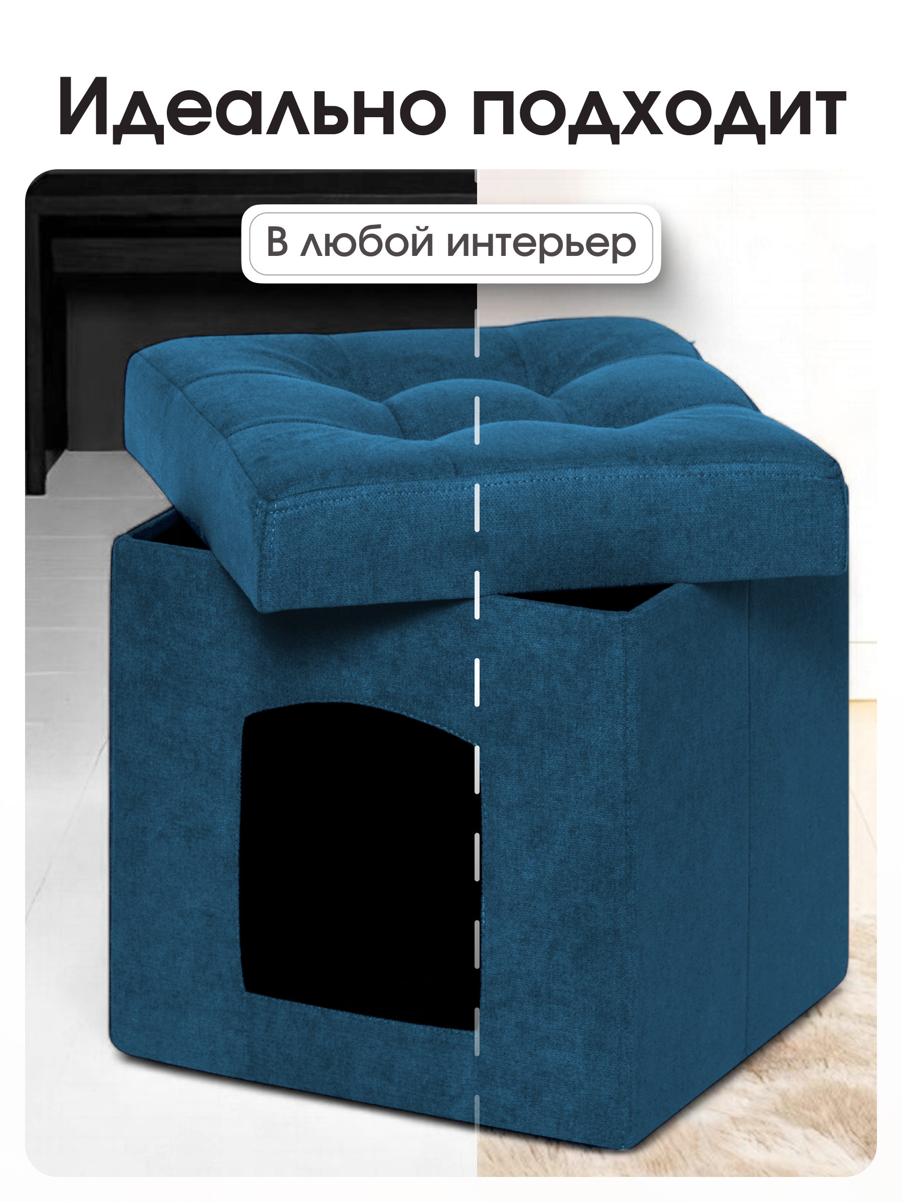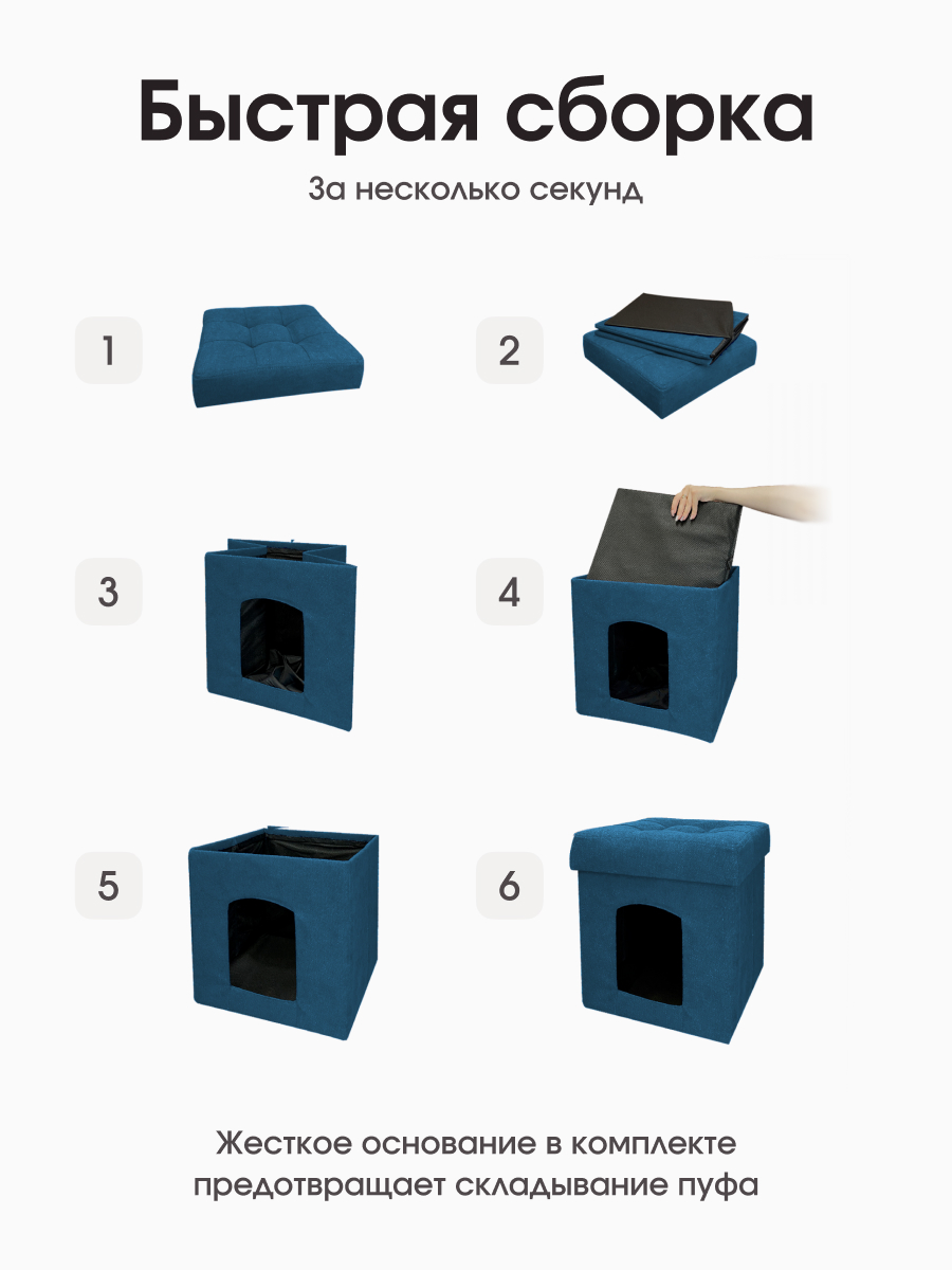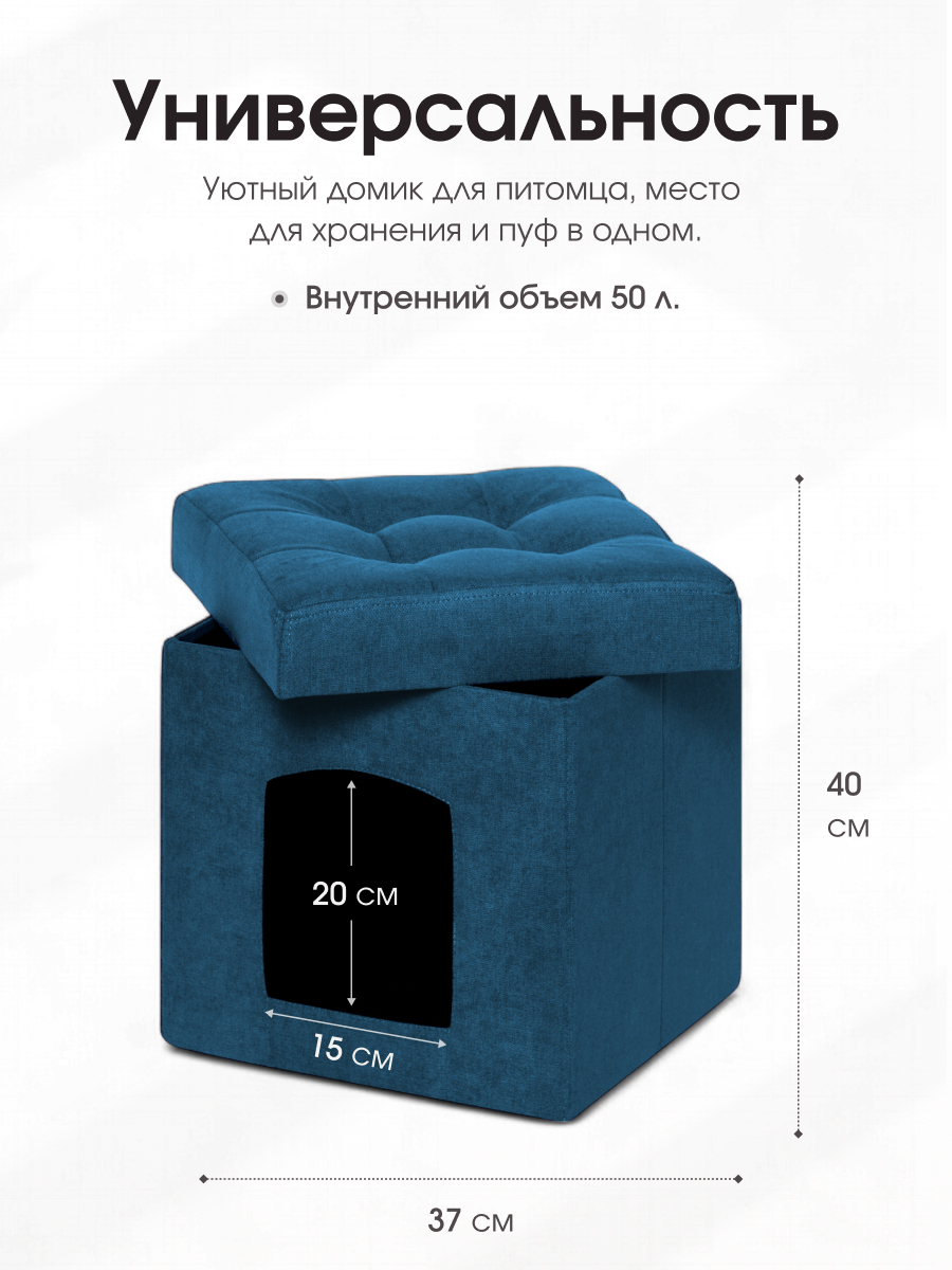 Характеристики пуфа: Материал – велюр EasyWay Clean. Материал легко чистится без моющих химических средств. Каркас – МДФ. Размер в собранном виде – 37*37*40 см Размер в сложенном виде – 37*37*7 см Выдерживает вес до 100 кг. Складной пуфик для животных – подойдет тем, кому важна многофункциональность мебели. Органично впишется в небольшую квартиру! Пуфик полностью складывается в свою же крышку, поэтому совсем не занимает места у вас дома. В собранном виде внутри у него достаточно места для кошки или небольшой собаки. Можно устроить там лежанку или использовать как есть. Рекомендуем вам использовать пуф для прихожей или гостиной, где нужно место, чтобы присесть, а питомцу – полежать. Домашние животные любят чувство защищенности, поэтому котики так часто залезают в коробки. Складной пуф для хранения закрыт со всех сторон, кроме единственной стенки, поэтому все питомцы с радостью проводят в нем время и спят без беспокойств. Такой складной пуф трансформер подойдет для путешествий со своим животным: небольшие размеры и компактность делают решающий выбор. Поэтому рекомендуем купить качественный пуф, который будет служить вам очень и очень долго! На всю продукцию гарантия 12 месяцев.