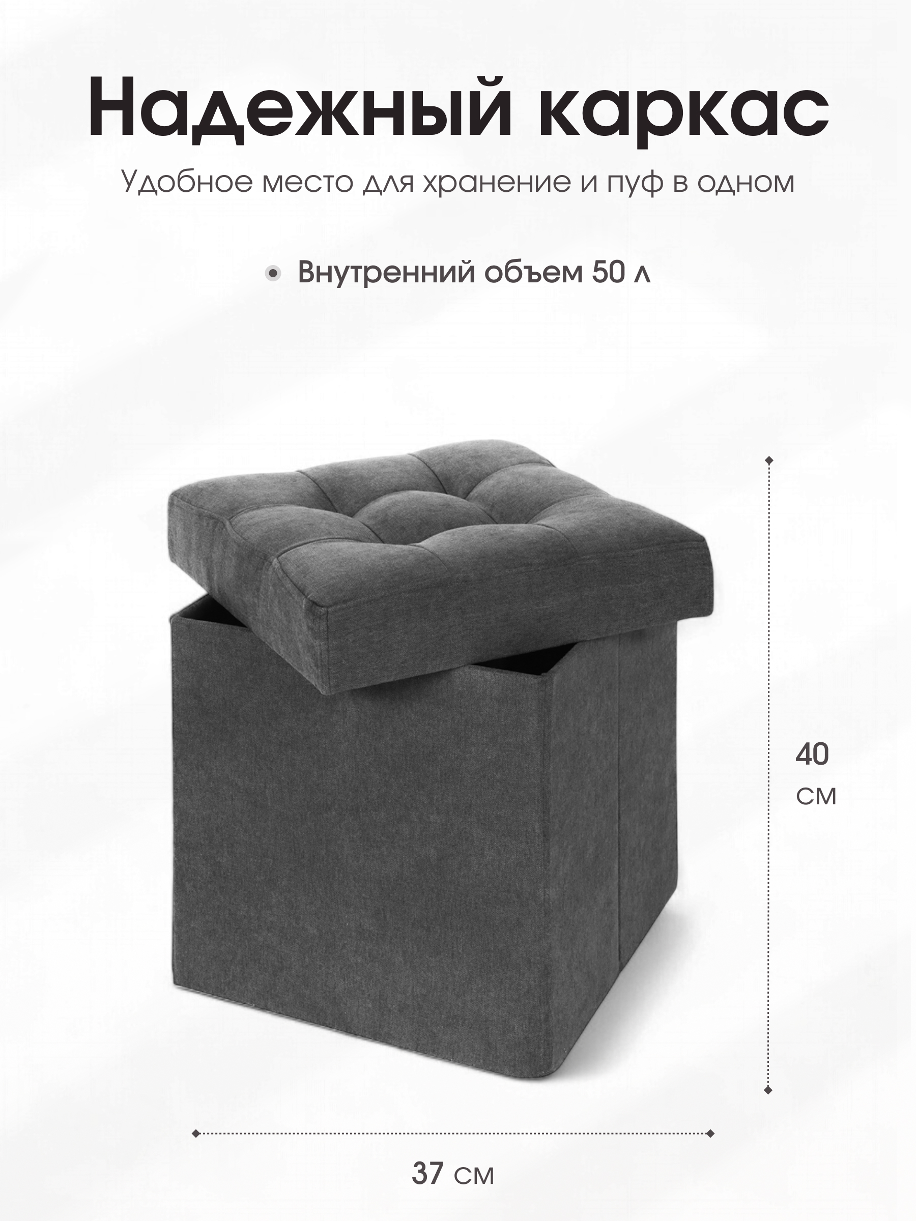 Размер: В собранном виде (ШхГхВ) 37*37*40 см В сложенном виде (ШхГхВ) 37*37*7 см Каркас: МДФ Внутри пуфа есть емкость для хранения вещей. Объем ящика - 50 литров. Материал наружной ткани – велюр Easy Way Clean. Максимальная нагрузка - 100 кг. Гарантия на пуф - 12 месяцев. Пуф складной, складывается полностью в крышку изделия. В сложенном виде пуфик занимает немного места, его легко хранить и перевозить. Вы можете заказать изготовление пуфика из любой ткани, представленной на нашем сайте. Благодаря удобной конструкции изделия его можно сложить и разложить в течение нескольких секунд. Поставляется в полиэтиленовой пленке.