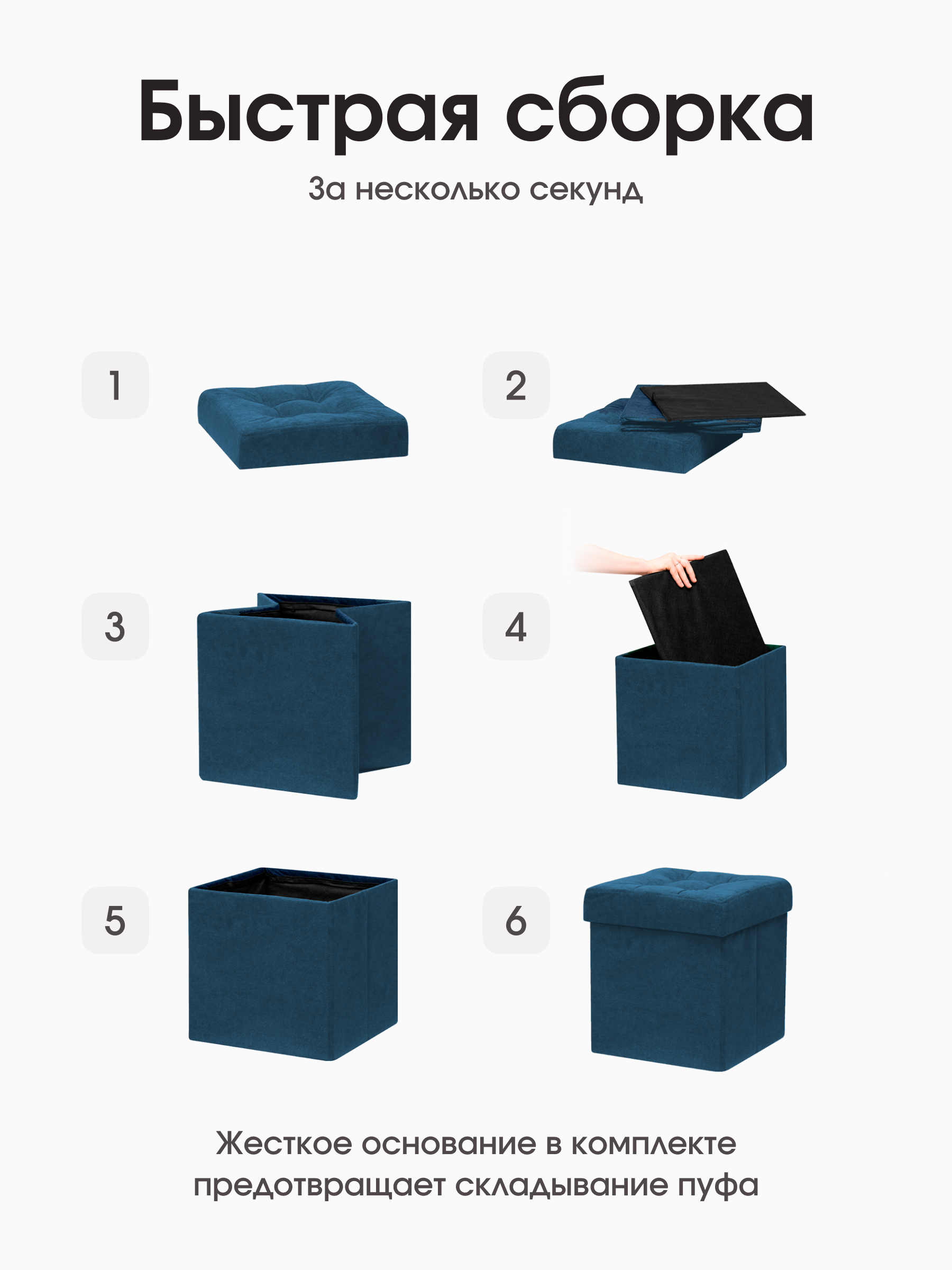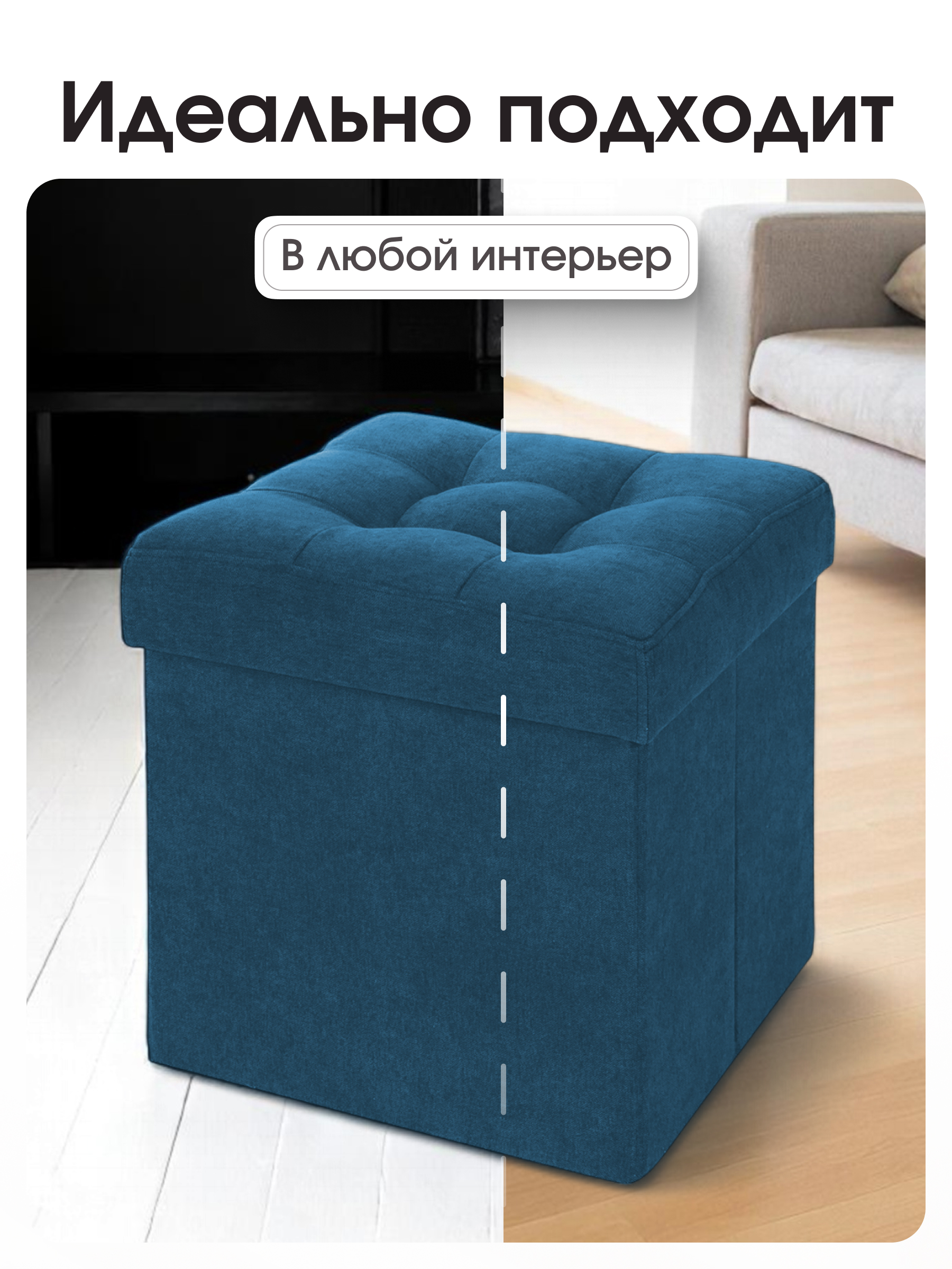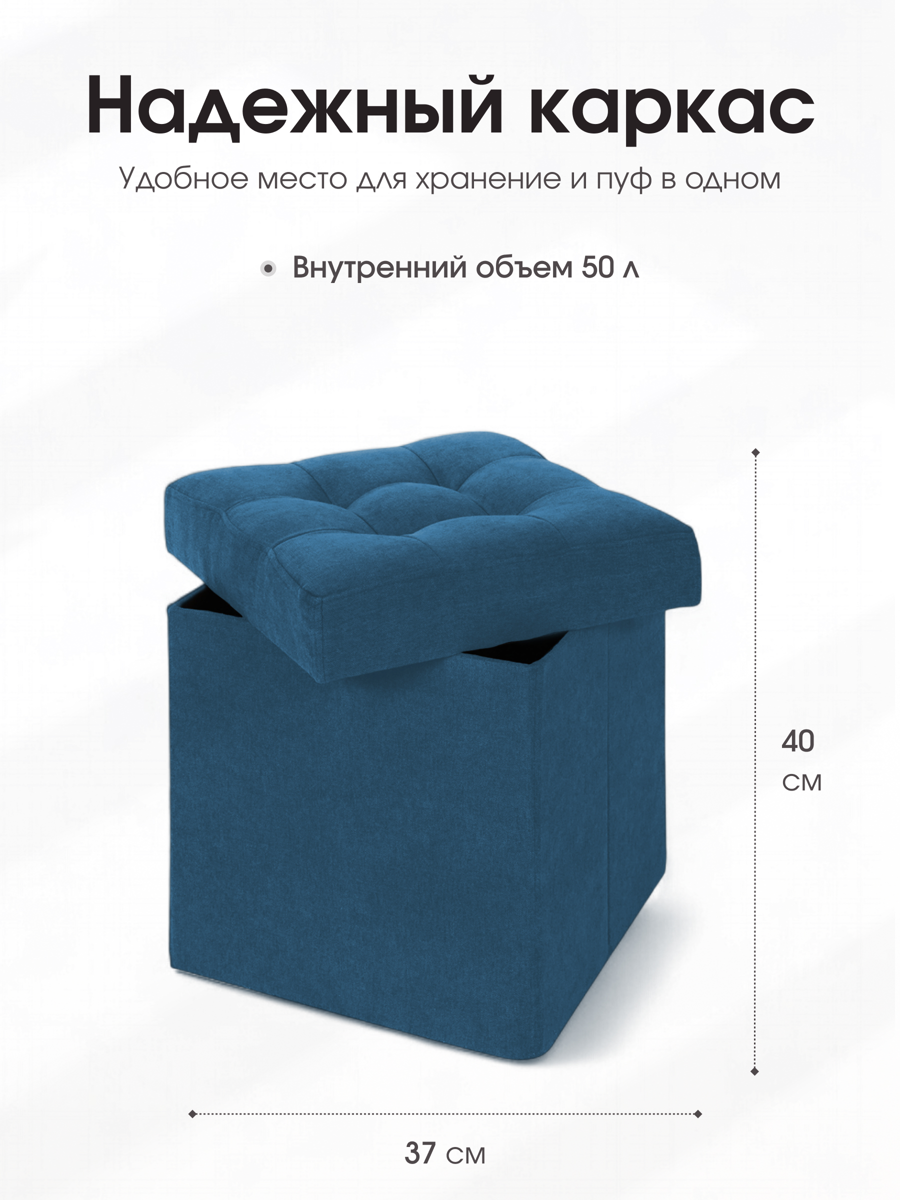Размер: В собранном виде (ШхГхВ) 37*37*40 см В сложенном виде (ШхГхВ) 37*37*7 см Каркас: МДФ Внутри пуфа есть емкость для хранения вещей. Объем ящика - 50 литров. Материал наружной ткани – велюр Easy Way Clean. Максимальная нагрузка - 100 кг. Гарантия на пуф - 12 месяцев. Пуф складной, складывается полностью в крышку изделия. В сложенном виде пуфик занимает немного места, его легко хранить и перевозить. Вы можете заказать изготовление пуфика из любой ткани, представленной на нашем сайте. Благодаря удобной конструкции изделия его можно сложить и разложить в течение нескольких секунд. Поставляется в полиэтиленовой пленке.