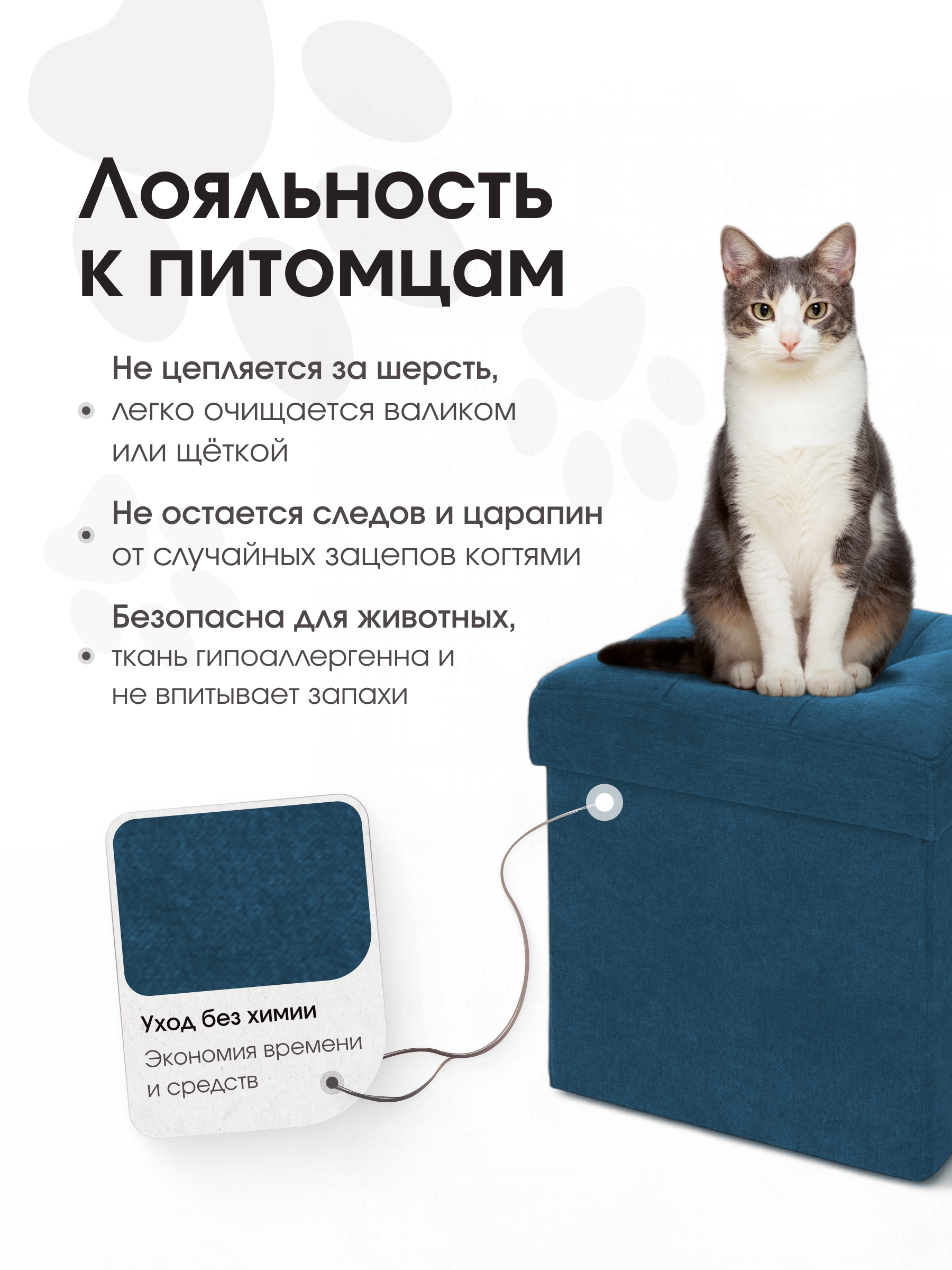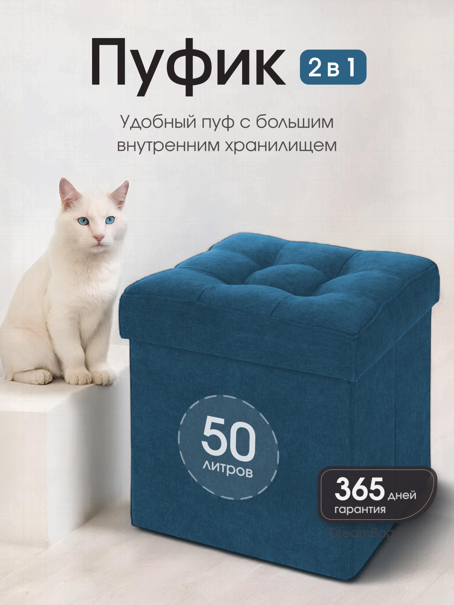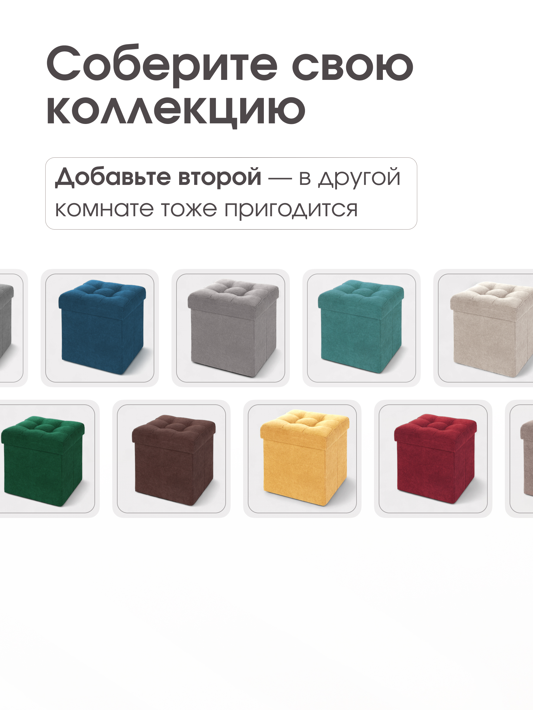 Размер: В собранном виде (ШхГхВ) 37*37*40 см В сложенном виде (ШхГхВ) 37*37*7 см Каркас: МДФ Внутри пуфа есть емкость для хранения вещей. Объем ящика - 50 литров. Материал наружной ткани – велюр Easy Way Clean. Максимальная нагрузка - 100 кг. Гарантия на пуф - 12 месяцев. Пуф складной, складывается полностью в крышку изделия. В сложенном виде пуфик занимает немного места, его легко хранить и перевозить. Вы можете заказать изготовление пуфика из любой ткани, представленной на нашем сайте. Благодаря удобной конструкции изделия его можно сложить и разложить в течение нескольких секунд. Поставляется в полиэтиленовой пленке.