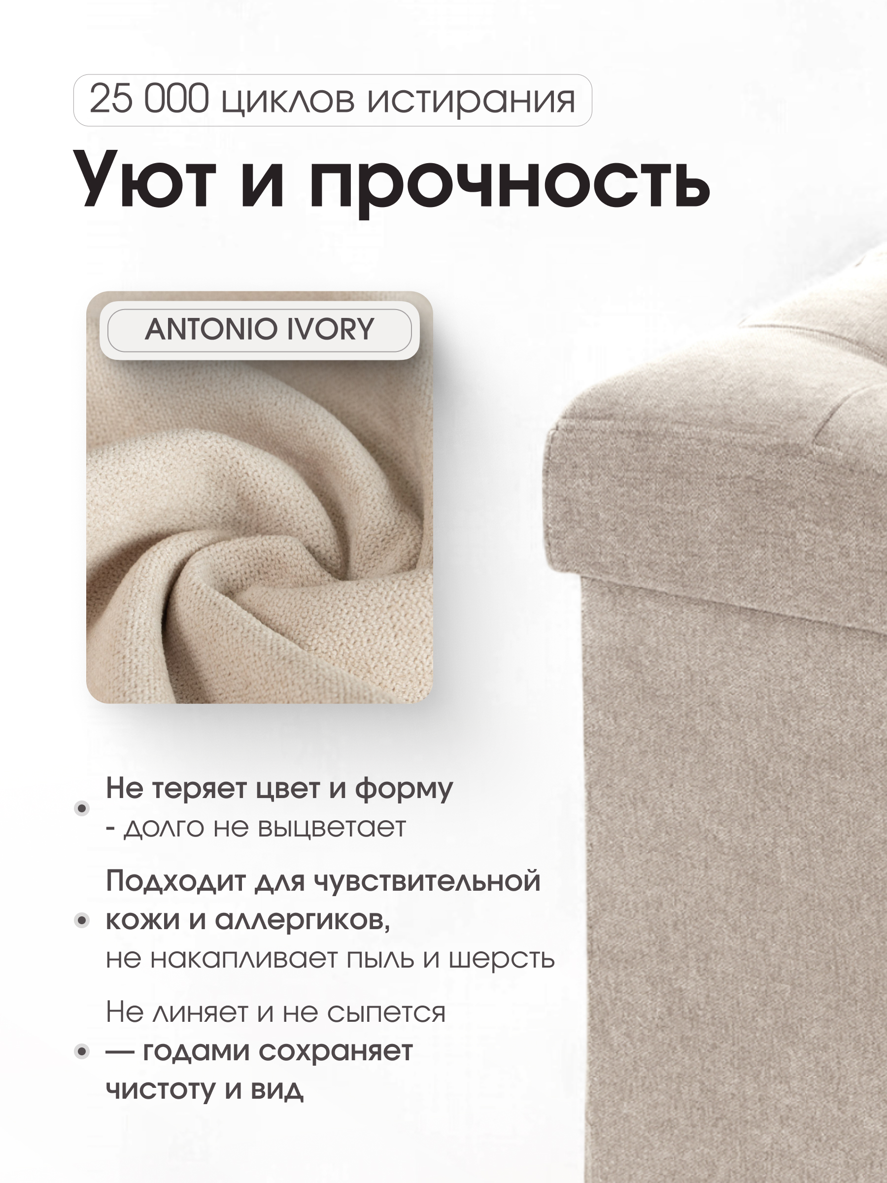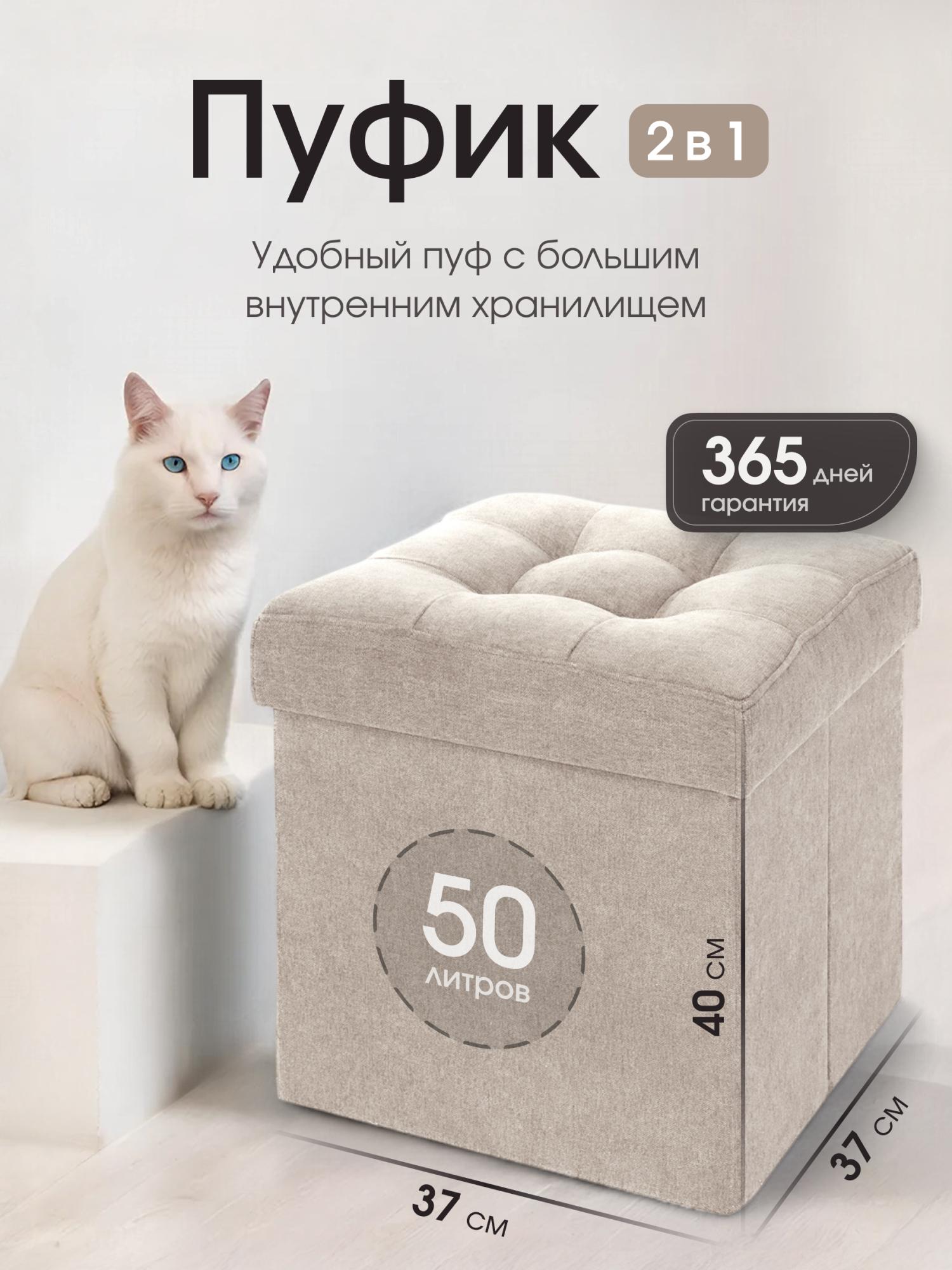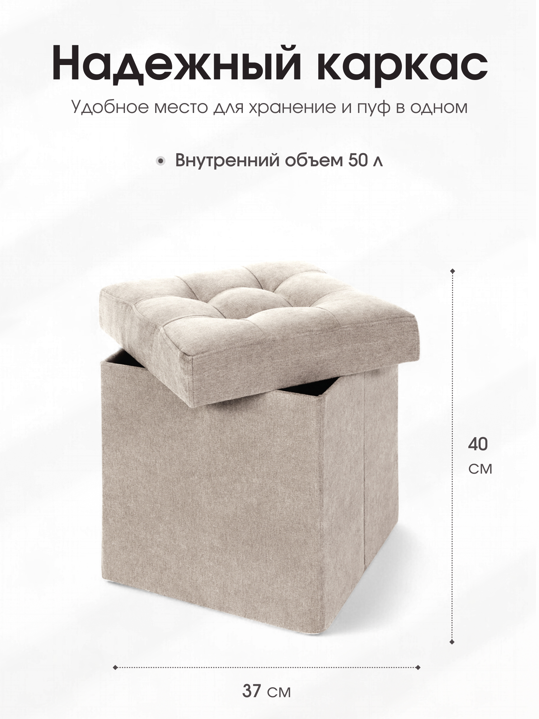 Размер: В собранном виде (ШхГхВ) 37*37*40 см В сложенном виде (ШхГхВ) 37*37*7 см Каркас: МДФ Внутри пуфа есть емкость для хранения вещей. Объем ящика - 50 литров. Материал наружной ткани – велюр Easy Way Clean. Максимальная нагрузка - 100 кг. Гарантия на пуф - 12 месяцев. Пуф складной, складывается полностью в крышку изделия. В сложенном виде пуфик занимает немного места, его легко хранить и перевозить. Вы можете заказать изготовление пуфика из любой ткани, представленной на нашем сайте. Благодаря удобной конструкции изделия его можно сложить и разложить в течение нескольких секунд. Поставляется в полиэтиленовой пленке.