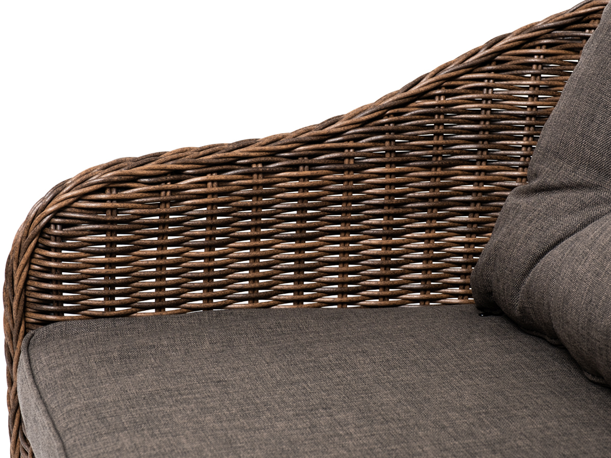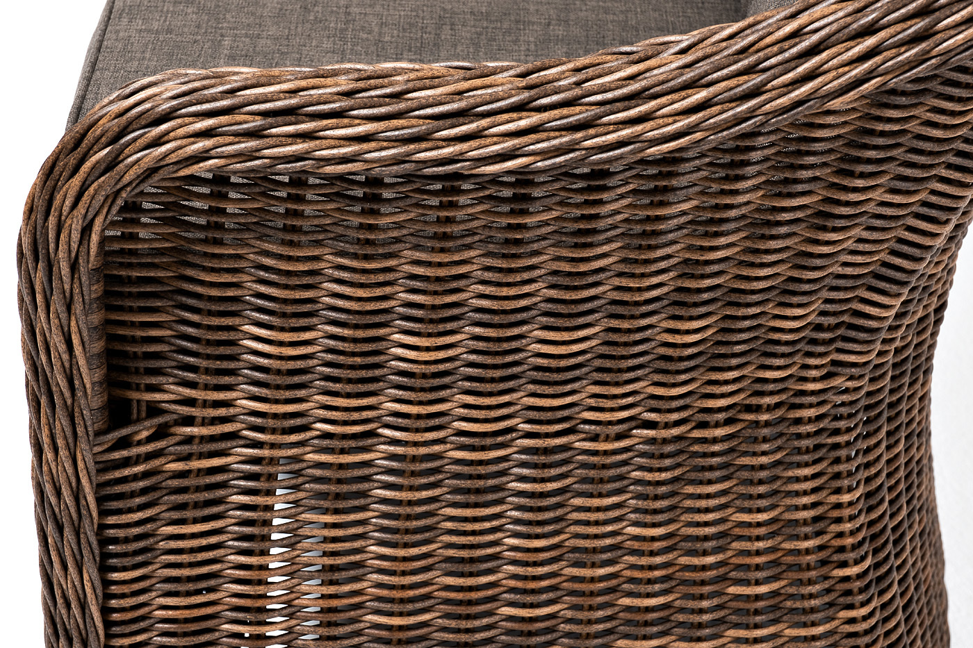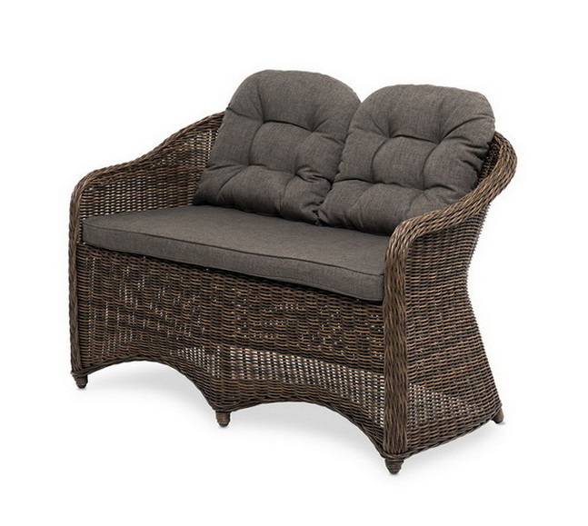 Диван выполнен из круглого искусственного ротанга, в основе алюминиевый каркас. Цвет коричневый.