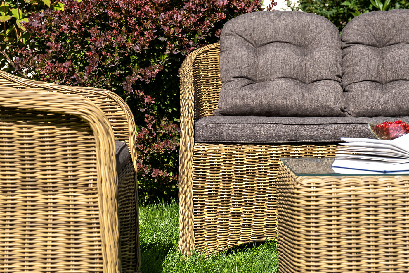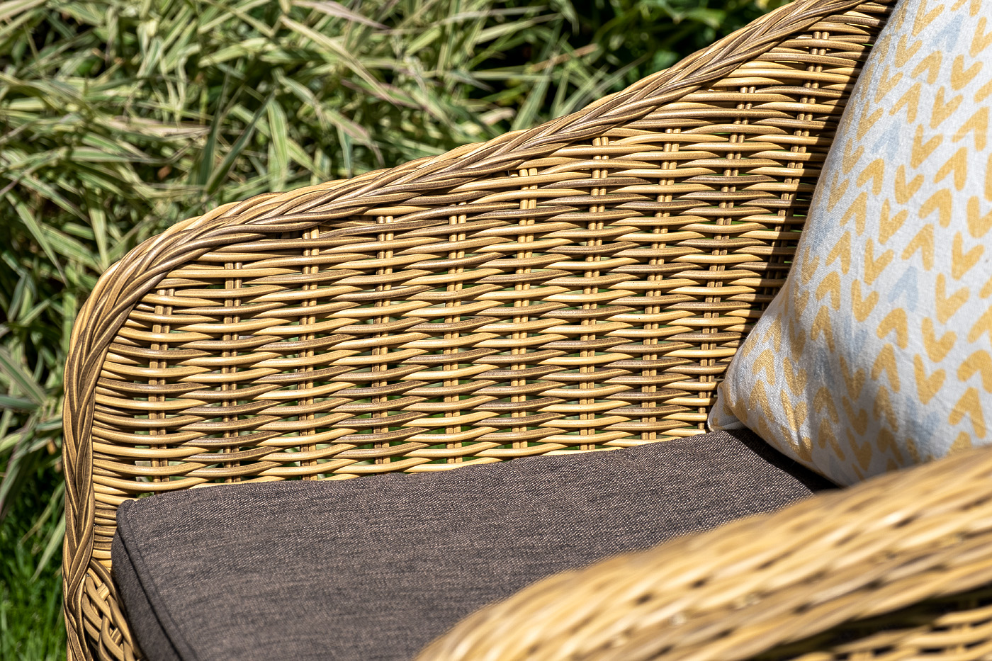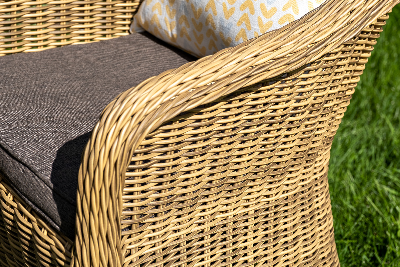 Комплект выполнен из круглого искусственного ротанга соломенного цвета. Каркас - из легкого и прочного алюминия. Подушки со съёмными чехлами - из 100% полиэстера, плотностью 300гр/м2 с влагоотталкивающей пропиткой. "Равенна" диван двухместный плетенный из ротанга, цвет соломенный 1шт. 1 180Х680Х810, "Равенна" плетеное кресло из искусственного ротанга, цвет соломенный 2шт. 570Х680Х810, "Кон Панна" столик журнальный из искусственного ротанга, цвет соломенный 1шт. 1 000Х500Х420,