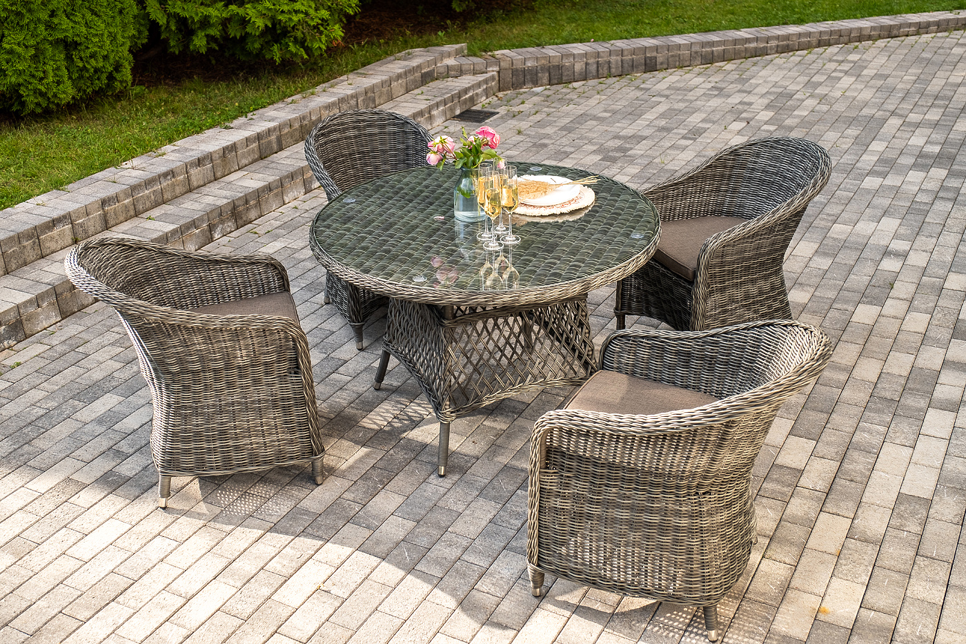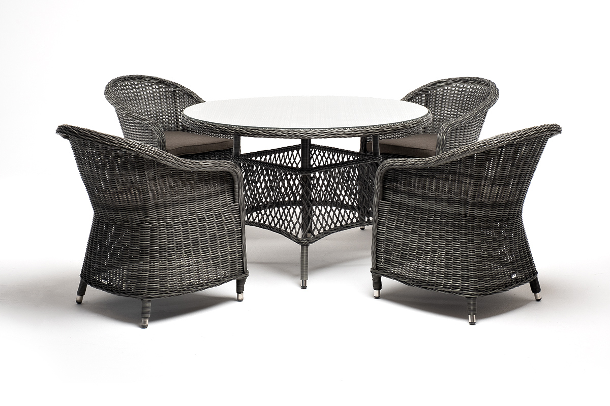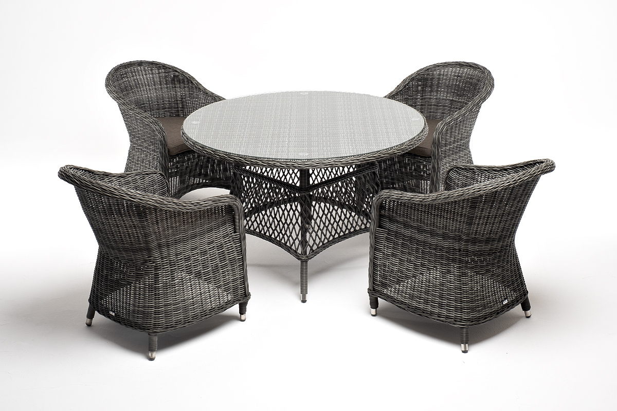 Вся мебель изготовлена из алюминия, поэтому ее очень легко перемещать. Декоративное покрытие выполнено из долговечного искусственного ротанга, устойчивого к перепадам температур и переменам погоды. Столешница изготовлена из прочного закаленного стекла 5 мм, кресла укомп "Эспрессо" плетеный круглый стол, диаметр 118 см, цвет графит 1шт. 1 180Х1 180Х750, "Равенна" плетеное кресло из искусственного ротанга, цвет графит 4шт. 570Х680Х810,