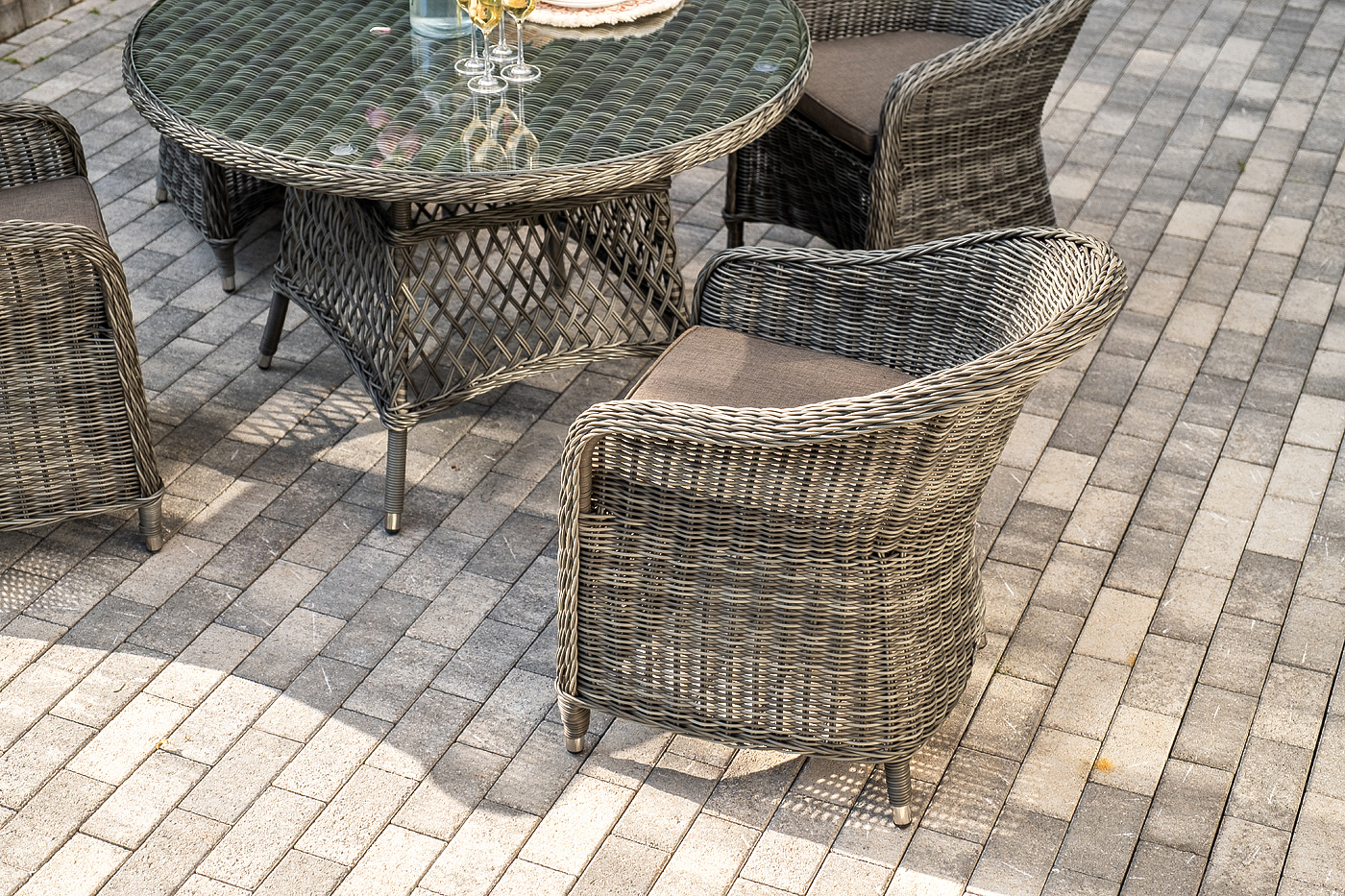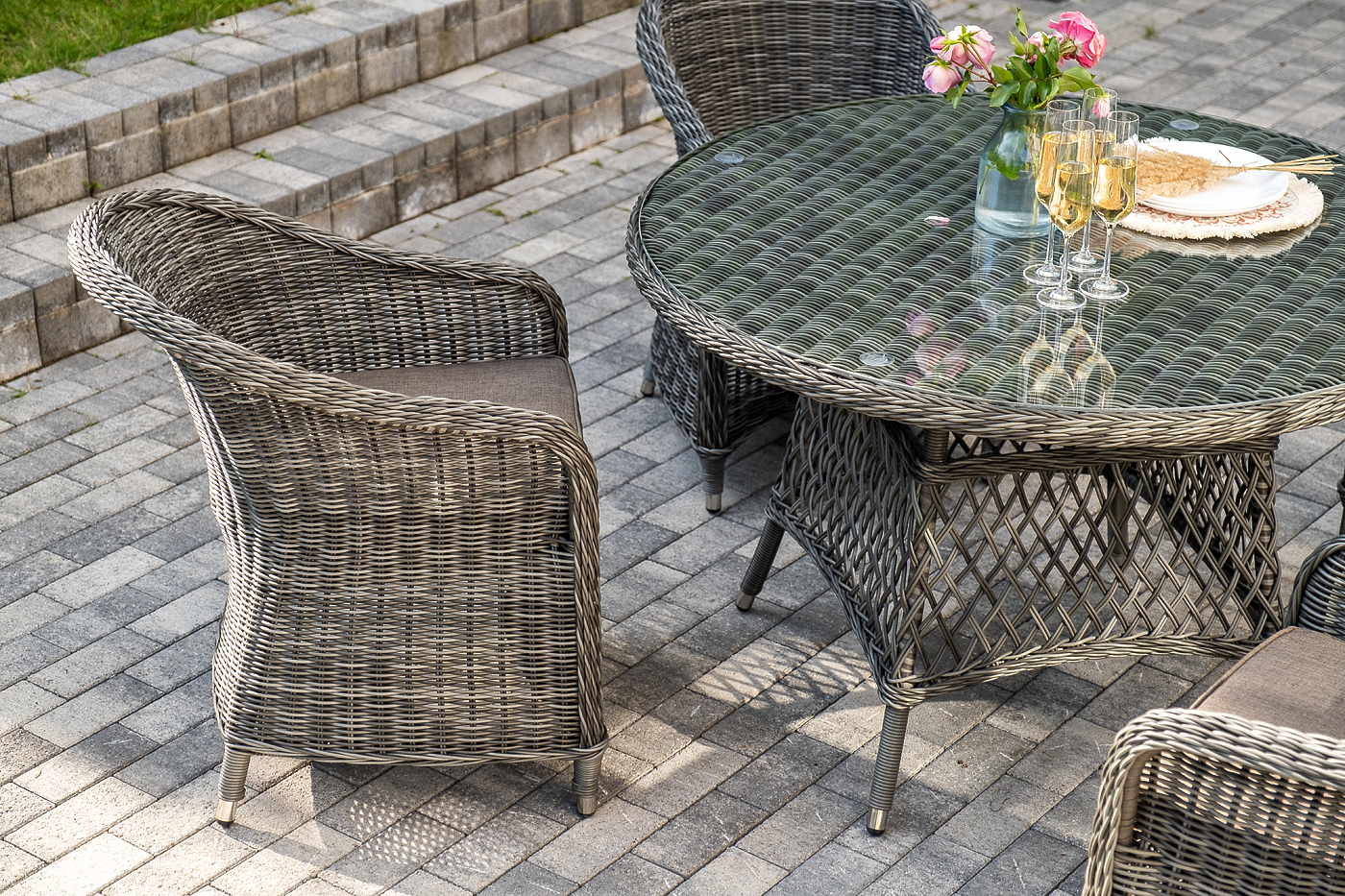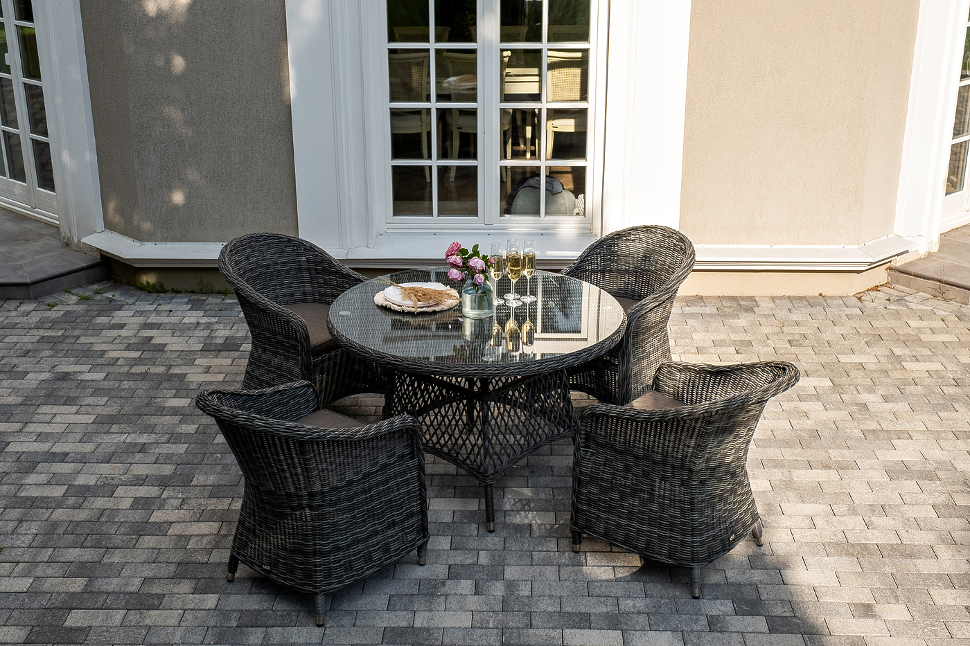 Вся мебель изготовлена из алюминия, поэтому ее очень легко перемещать. Декоративное покрытие выполнено из долговечного искусственного ротанга, устойчивого к перепадам температур и переменам погоды. Столешница изготовлена из прочного закаленного стекла 5 мм, кресла укомп "Эспрессо" плетеный круглый стол, диаметр 118 см, цвет графит 1шт. 1 180Х1 180Х750, "Равенна" плетеное кресло из искусственного ротанга, цвет графит 4шт. 570Х680Х810,