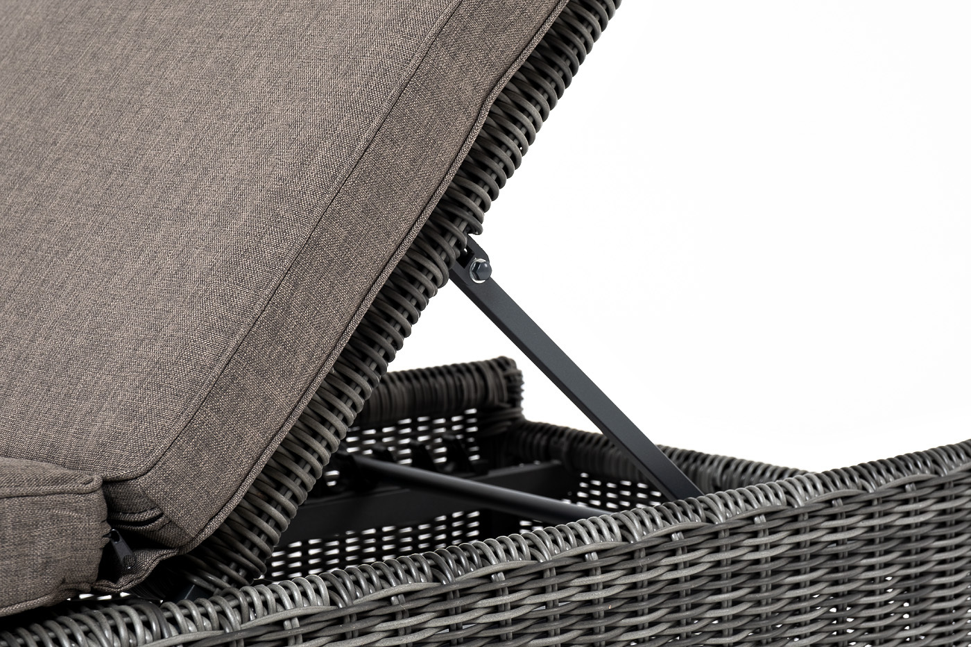 Дополнительно к шезлонгу прилагаются мягкие подушки из полиэфирной ткани, которая обладает стойкостью к ультрафиолету, воде. Съёмные чехлы серого цвета. Для удобства можно отрегулировать наклон спинки лежака.