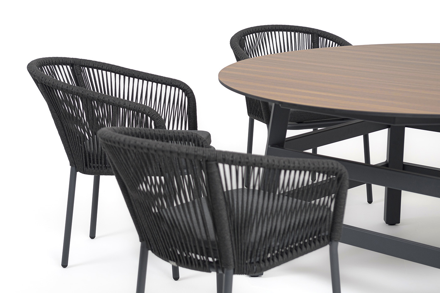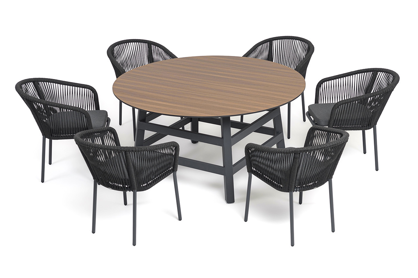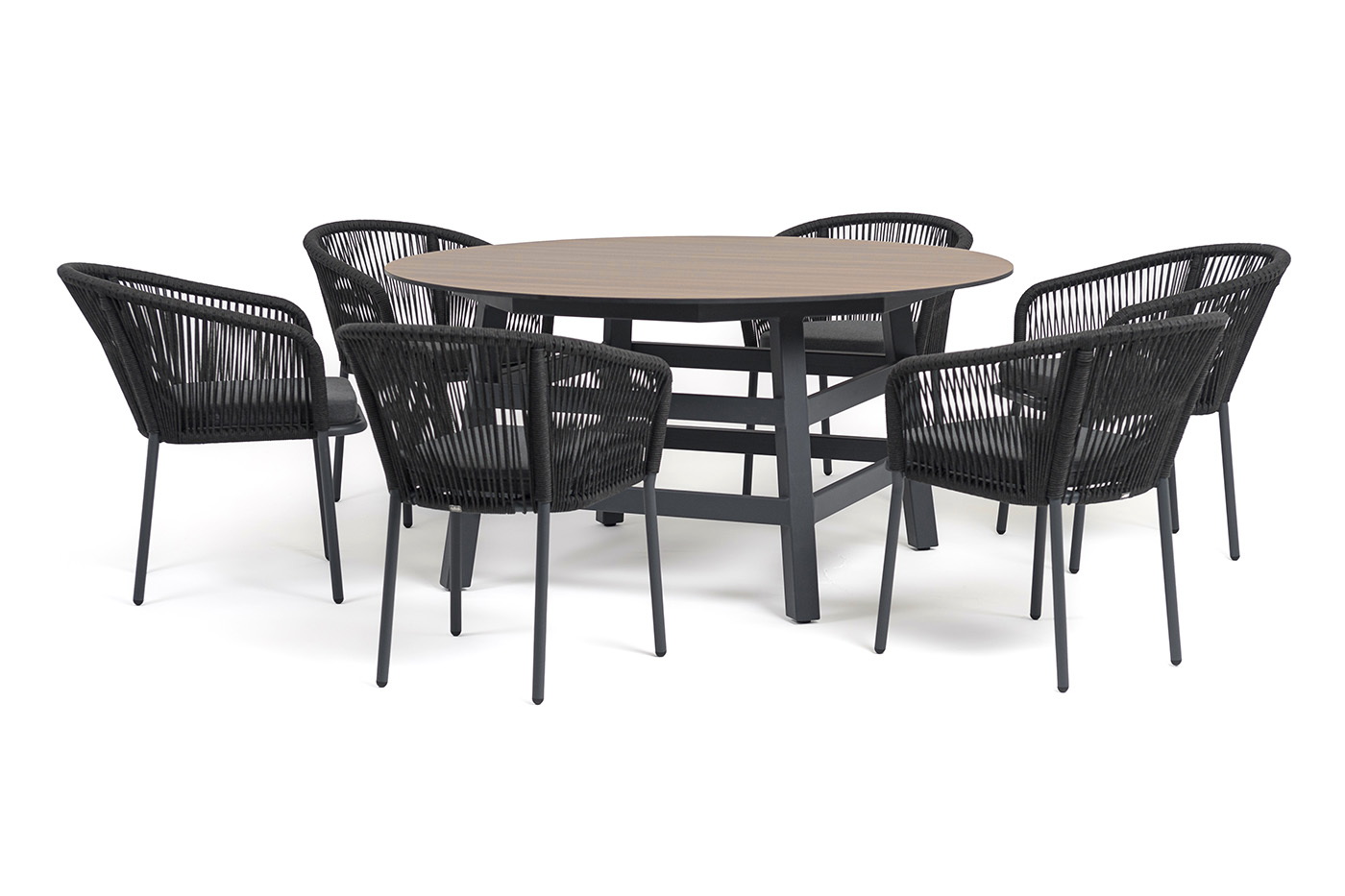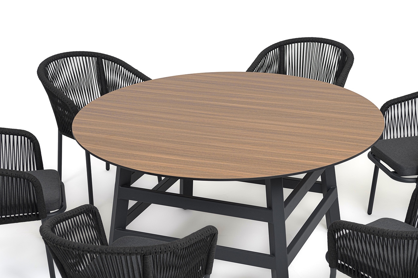 - 6 плетеных стульев «Марсель» из роупа, размером - 570×620×775 мм, цвет роупа - темно-серый, каркас из алюминия, окрашен порошковой краской в темно-серый оттенок. "Рио" стол из HPL круглый Ø160см, H75, цвет столешницы "дуб" 1шт. 1 600Х1 600Х750, "Марсель" стул плетеный из роупа, каркас алюминий темно-серый (RAL7024) муар, роуп темно-серый круглый, ткань темно-серая 027 6шт. 570Х620Х775,