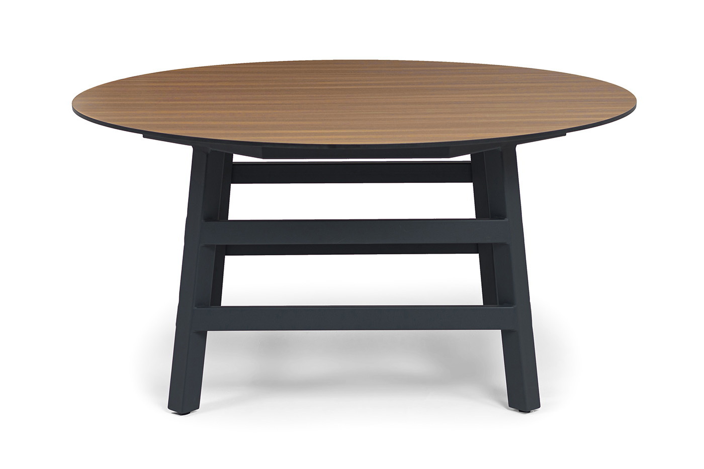 Размер стола - 1600×1600×750 мм. Столешница изготовлена из компакт-пластика HPL c рисунком цвета «дуб».
