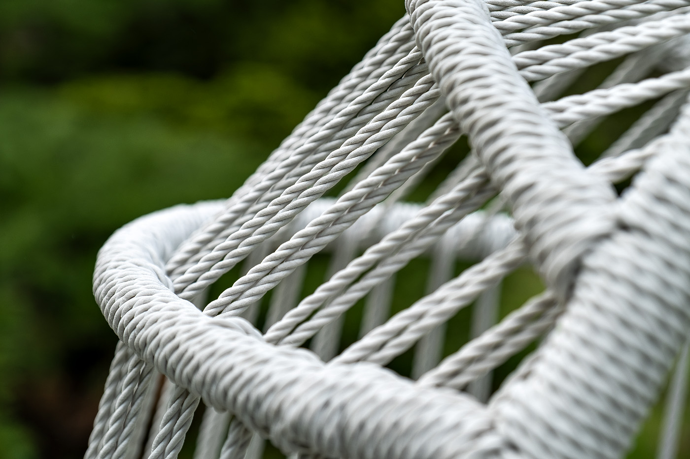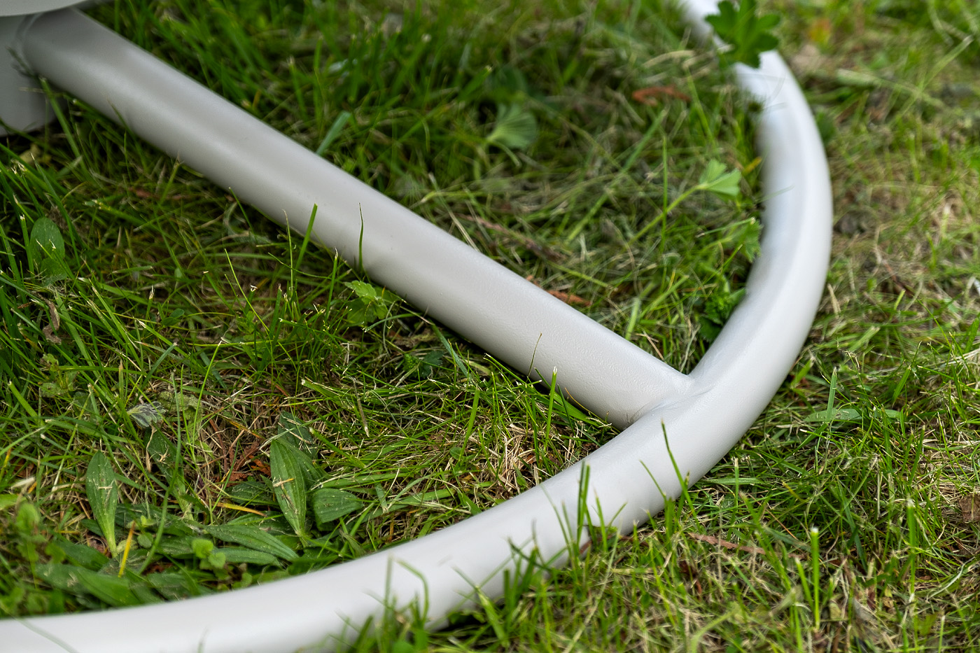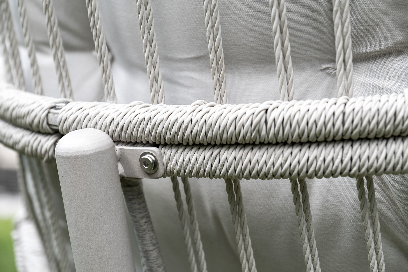 Каркас изготовлен из стали, окрашенного порошковой износостойкой краской белого цвета. Оплетка – плоский искусственный ротанг светло-серого оттенка. Материал устойчив к перепадам погоды и подходит для использования на открытых пространствах.