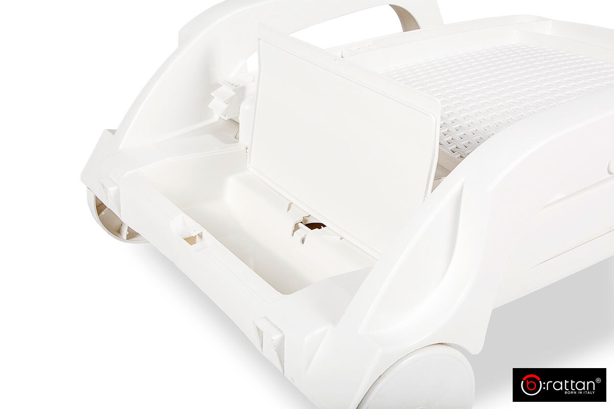 Лежак изготовлен из качественного штампованного пластика с модной, напоминающей ротанг, фактурой поверхности.
