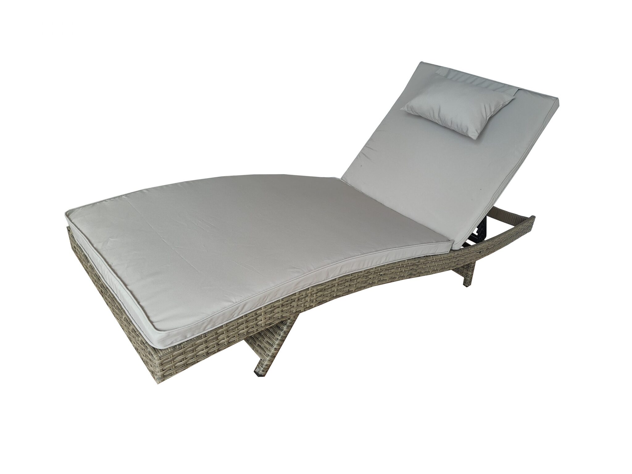 Плетеный шезлонг МАРА «MARA» с матрасом — Greige , изготовленный из стального каркаса с порошковым покрытием и ручным плетением из искусственного ротанга имеет 4-е положения регулировки подголовника.