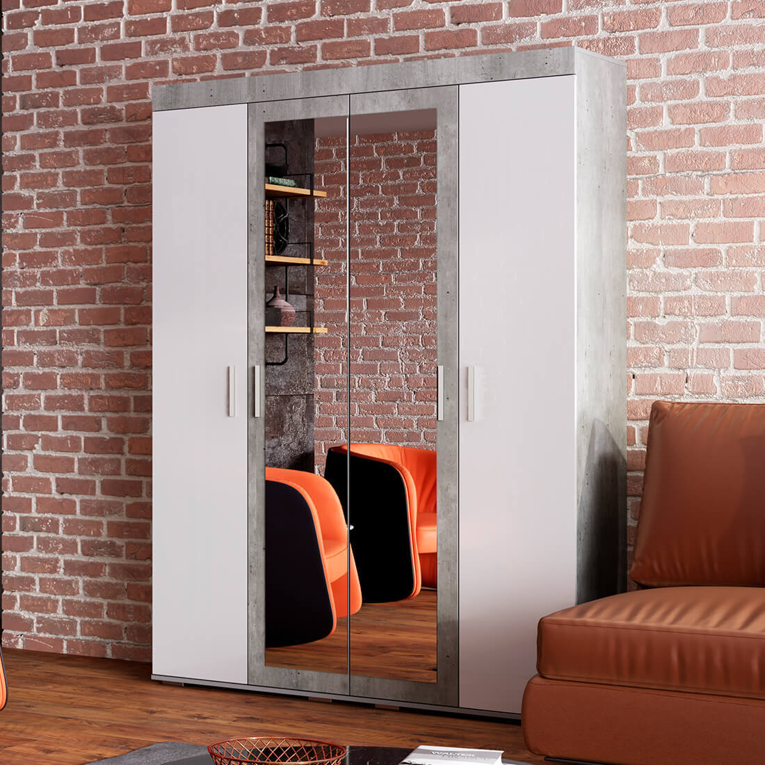 Шкаф для белья Инстайл ШК-31 в цвете бетон/белый — это стильный и функциональный элемент интерьера, который добавит комфорт и порядок в вашу спальню. Он имеет четыре дверцы, две из которых зеркальные, и два отделения со штангами для вешалок. Внутри также предусмотрены верхние и нижние полки для хранения различных предметов гардероба. Современный дизайн шкафа гармонично впишется в интерьер комнаты и создаст атмосферу уюта и стиля.