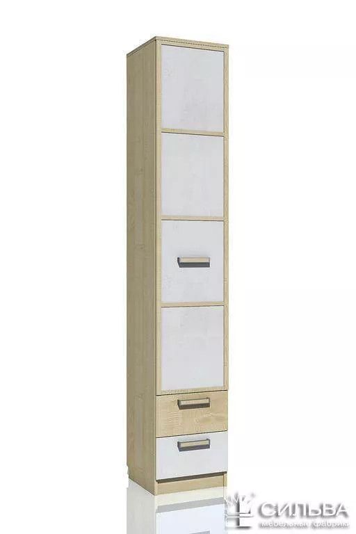 Шкаф для белья НМ 013.01-02 с ящиками «Фанк» - это замечательный и удобный пенал с ящиками. Он отлично дополняет шкафную группу распашных шкафов. Данная модель удобна своим расположением ящиков. Фасады последних исполнены в монотонном окрасе, разных цветов - один дуб Сонома, другой скандинавский белый. Распашная дверца исполнена в сегментном стиле.