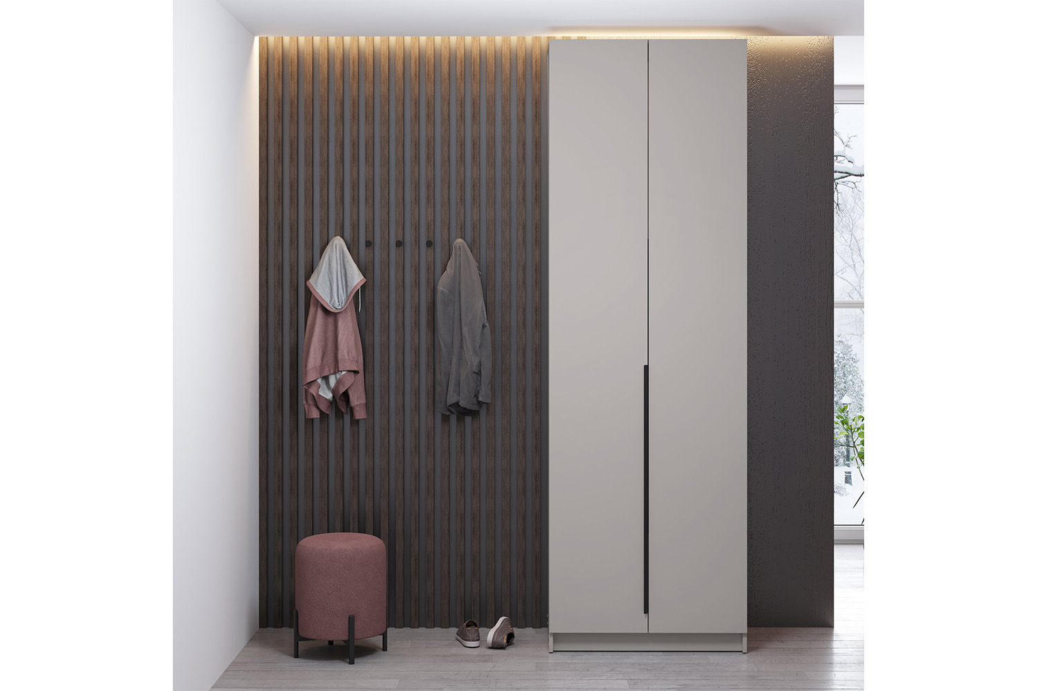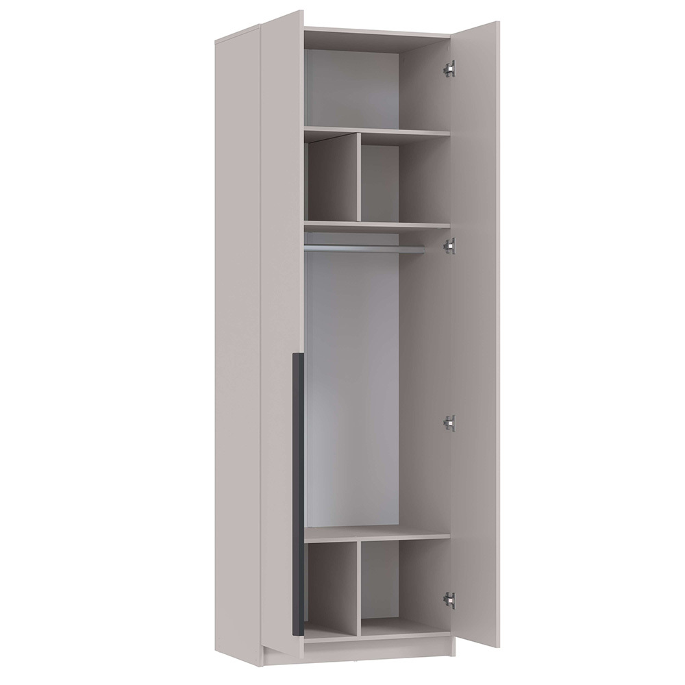 Шкаф для одежды Брандо 67.14 — небольшой двухдверный шкаф – отличное решение как для небольшой спальни, так и для прихожей или балкона. За распашными дверями расположено одно отделение со штангой и несколько полок. Две удобные ниши в нижней части шкафа подойдут для обуви, коробок или органайзеров. В верхней части шкафа расположены три ниши – для хранения одежды, аксессуаров или головных уборов. Особенности: - Материал корпуса: ЛДСП - Материал фасада: МДФ + пленка ПВХ - Петли с доводчиками - Ручки: Металл - Опоры: Цоколь - Штанга для вешалок: Металл