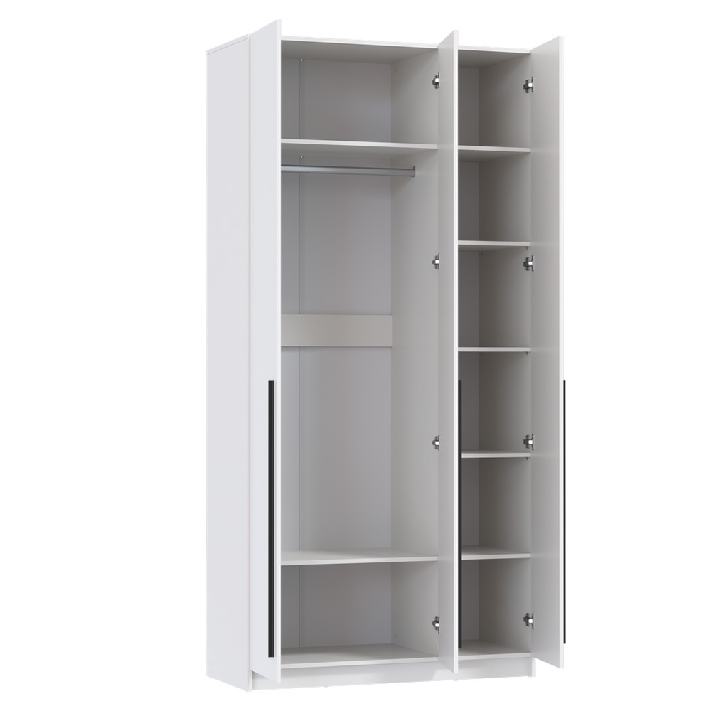 Шкаф для одежды Брандо 67.08 – стильный распашной трехстворчатый шкаф в минималистичном современном стиле. Пространство за створками разделено на два сегмента. За одной дверцей — бельевые полки. Они высокие и широкие: можно ставить коробки и органайзеры, помогающие поддерживать порядок. Второй сегмент — с металлической штангой — позволит развесить одежду на плечиках. Над штангой обустроена антресольная полка, на которой будет удобно хранить головные уборы, в нижней части шкафа еще одна ниша для обуви или коробок. Особенности: - Материал корпуса: ЛДСП - Материал фасада: МДФ с пленкой ПВХ - Петли без доводчиков - Ручки: Металл - Опоры: Цоколь - Штанга для вешалок: Металл