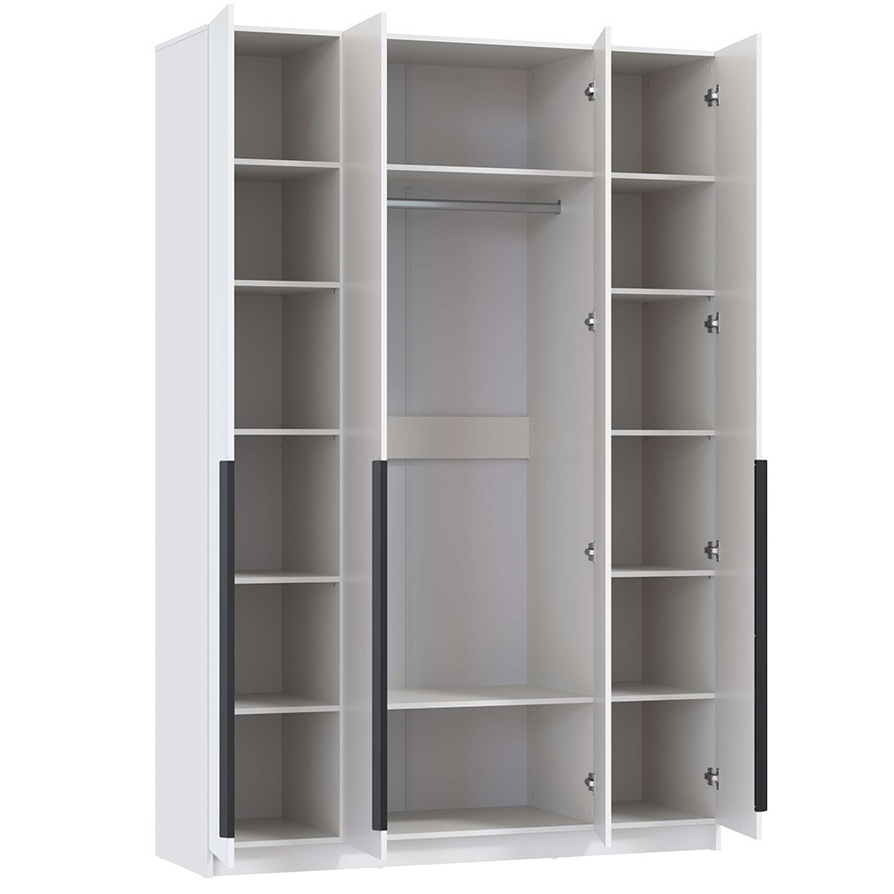 Большие шкафы дают много места для хранения ваших вещей, белья и одежды. Красивая и удобная модель – шкаф для одежды Брандо 67.13. В дизайне ничего лишнего, внутреннее пространство шкафа разделено на несколько уровней и полок, что позволяет организовать одновременное хранение одежды, обуви, аксессуаров и других предметов различных размеров. Четыре распашных двери с удобными ручками обеспечивают удобный доступ к содержимому. В среднем отделении за 2 дверьми расположена штанга, антресольная полка и полка для обуви. За боковыми дверцами – по 5 полок. Заднюю стенку шкафа усиливает дополнительная панель – она укрепляет модуль и делает его более прочным. Эта модель станет практичным выбором для спального интерьера или просторной прихожей. Особенности: - Материал корпуса: ЛДСП - Материал фасада: ЛДСП - Петли с доводчиками - Ручки: Металл - Опоры: Цоколь - Штанга для вешалок: Металл