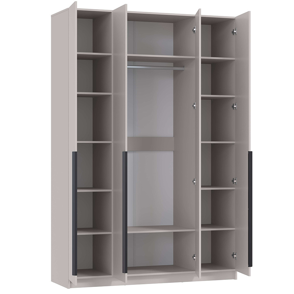 Большие шкафы дают много места для хранения ваших вещей, белья и одежды. Красивая и удобная модель – шкаф для одежды Брандо 67.13. В дизайне ничего лишнего, внутреннее пространство шкафа разделено на несколько уровней и полок, что позволяет организовать одновременное хранение одежды, обуви, аксессуаров и других предметов различных размеров. Четыре распашных двери с удобными ручками обеспечивают удобный доступ к содержимому. В среднем отделении за 2 дверьми расположена штанга, антресольная полка и полка для обуви. За боковыми дверцами – по 5 полок. Заднюю стенку шкафа усиливает дополнительная панель – она укрепляет модуль и делает его более прочным. Эта модель станет практичным выбором для спального интерьера или просторной прихожей. Особенности: - Материал корпуса: ЛДСП - Материал фасада: МДФ + пленка ПВХ - Петли с доводчиками - Ручки: Металл - Опоры: Цоколь - Штанга для вешалок: Металл