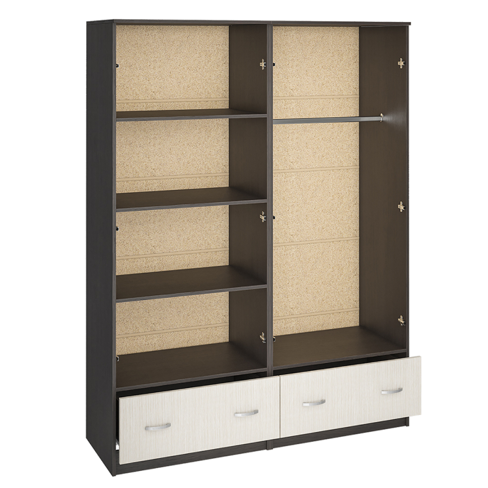 Вместительный прямой шкаф с продуманным наполнением. Состоит из двух двустворчатых шкафов. Стационарная штанга, комплект полок и два выдвижных ящика – все Ваши вещи будут храниться в порядке.