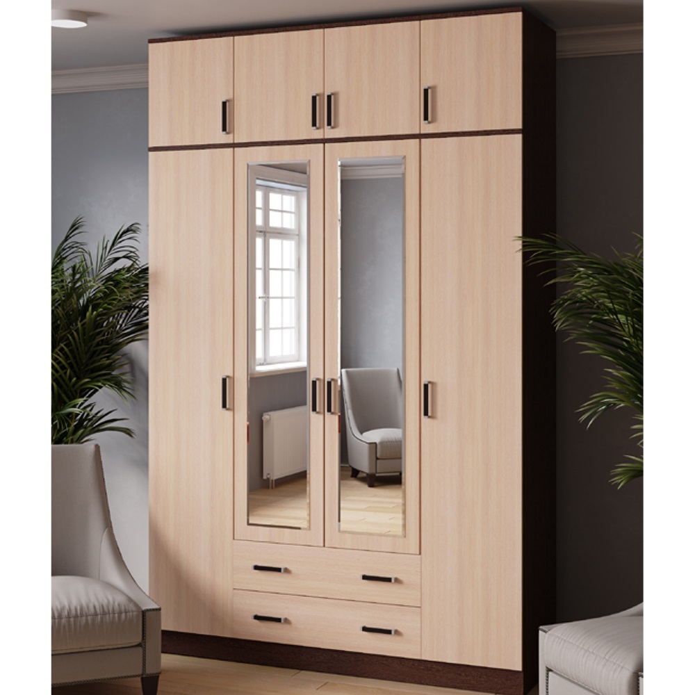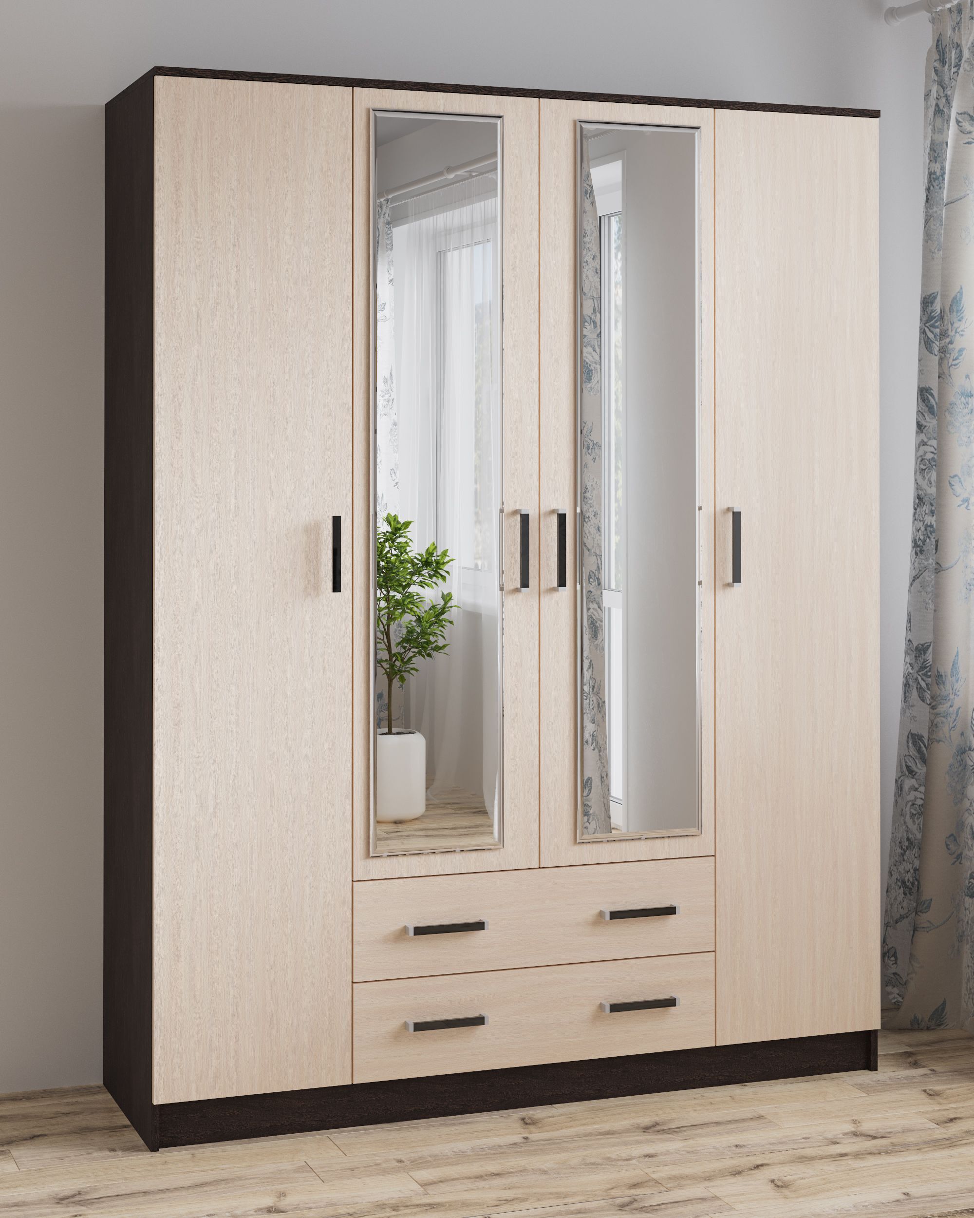 Шкаф комбинированный с антресолью Лагуна шириной 160 см оснащен двумя зеркалами, полками, платяным отделом и выдвижными ящиками. Организуйте место хранения одежды, белья, аксессуаров в одном месте. Благодаря гармоничным пропорциям и универсальному дизайну шкаф будет гармонично смотреться с современной обстановке.