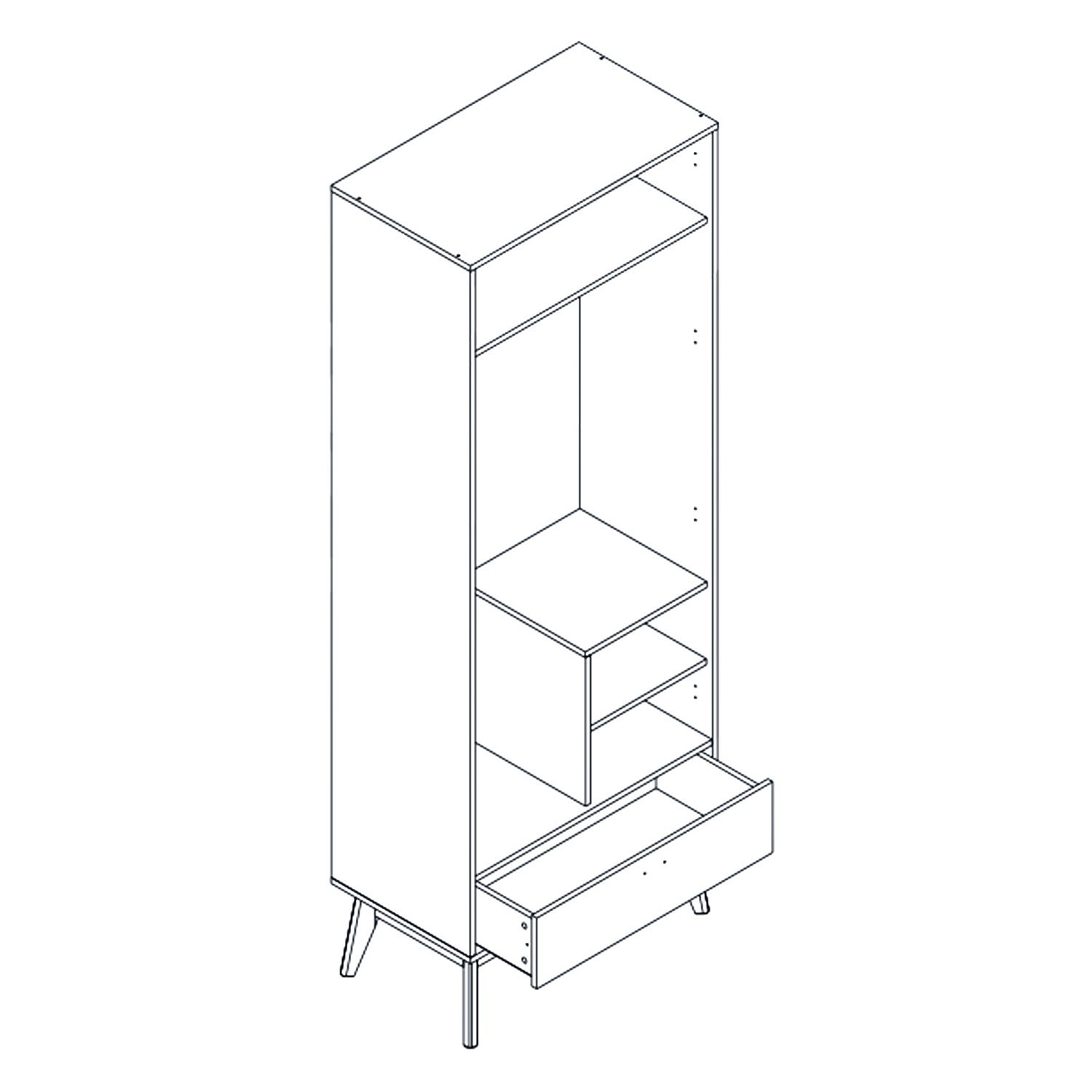 Шкаф с вкладными боками соединенные полкой, разделен на два отделения: верхнее закрыто двумя дверями, за которыми располагается штанга, внизу расположен ящик на шариковых направляющих.