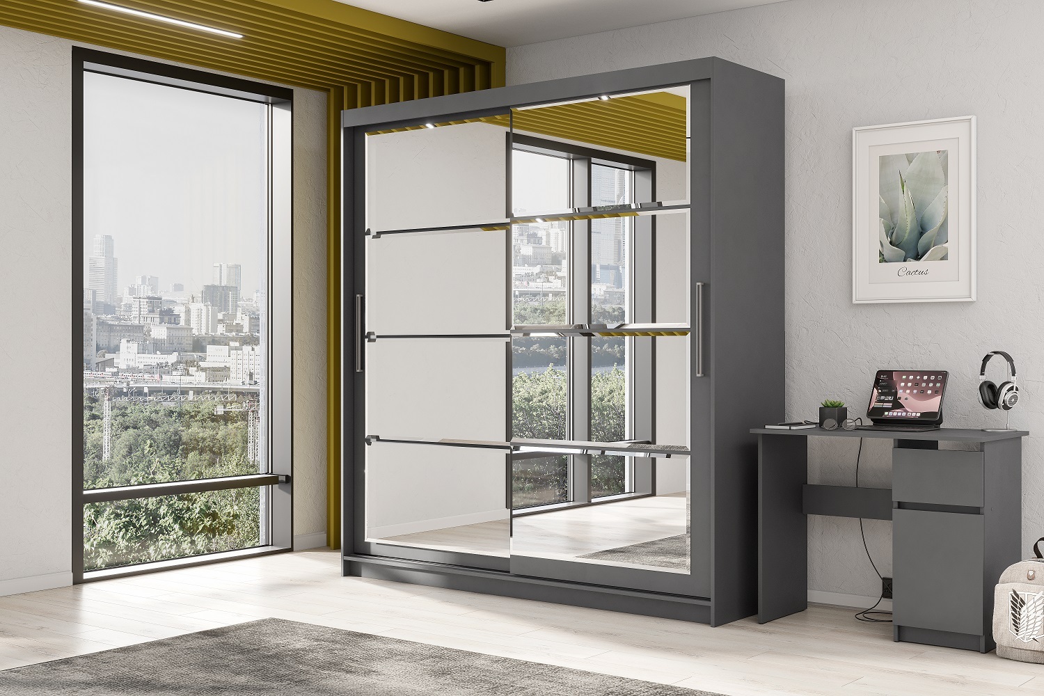 Внутреннее наполнение шкафа включает удобные полки и два выдвижных ящика с одной стороны, а также вместительную платяную секцию с надёжной металлической штангой для одежных вешалок за другой створкой. Нижнеопорная система раздвижных створок обеспечивает лёгкое и ровное открытие.