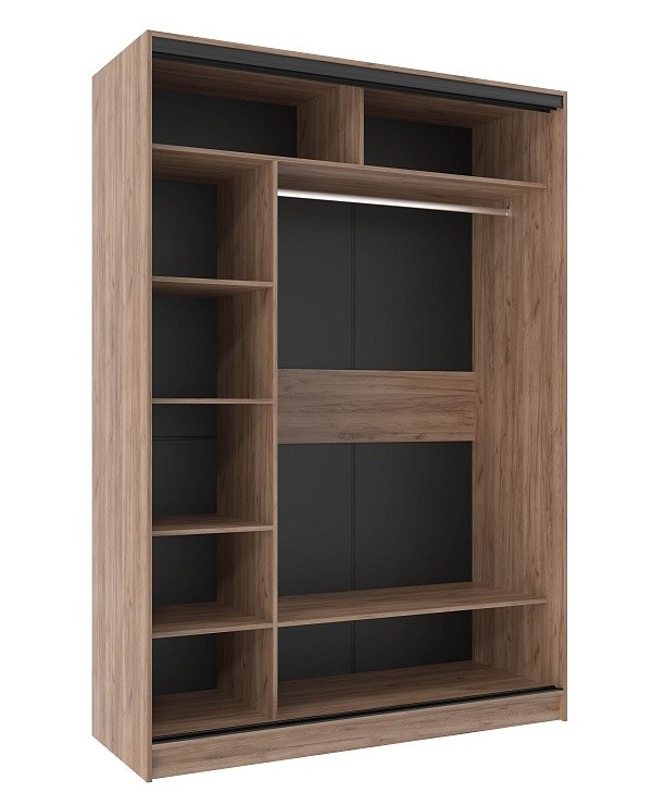 Вшкафу-купе шириной 160 смнайдется место для гардероба всей семьи. Разместите в нем бельё, верхнюю одежду и аксессуары. Продуманное внутреннее наполнение шкафа состоит из стеллажа для белья, четырех больших ниш внизу и вверху, а также стационарной штанги длиной больше метра. Две двери настальном профиле "Найди"в цвет основного декора шкафа плавно перемещаются. Если нужно взять вещи из шкафа в темное время суток и при этом не разбудить супруга, установитеКарниз 202 Домашнийс подсветкой.