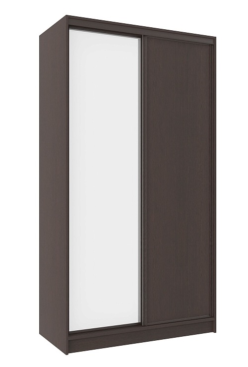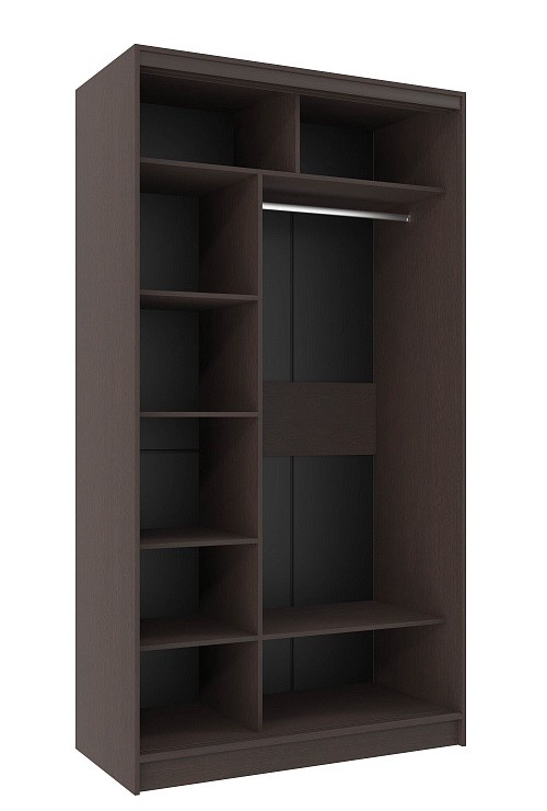 Вшкафу-купе шириной 120 смнайдется место для гардероба всей семьи. Разместите в нем бельё, верхнюю одежду и аксессуары. Продуманное внутреннее наполнение шкафа состоит из стеллажа для белья, четырех больших ниш внизу и вверху, а также стационарной штанги. Две двери настальном профиле "Найди"в цвет основного декора шкафа плавно перемещаются. Если нужно взять вещи из шкафа в темное время суток и при этом не разбудить супруга,установитеКарниз 202 Домашнийс подсветкой (опция).