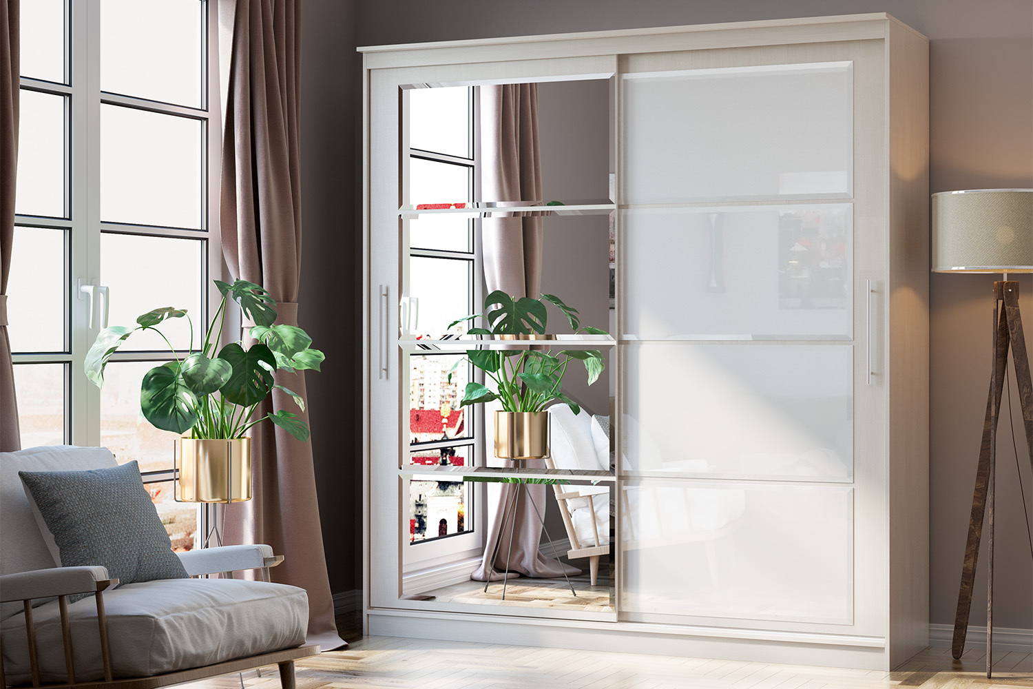 Шкаф-купе Элегант — это стильное и функциональное решение для вашего интерьера. Его элегантный дизайн и современная отделка создают атмосферу свежести и простора. Этот шкаф оборудован удобными дверцами, а также зеркалами.