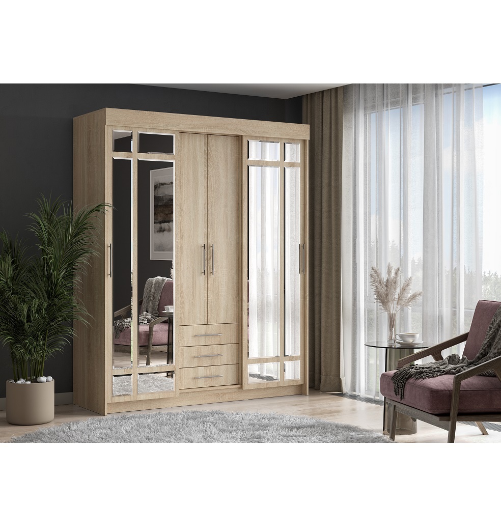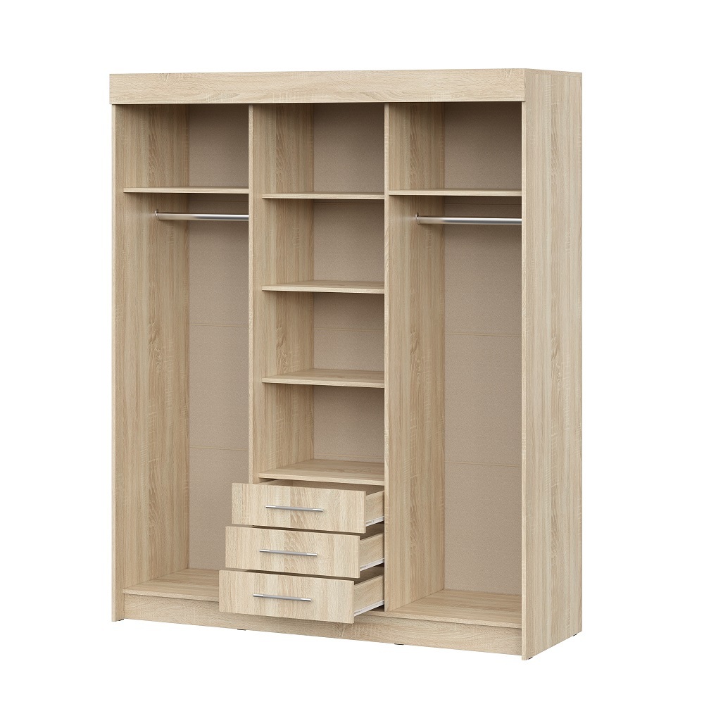 Со шкафом-купе Фортуна Вы организуете продуманное хранение любой одежды: от вещей в сложенном виде до деликатных изделий, которые необходимо хранить на плечиках. Ящики можно использовать для постельного белья, аксессуаров и других личных вещей. Особенности ЛДСП с древесным рисунком ручка – хромированный пластик зеркало с фацетной обработкой края роликовые направляющие на ящиках
