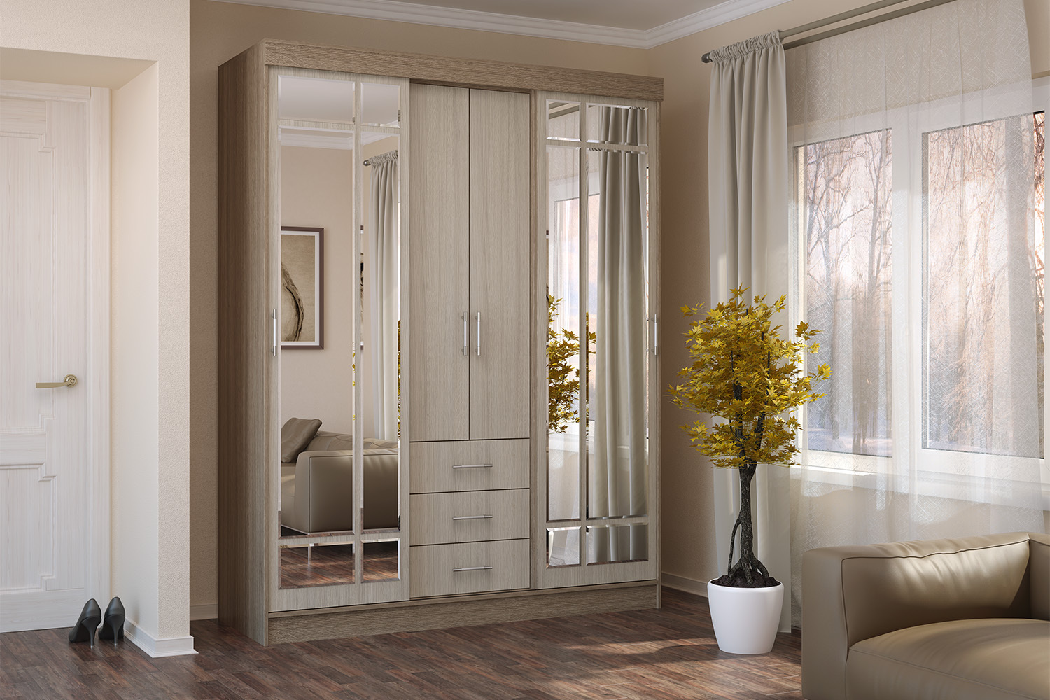 Шкаф-купе Маэстро — это стильное и функциональное решение для вашего интерьера. Его элегантный дизайн и современная отделка создают атмосферу свежести и простора. Этот шкаф оборудован удобными дверцами, зеркалами и выдвижными ящиками.