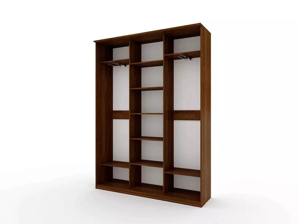 Шкаф оборудован тремя дверцами с фотопечатью, состоит из трех равных секций, в одной из которых 6 полок, а у 2-х других по 2 полки и по 1-ой вешалке для плечиков с одеждой.