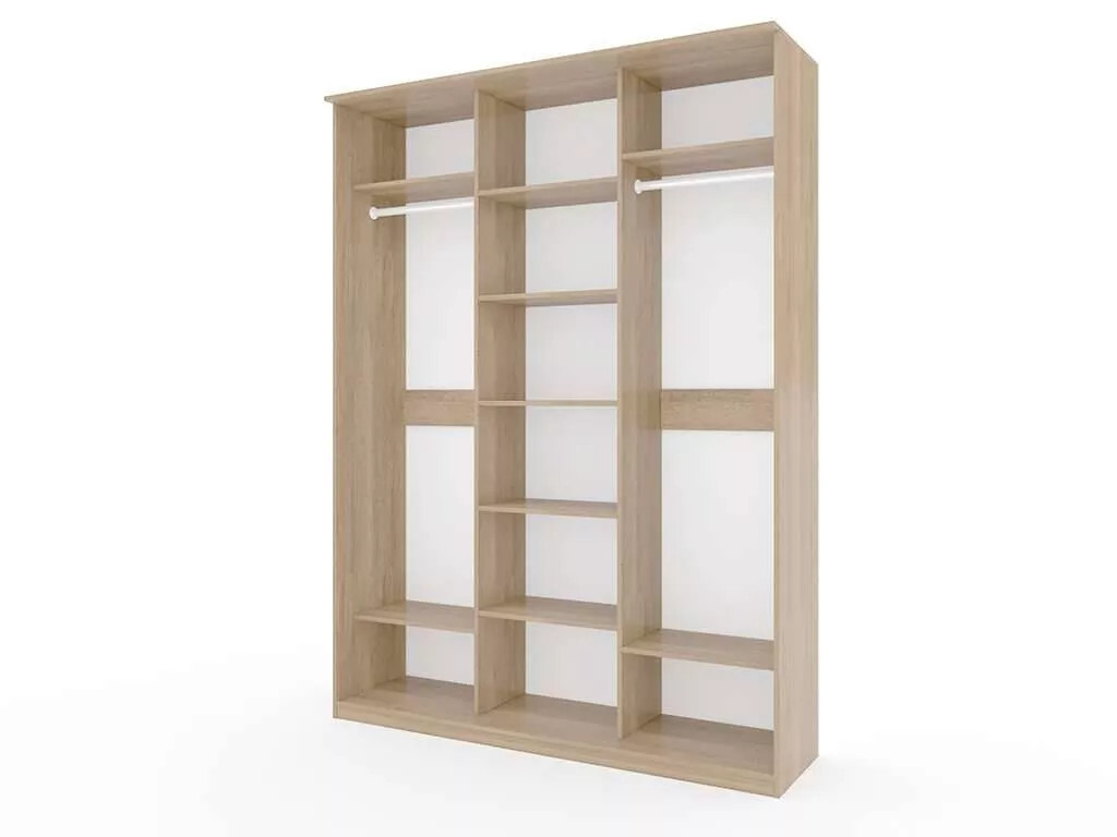 Шкаф оборудован тремя дверцами с зеркалом и украшены стильным пескоструем, состоит из трех равных секций, в одной из которых 6 полок, а у 2-х других по 2 полки и по 1-ой штанге для вешалок с одеждой.