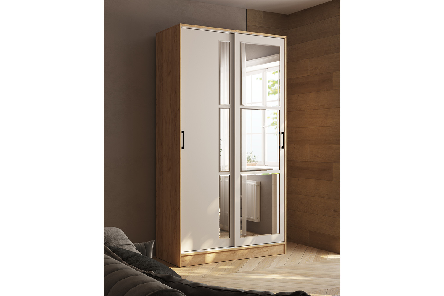 Шкаф-купе Стиль-2 является великолепным решением не только для эргономичного использования места для обстановки комнаты, но и станет эффектной деталью интерьера спальной комнаты, гостиной или прихожей. Он позволит организовать хранение вещей и одежды, одновременно преображая пространство, позволяя выглядеть более светлым и свободным, благодаря шикарным зеркальным панелям.